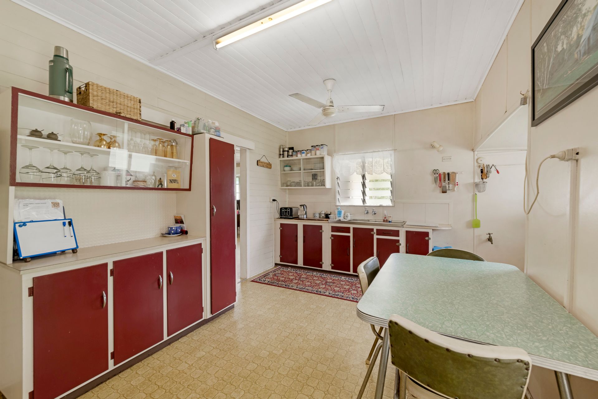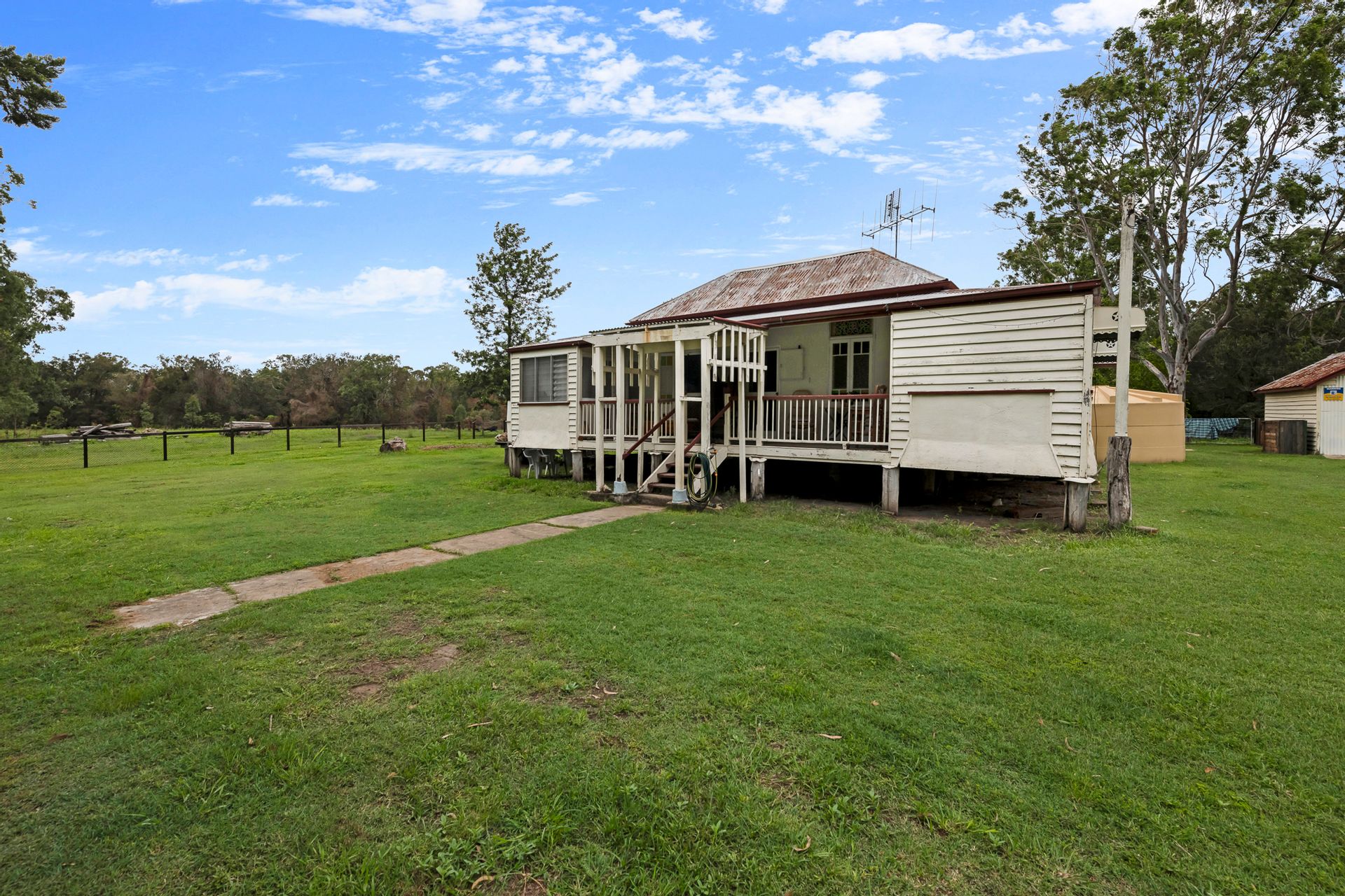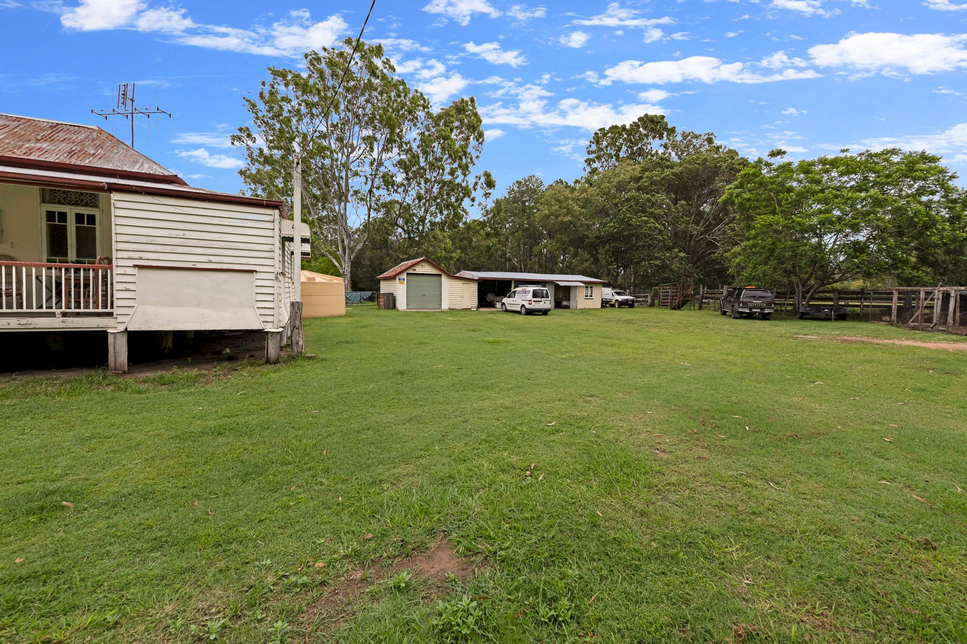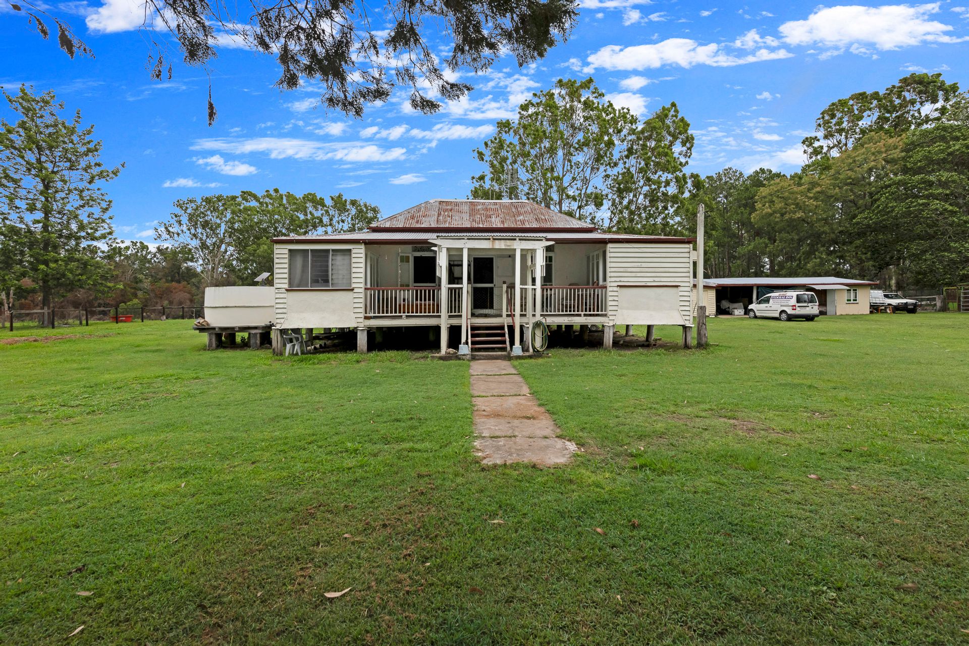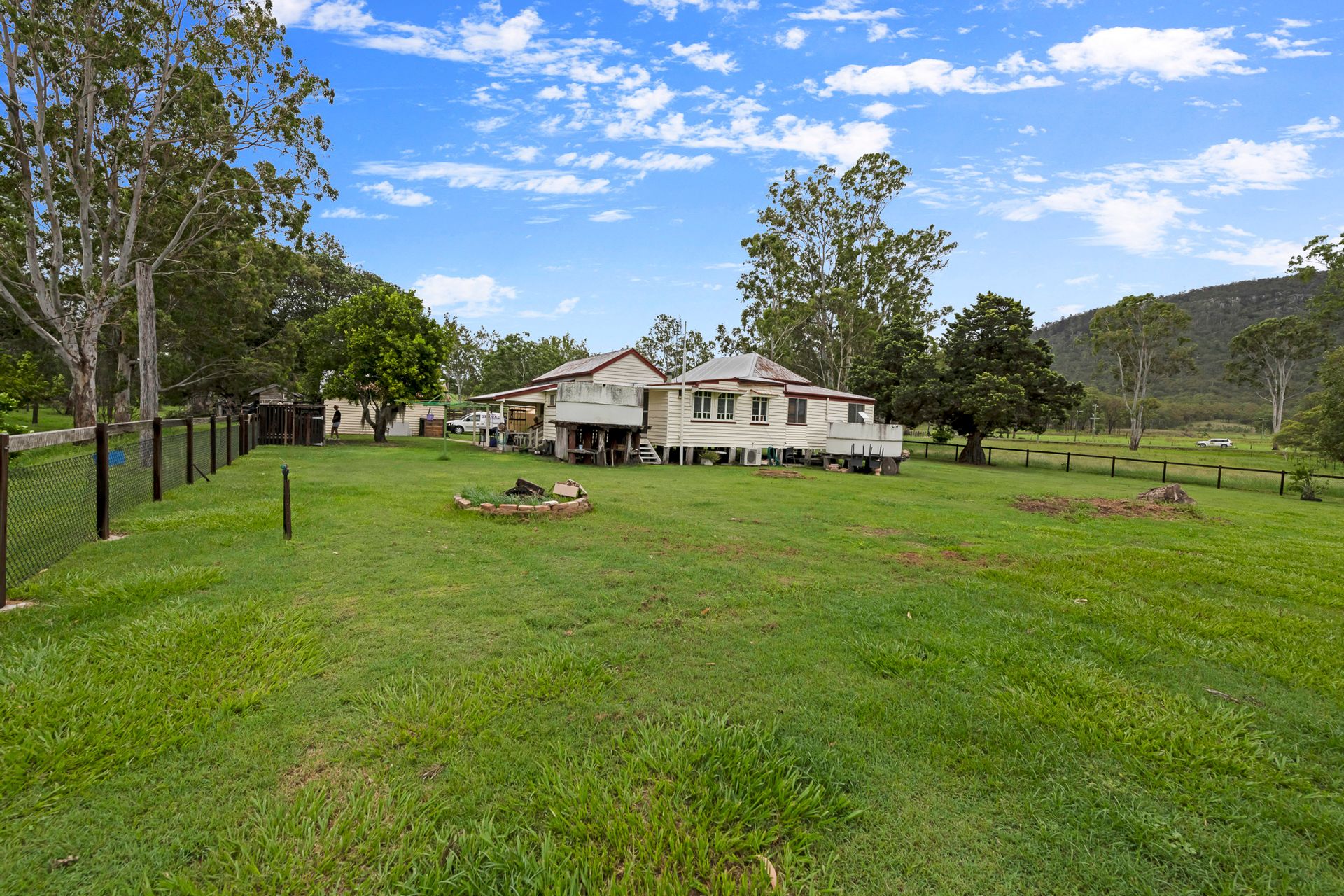 The centerpiece of this property is the beautiful old Queenslander home, whilst requiring some work to bring her back to her full glory, she is brimming with charm and awaiting your personalised touch. Enjoy the veranda at the front overlooking Mount Perry, high ceilings in the living and main bedroom, and exquisite details such as breezeway fretwork, hoop pine floors, and stained-glass casement windows and french doors throughout.