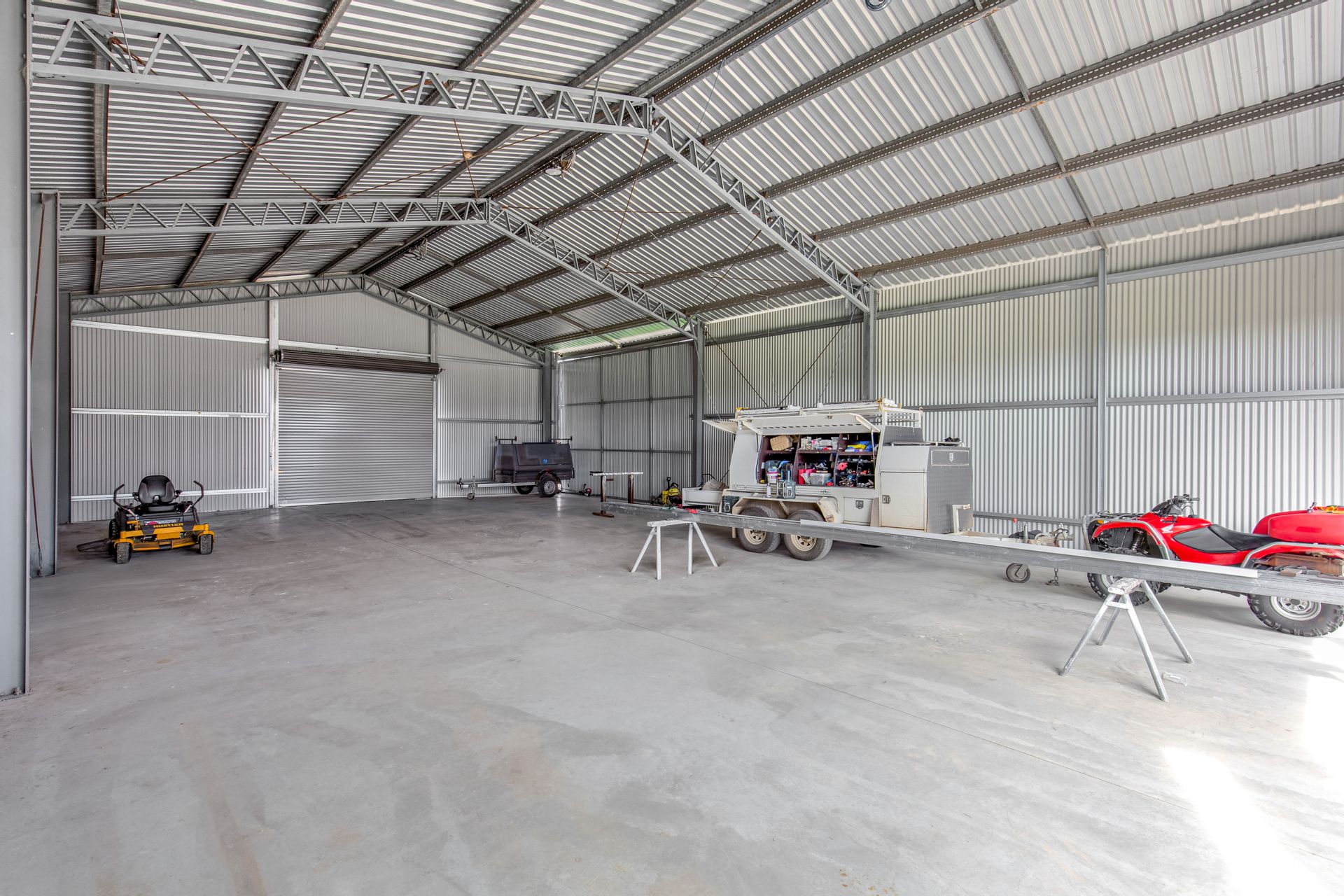colour bond sheeting. 3 Phase power connected with 3 x high voltage lights and power points, double front roller doors 3.6m plus 1 x rear roller door plus side sliding door 7m x 4.9m. Rear concrete pad and side aprons plus 2 x 5000 gallon poly tanks with pressure pump plus external power point.