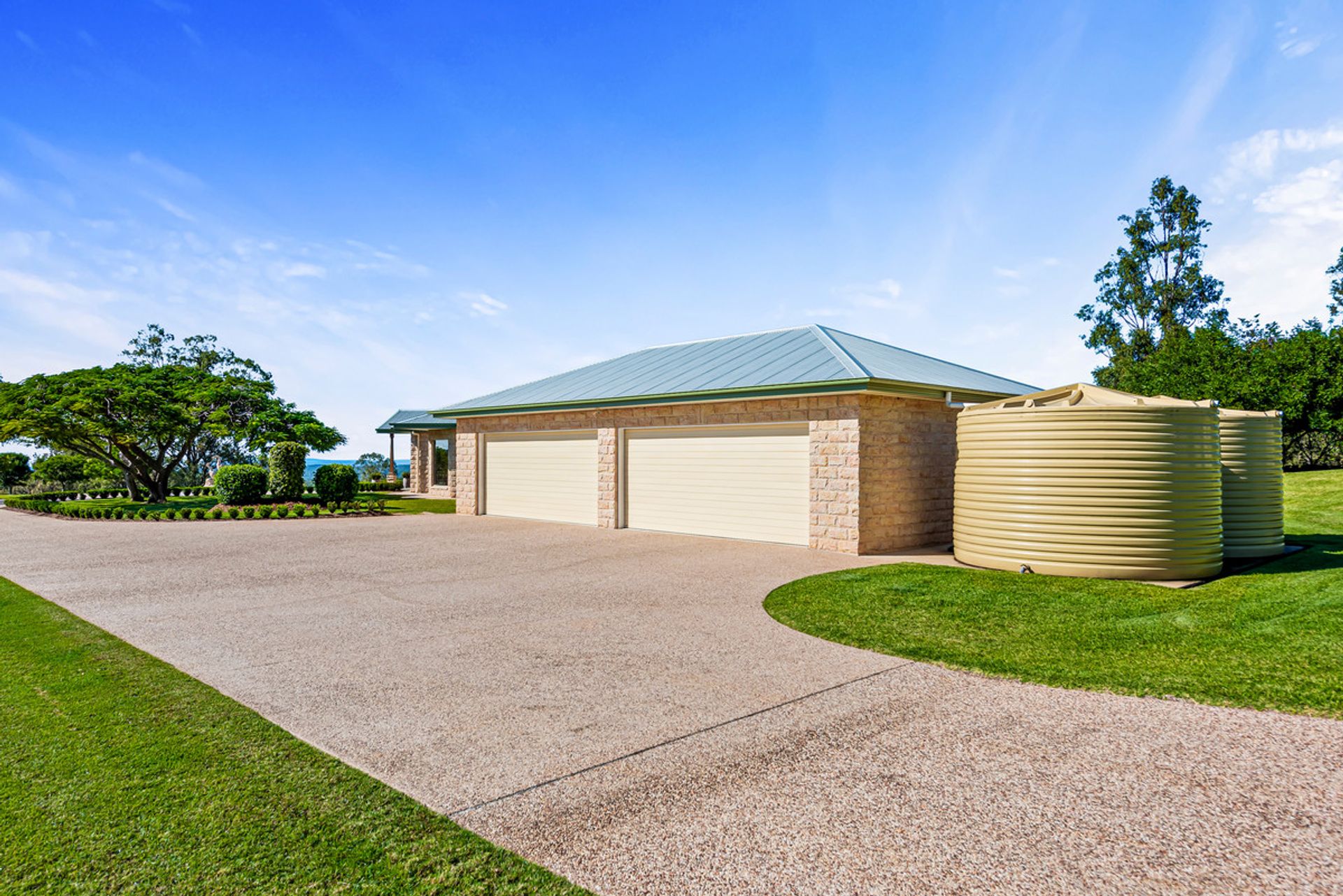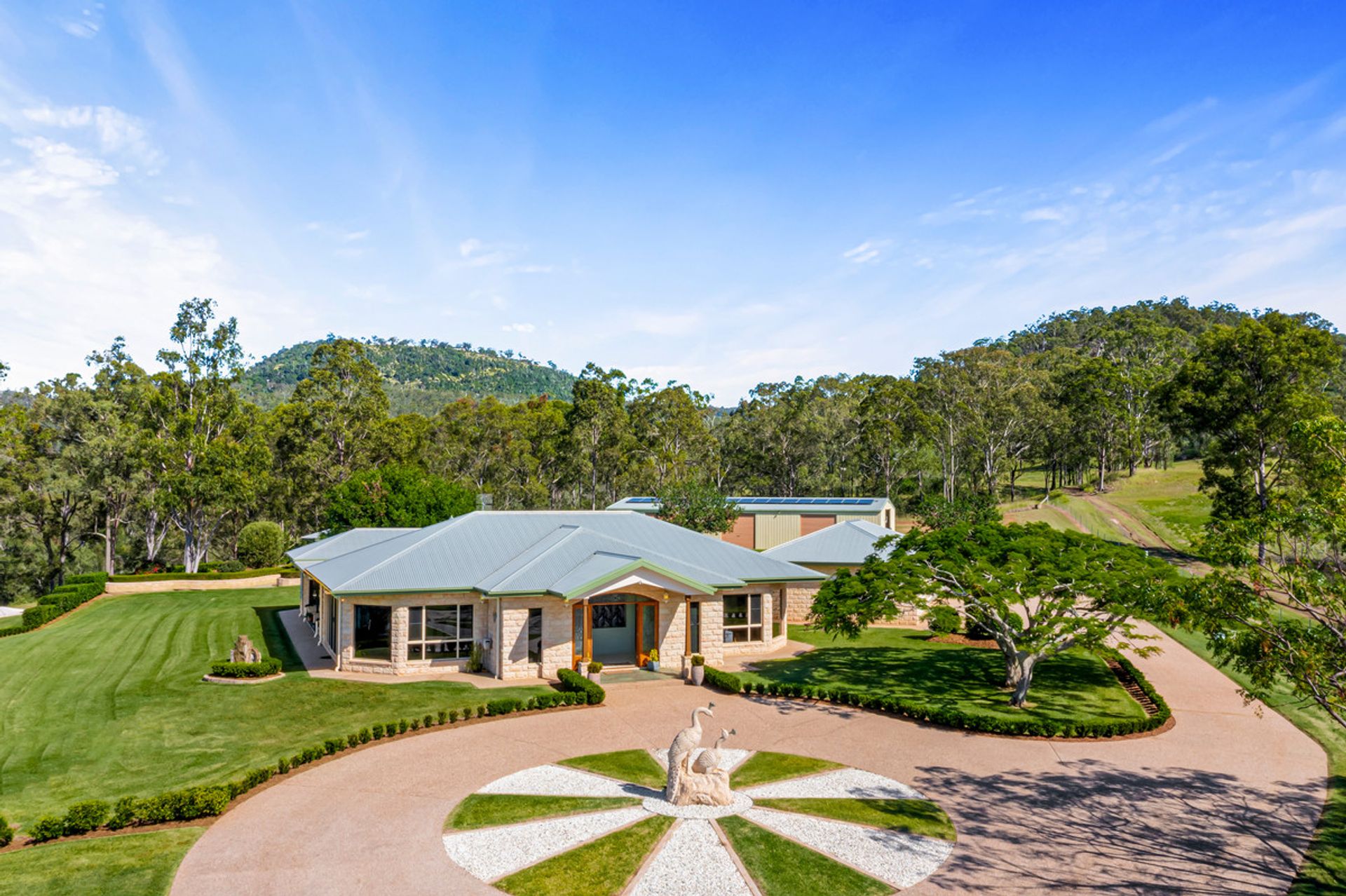 - Tree lined driveway with grand circular entrance featuring a Wagners yellow granite statue plus stone water feature adjacent to the dining room overlooking the panoramic views