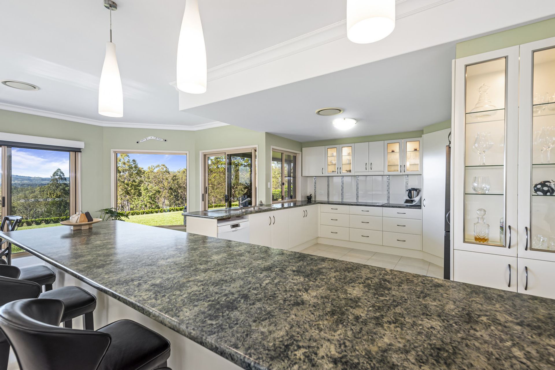 - Enormous kitchen with ample cupboard space, quality electric appliances, dishwasher, light up display cabinetry, window servery, water filtration system and large island bench