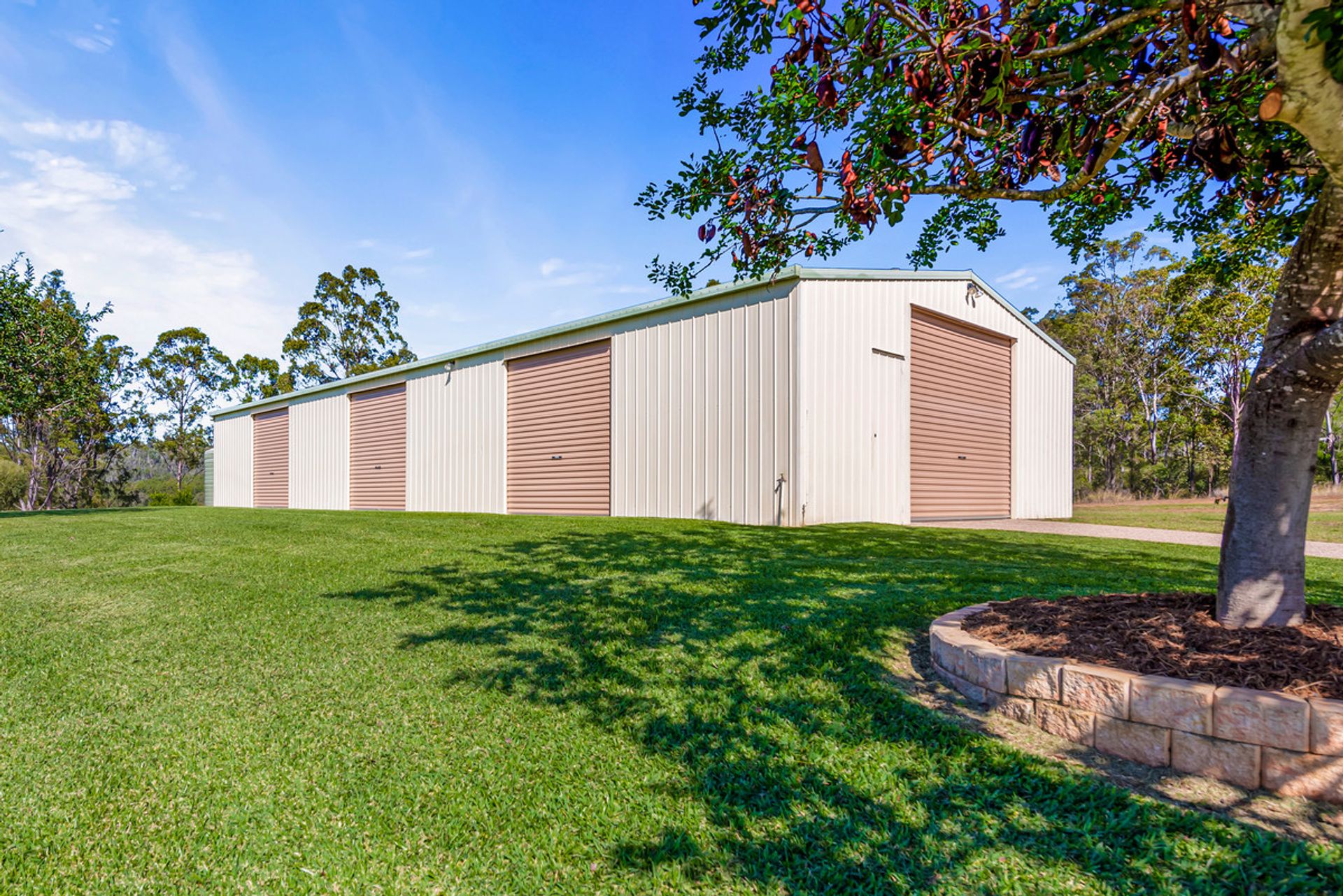- 21.4mx9m shed with built in shelving and 6 roller doors – two automatic – one high clearance door for caravans
