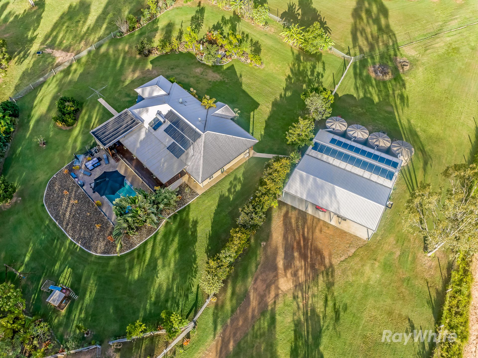 For those with a green thumb, the property features a garden shed, feed shed, and a water bore with an electric pump for maintaining the gardens. An automatic watering system keeps the established gardens lush and vibrant. The irrigated 40-tree orchard includes mangos, grapefruit, blood grapefruit, oranges, mandarins, lemon, lime, and avocado trees. Additional fruit trees on the property include bananas, mulberry, dragon fruit, dwarf peach quince, sapote, chestnut, and macadamia.