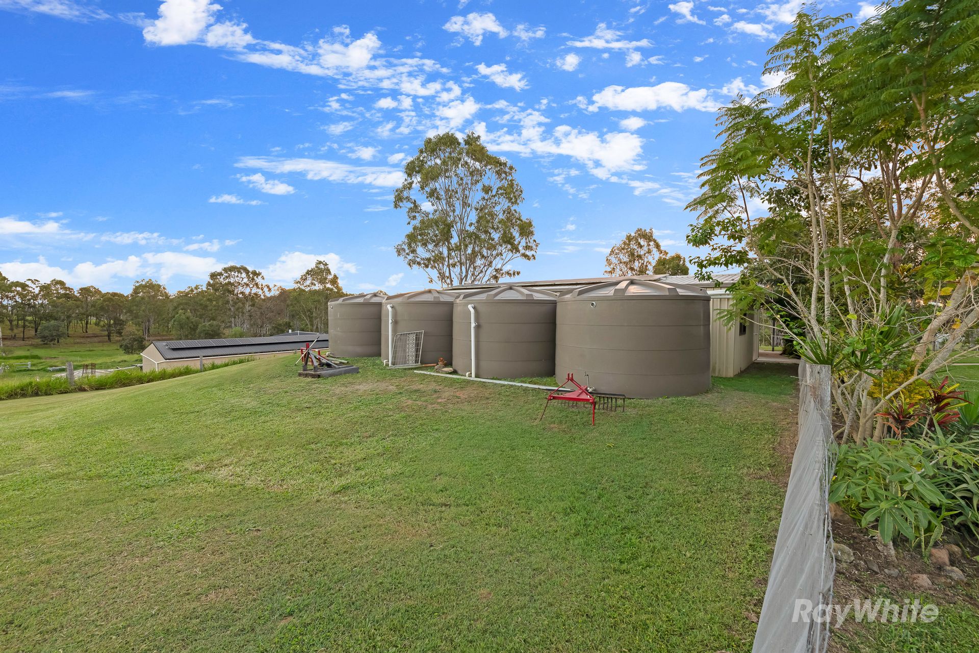 - 4 Bay Garage with Concrete Floor, Power, Lights, Whirly Birds & 4 x 27,000L Rainwater Tanks
