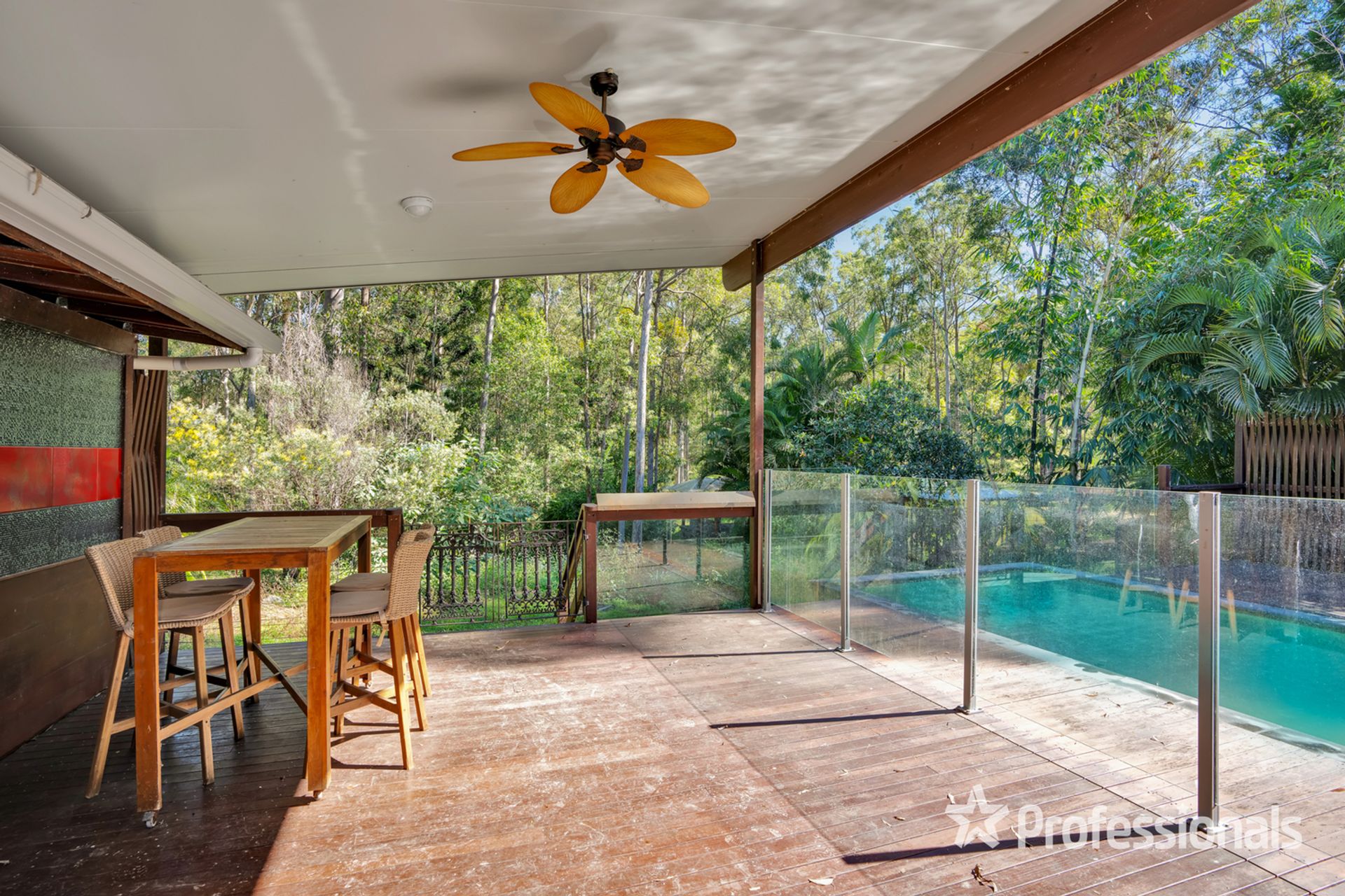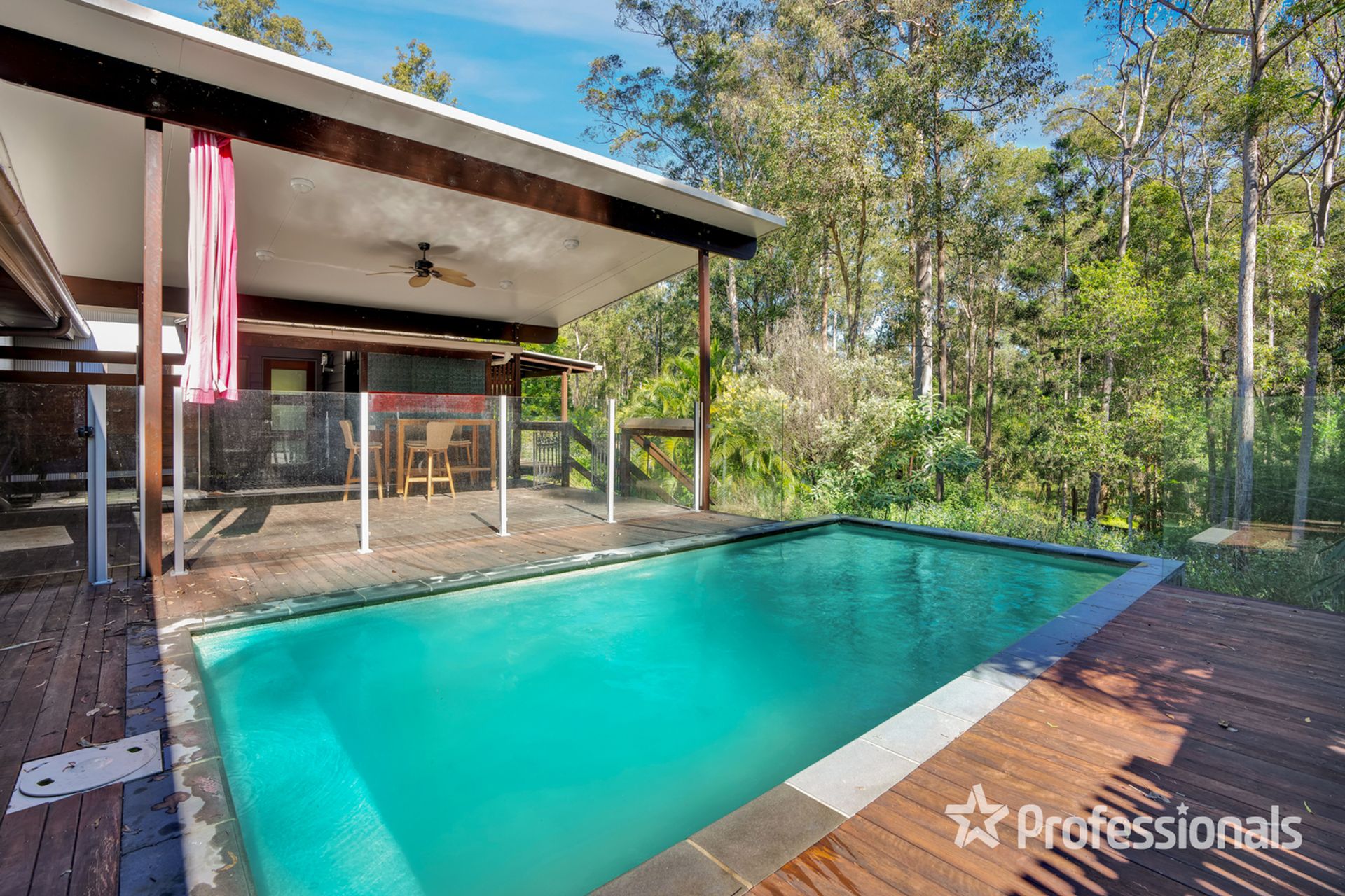 • Private rear back deck with featured inground infinity edged style pool, outdoor shower