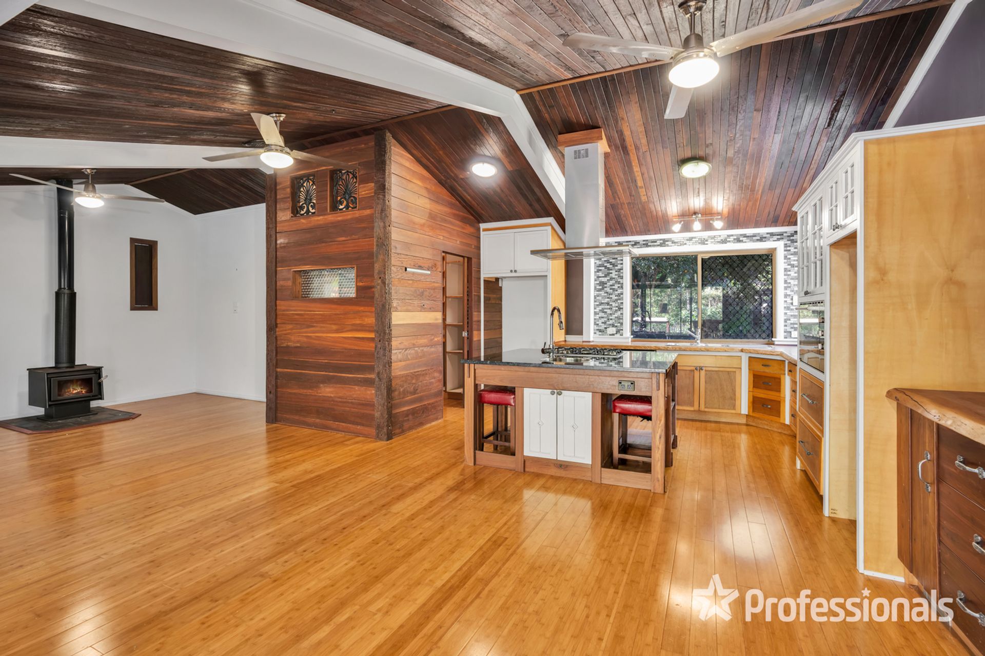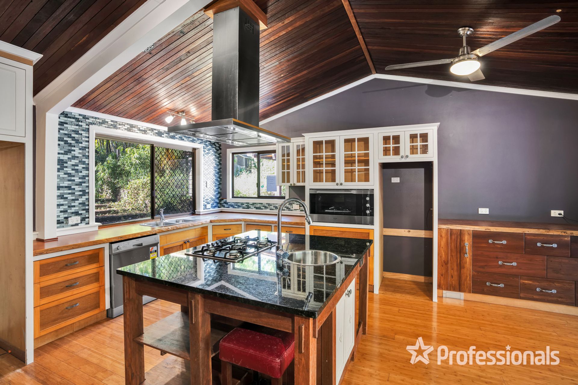 • Timbered kitchen with stainless steel dishwasher & wall oven, central island bench with 5 burner gas cooktop and second sink, pantry, bench and storage space