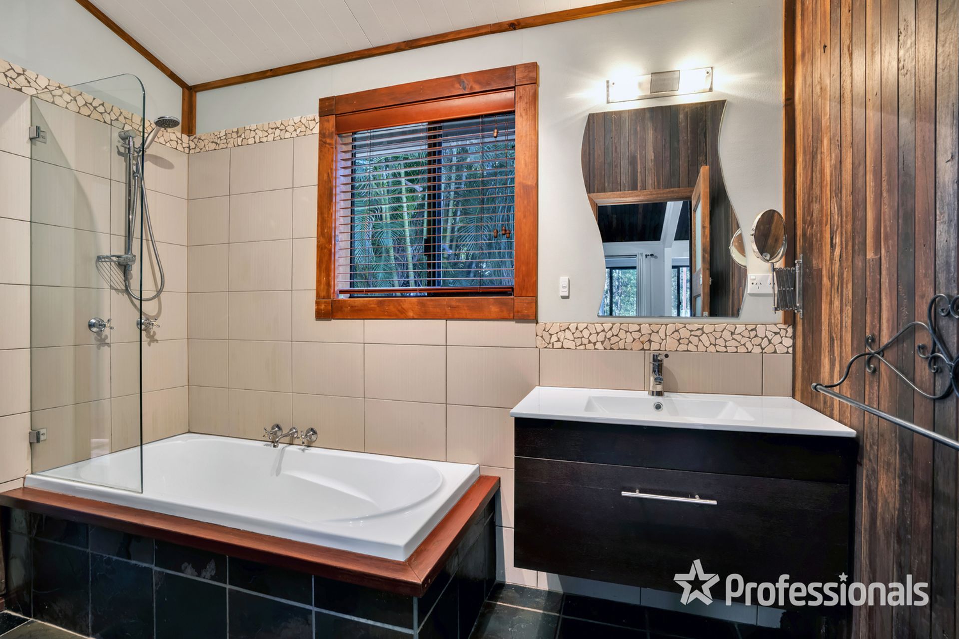 • Air-conditioned 3rd bedroom with built in and 2-way ensuite bathroom with slate floor, shower/bath combo, vanity and toilet