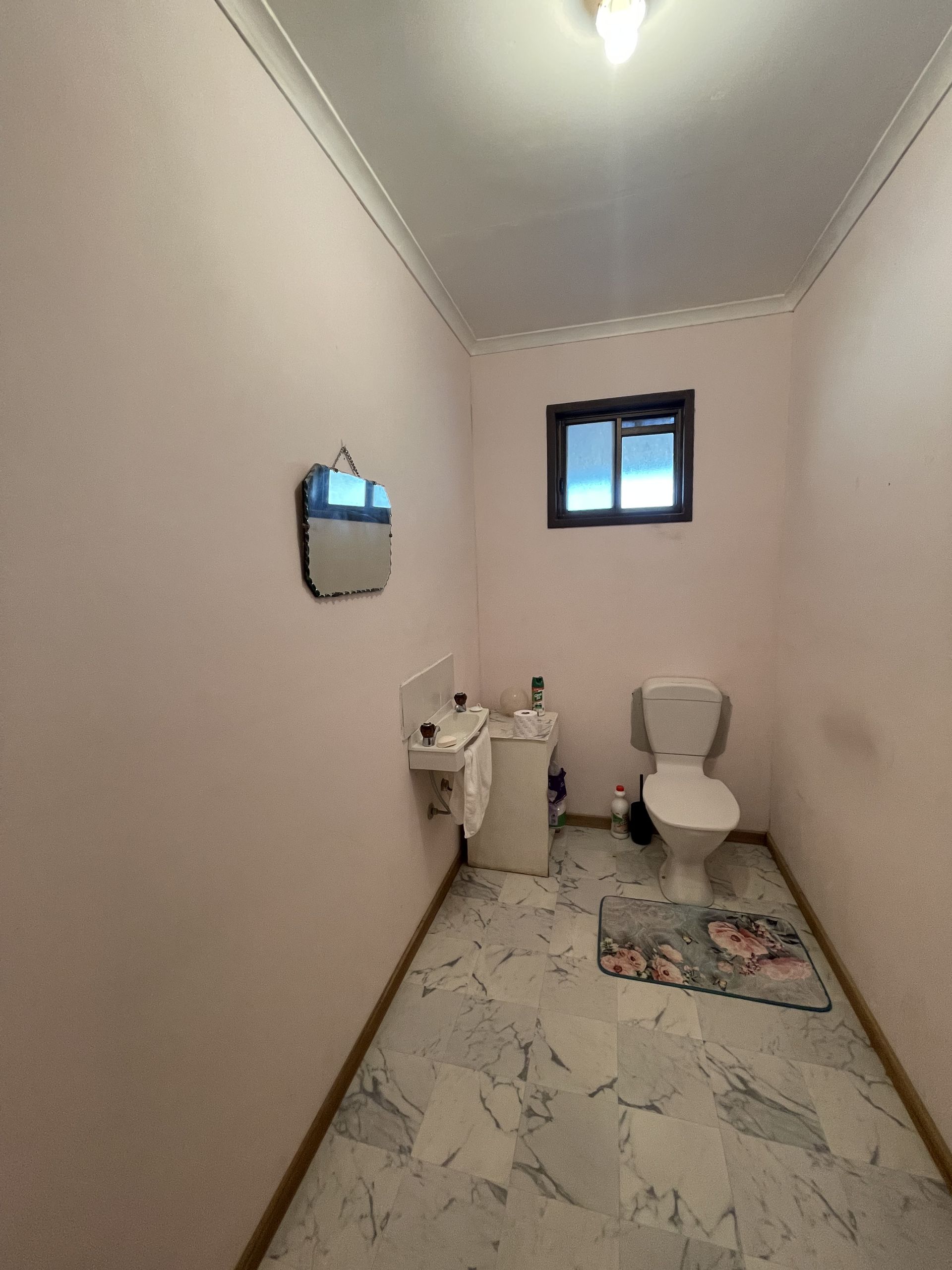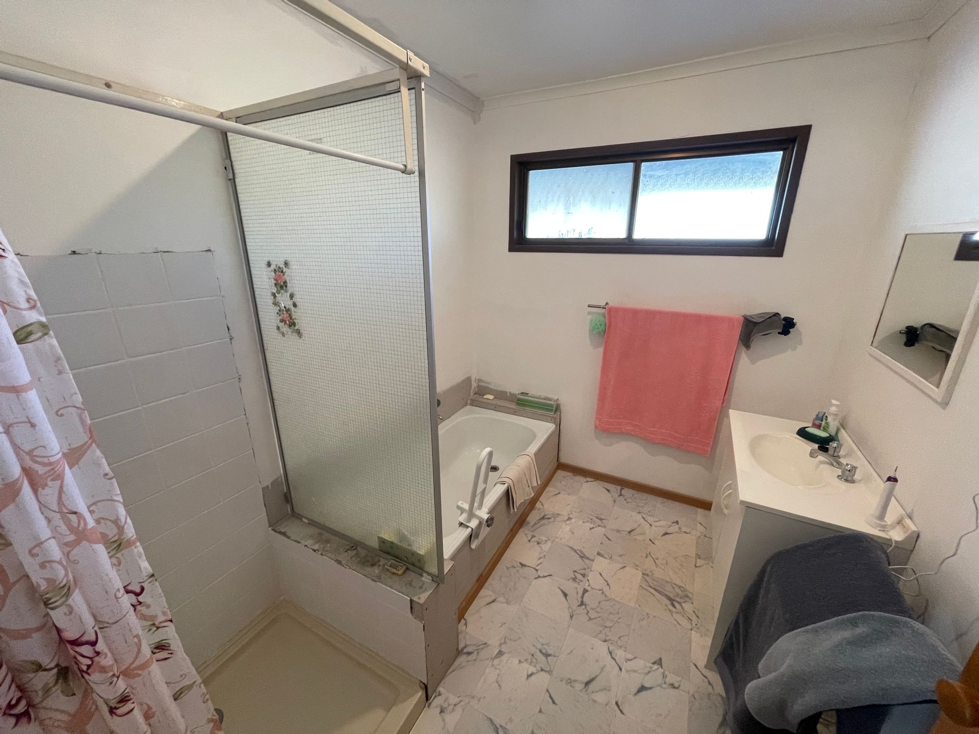 Bathroom with bath, shower and basin, next to a large seperate toilet. Wet areas are completed with laundry with outside back access.