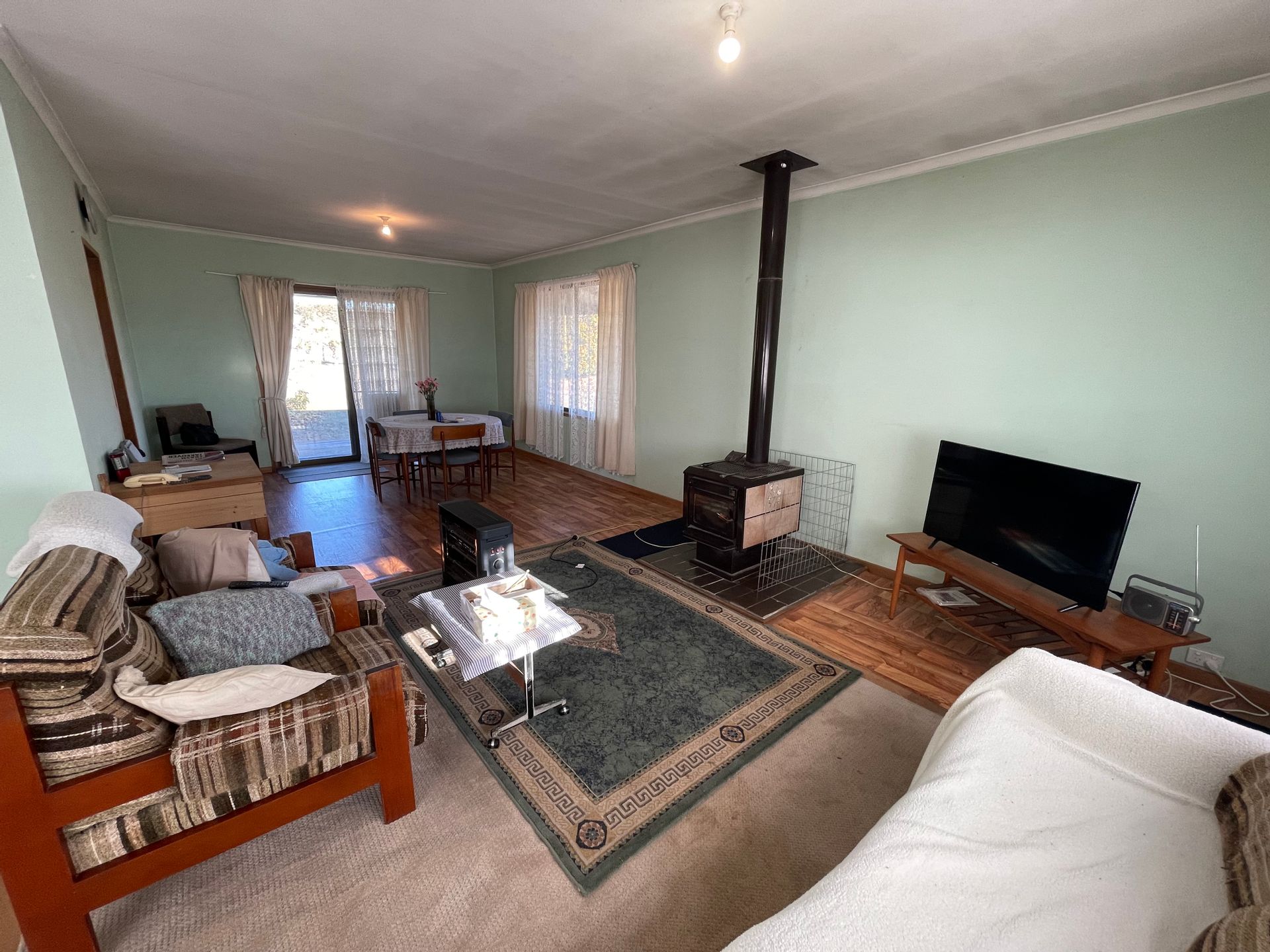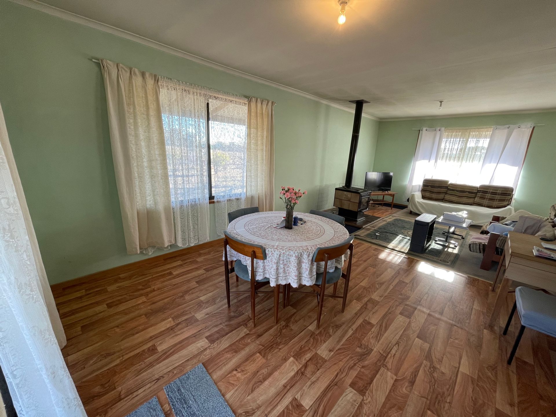 The other end of the home is the kitchen which opens into a dining & lounge area. Lovely open living plan again with more great windows and a floor to ceiling door leading out onto the verandah which surrounds the home. The living area has a wood combustion heater for your comfort.