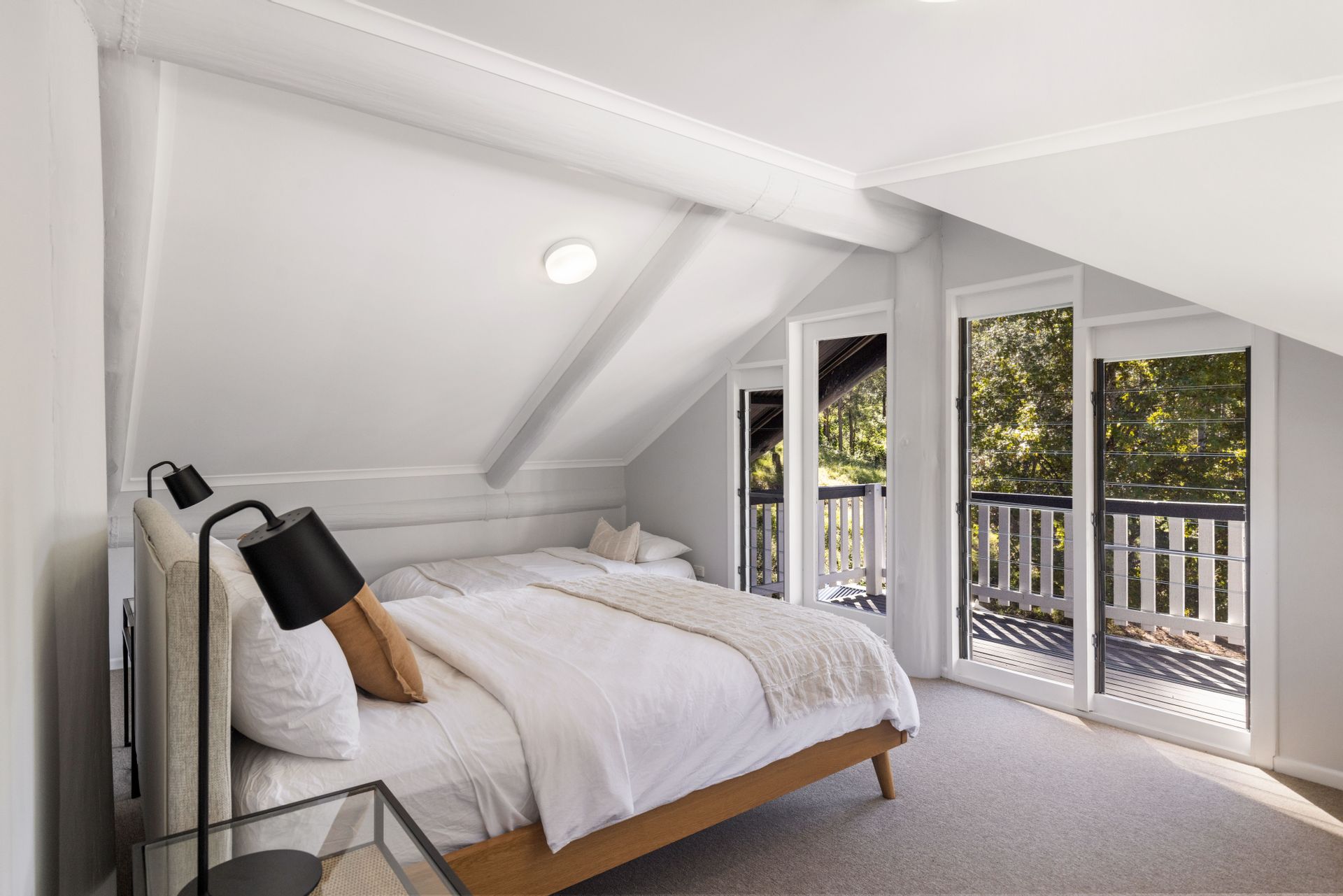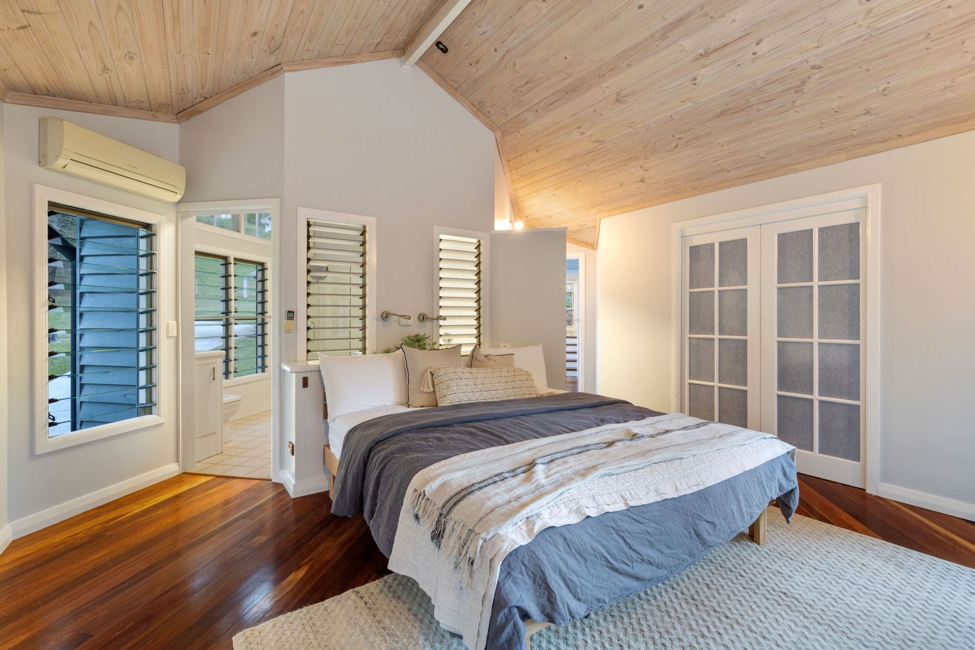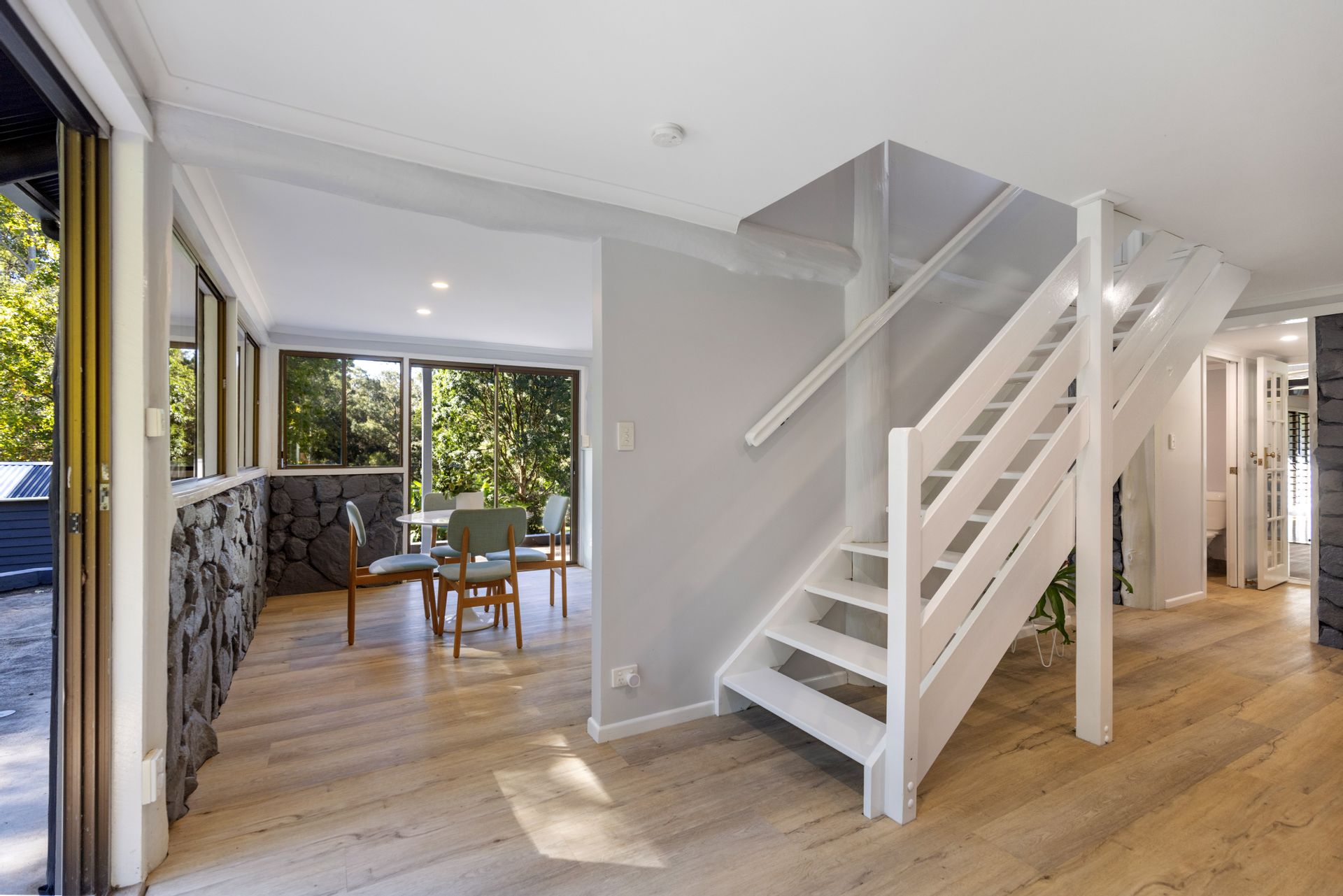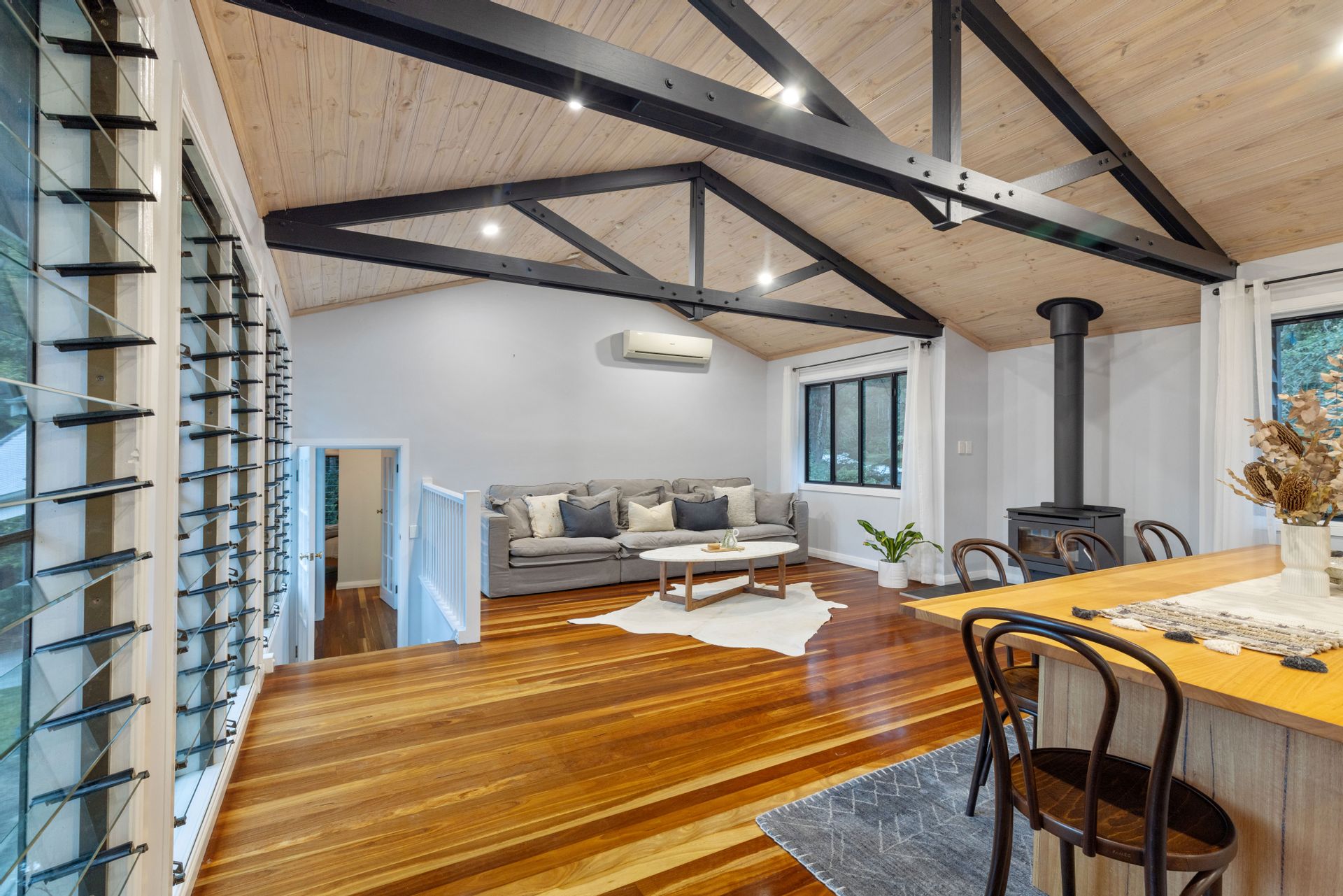 The heart of "Tallowwood" is a beautifully appointed three-bedroom home, thoughtfully designed across three levels to maximize comfort and space. Polished timber floors, exposed beam ceilings, and louvre windows create a light-filled and airy ambiance. The spacious lounge, complete with air-conditioning and a cozy fireplace, opens to a gourmet kitchen equipped with high-quality appliances. Step outside to an expansive entertainer's balcony, perfect for alfresco dining against the backdrop of stunning bushland vistas.