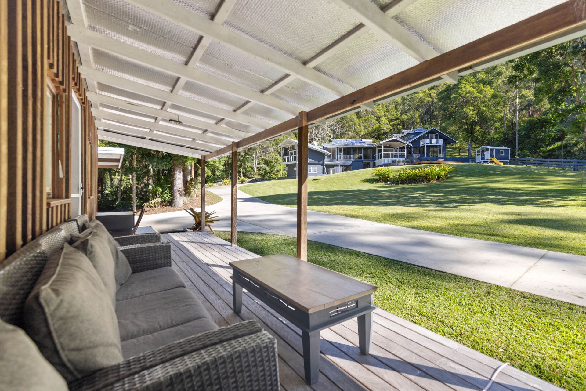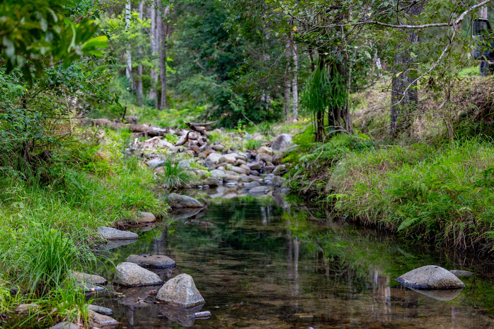 As you traverse the end of Broken Bridge Road, a charming yet grand entry (1km) guides you through a lush, green corridor teeming with native wildlife and the soothing sounds of birdsong and a babbling creek. This serene drive culminates in a spectacular arrival at your homestead, offering an immediate sense of calm and connection to nature.