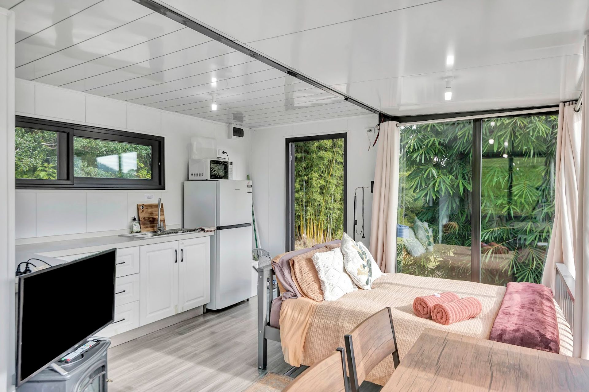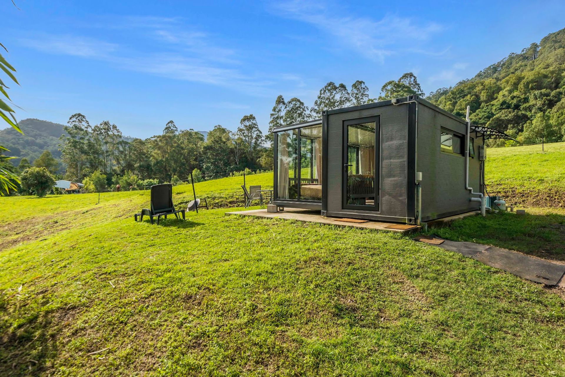 And just a little further, is the Glass House Studio which is in arguably the best spot out of the structures. It is a small insulated structure with an amazing outlook. Everything inside is new and as it is built on a chassis, it does not require council approval.