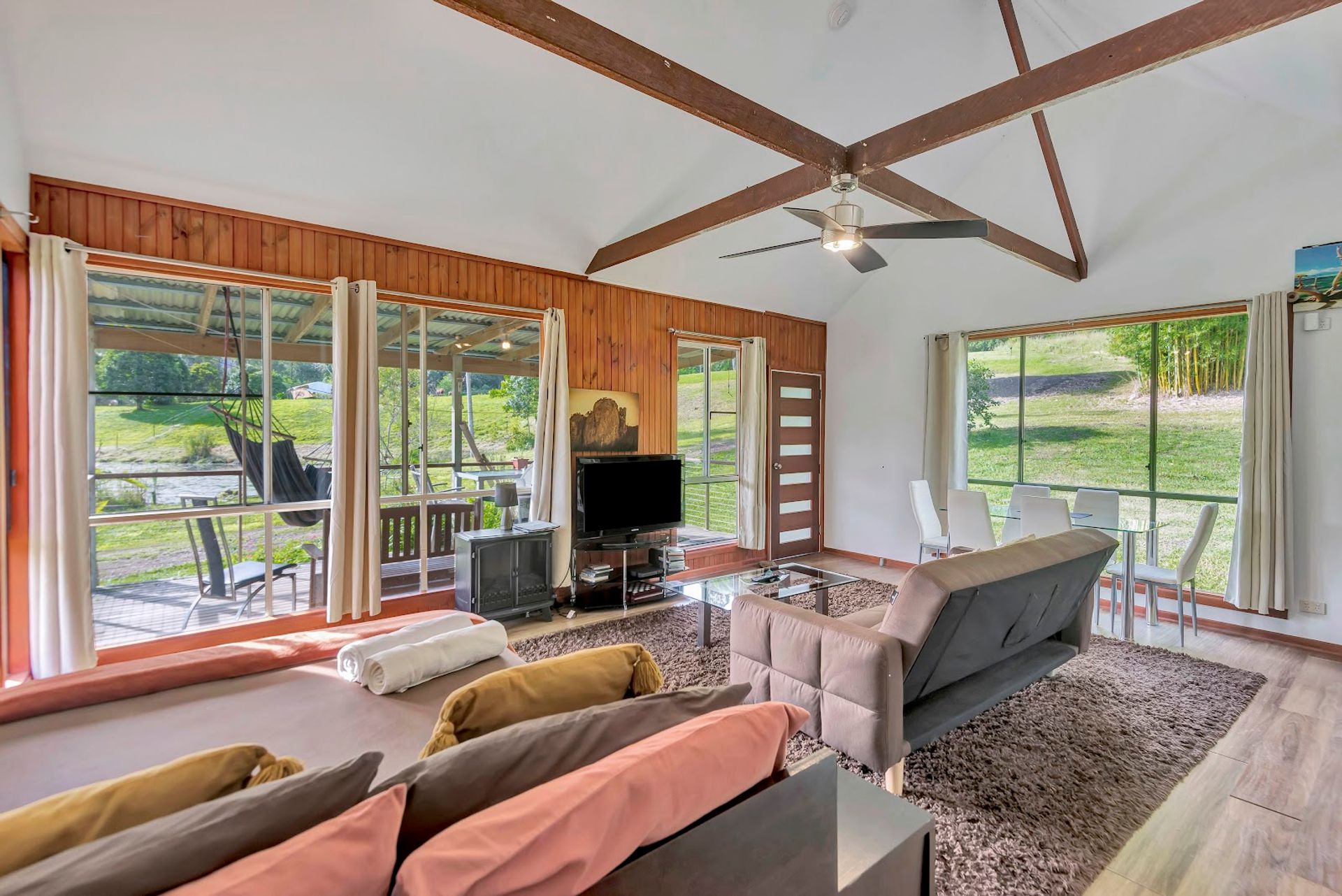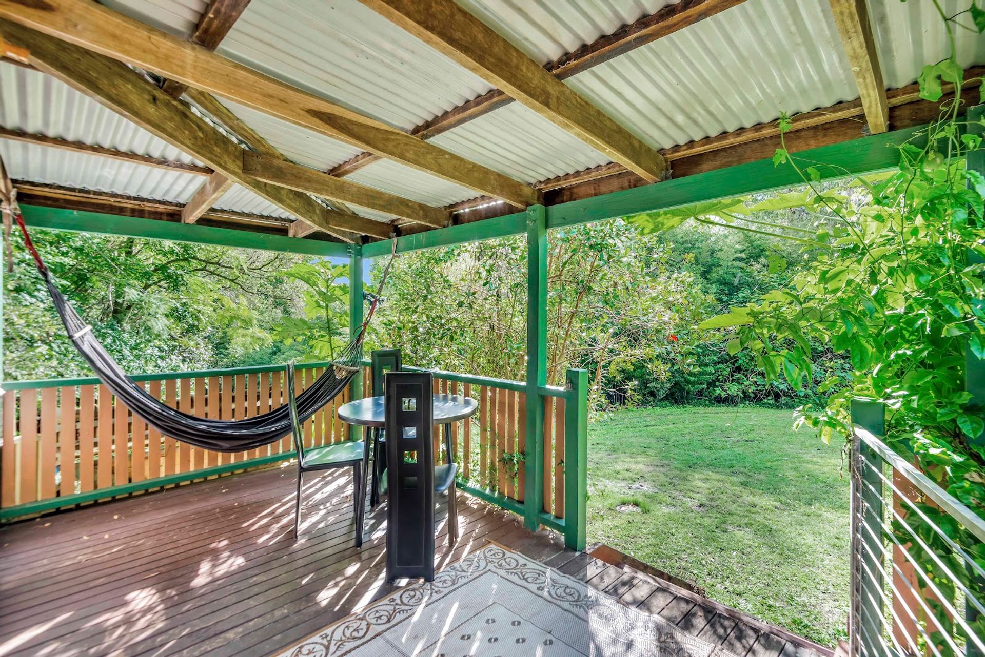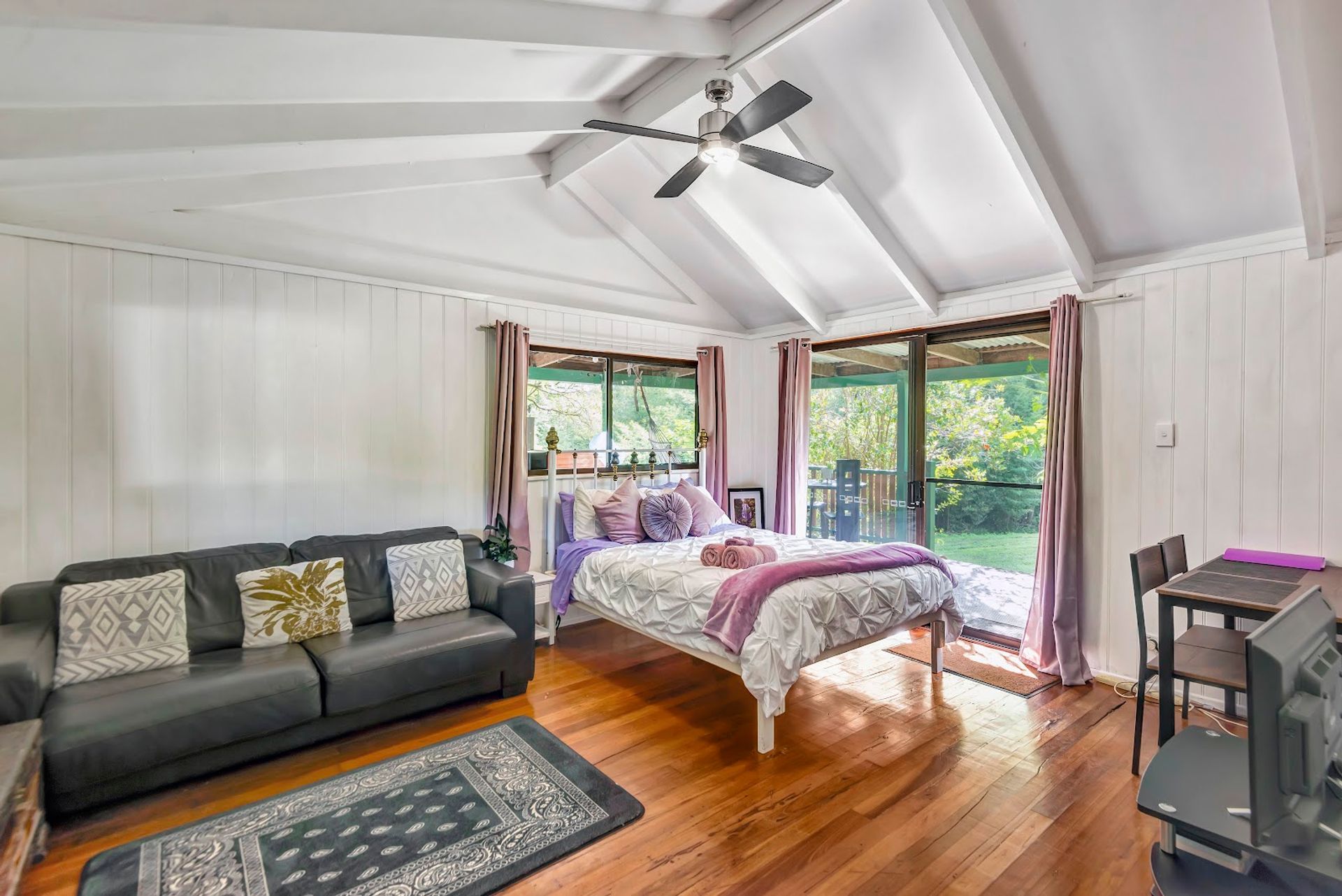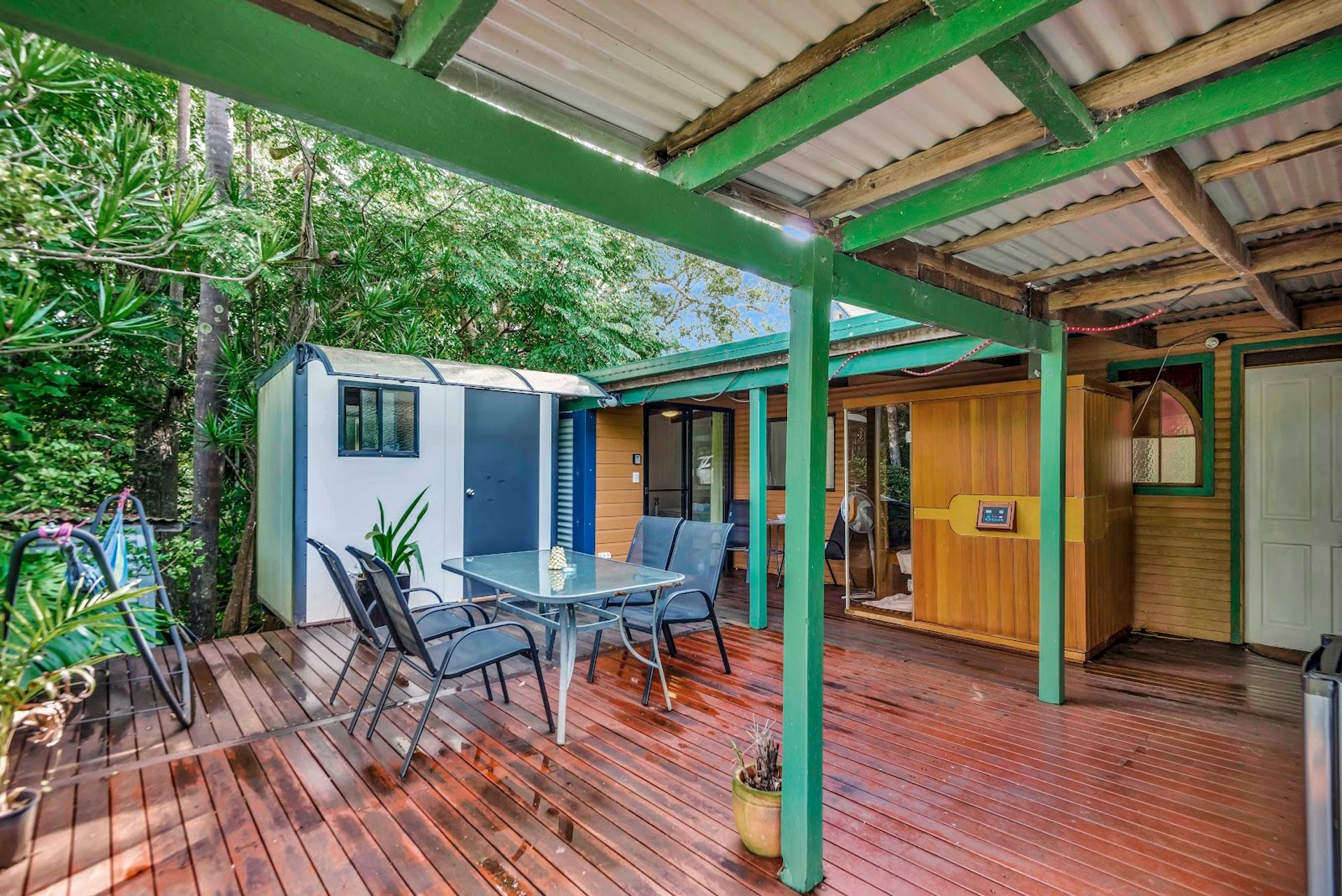 The timber home was built circa 1950's and is currently divided so that guests can hire 2 x individual rooms while the owner enjoys the larger portion. The rooms both have their own verandahs and kitchenettes. It features timber floor boards in parts, a wood heater, A/C, exposed timber beams & VJ panels in parts. On the deck, there is an infrared sauna for guests & yourself to enjoy.