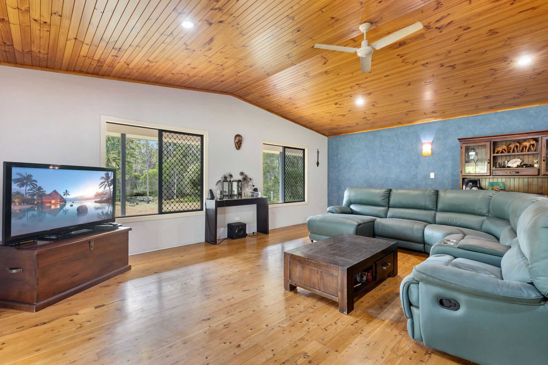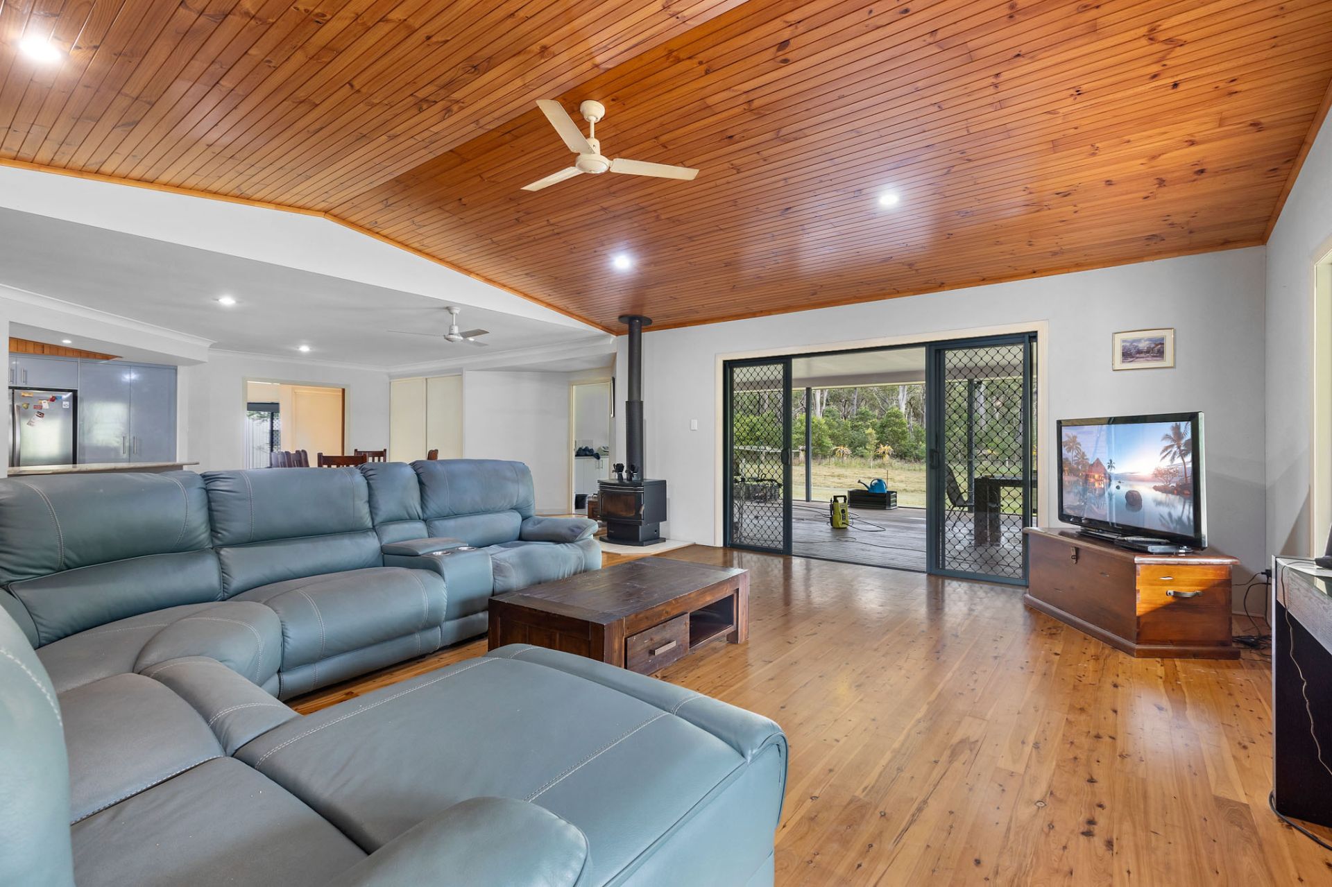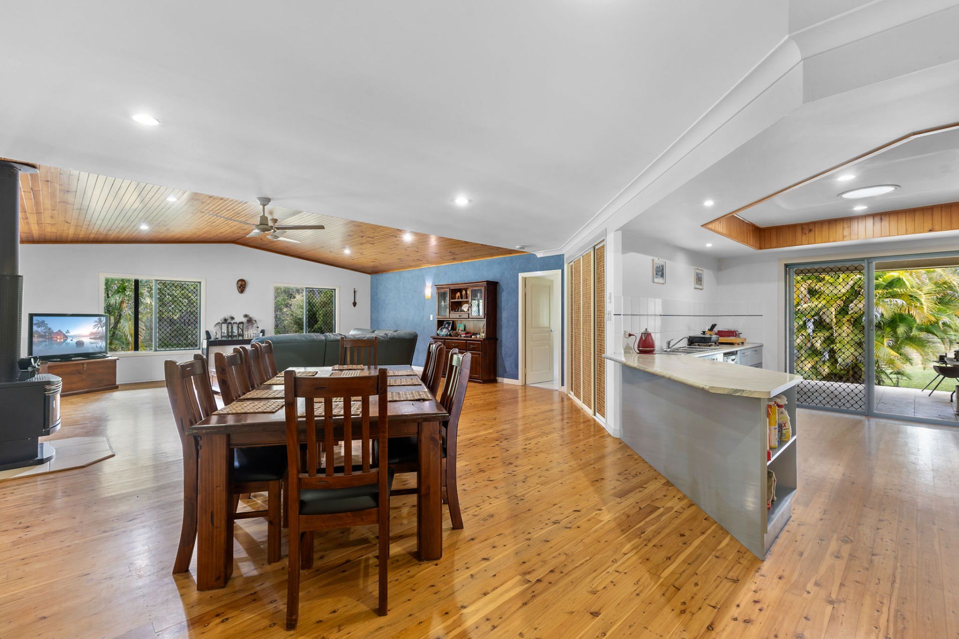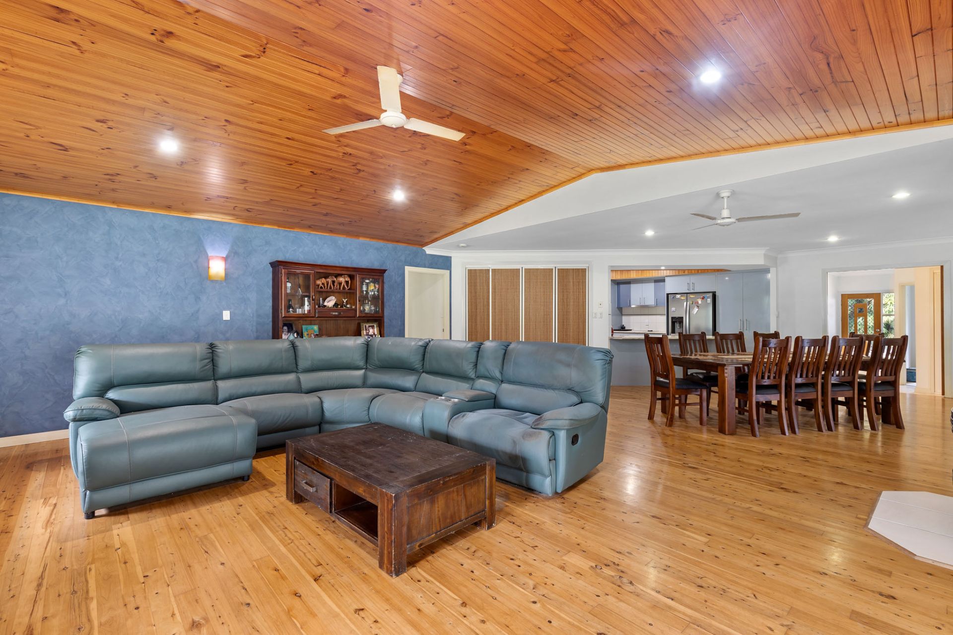 - Open plan living and dining area with timber-lined vaulted ceilings