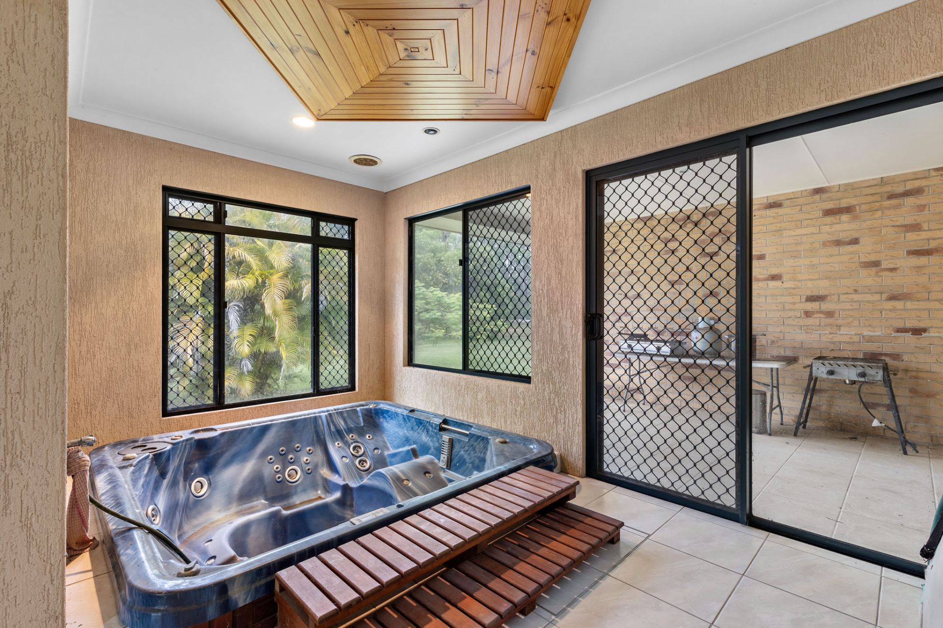 - Sunken 8-person indoor spa with alfresco patio access