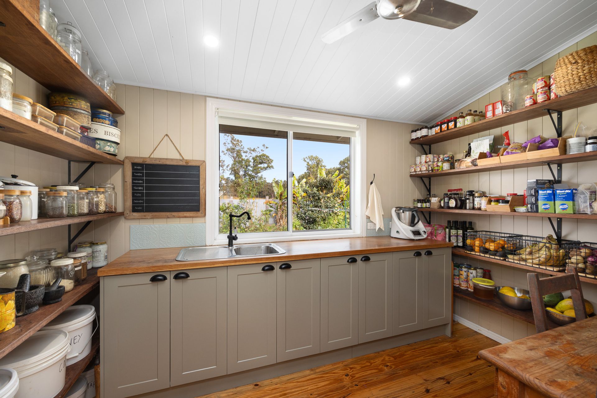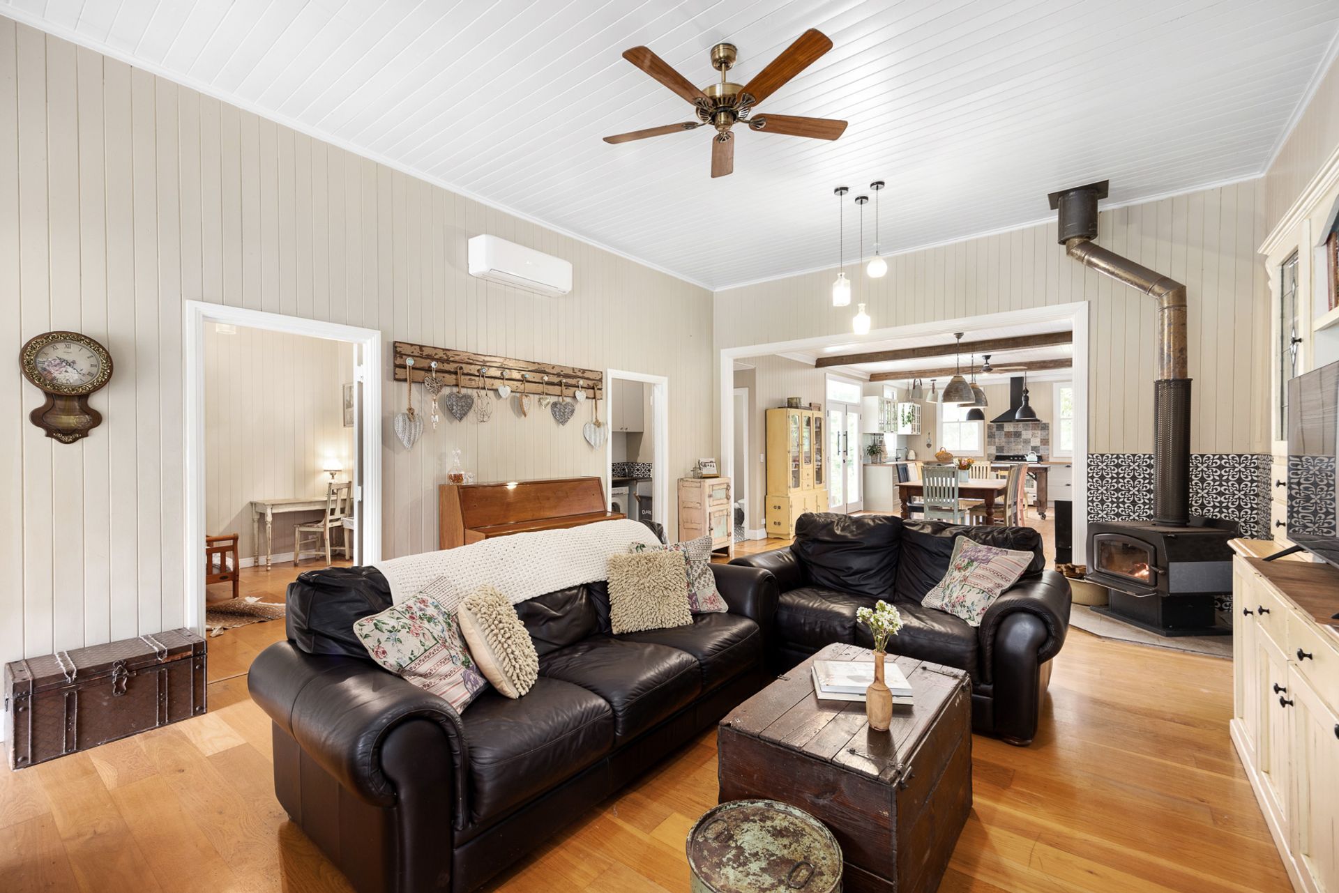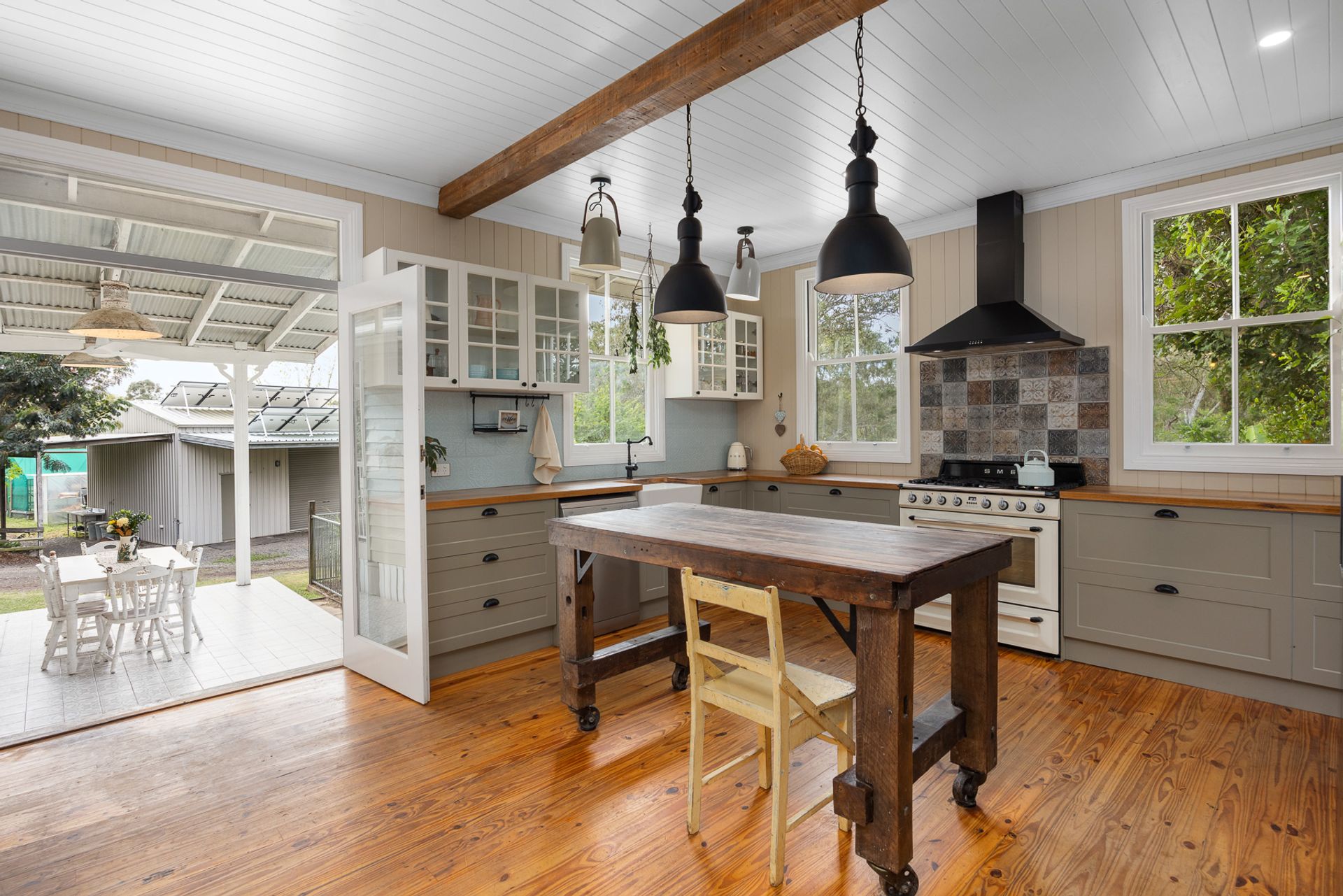 Through the main living area, with its cozy wood-burning fire, rustic hanging lights, and stunning exposed timber beams, you can see the open plan farmhouse-style kitchen. You know instantly that this will be the hub of family gatherings you'll enjoy for years to come. The spacious kitchen, with Smeg Dual Fuel Oven, rangehood, dishwasher, large porcelain sink, wooden benchtops and a separate stylish butler's pantry are any host's dream for meal preparation and entertaining. Just imagine your family gathered around the table, enjoying delicious meals and creating lasting memories.