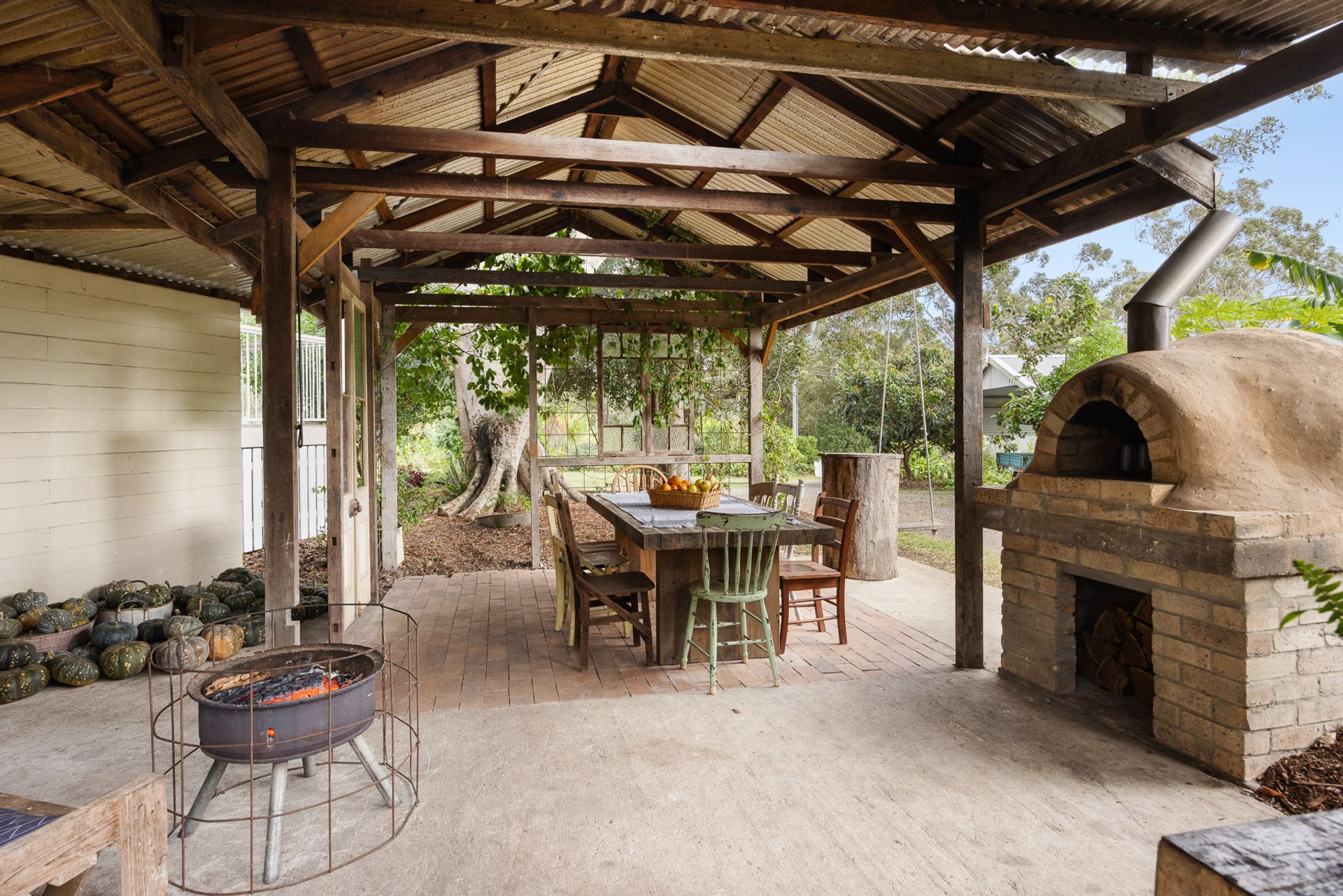The outdoor areas surrounding the home are designed for relaxation and enjoyment. The covered back patio overlooks a sparkling inground pool and outdoor bathtub, ideal for summer fun. There is a rustic picnic hut, with handcrafted wood-fired pizza oven -- another ideal spot for family meals and entertaining guests. Additionally, the property includes "The Barn" -- a charming historic structure with a tin roof and exposed beams, previously used as a coffee stop. The barn exudes character, has separate frontage from the street, and offers a unique space for potential business opportunities or creative endeavours.
