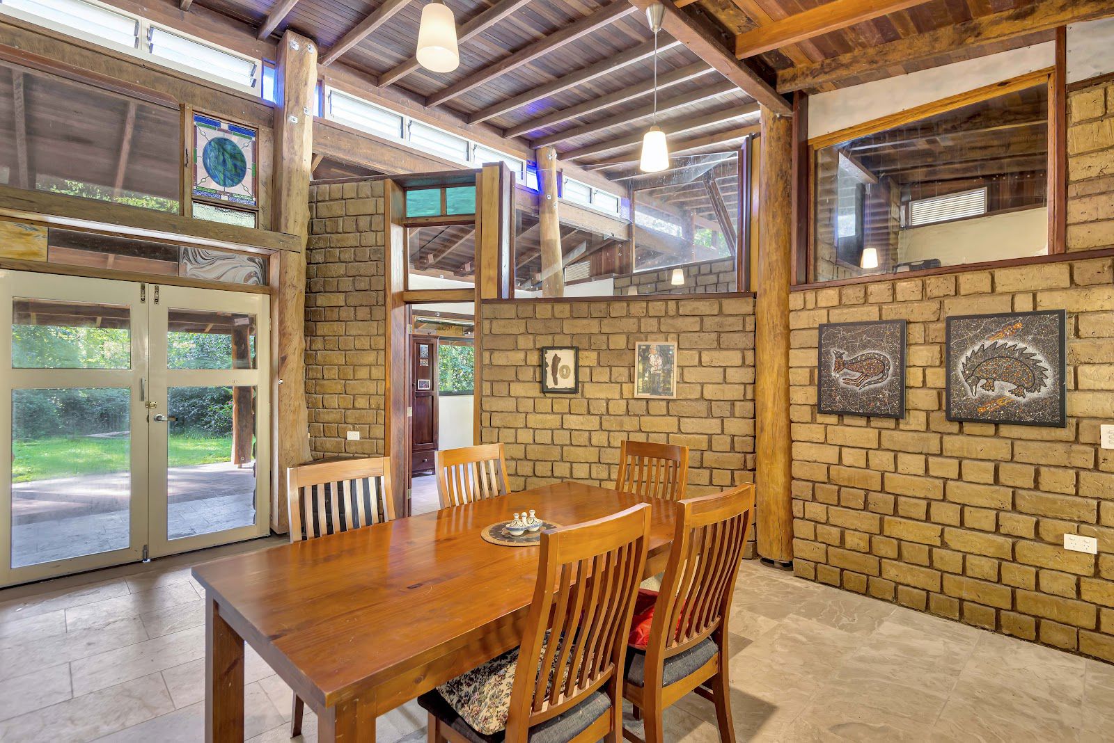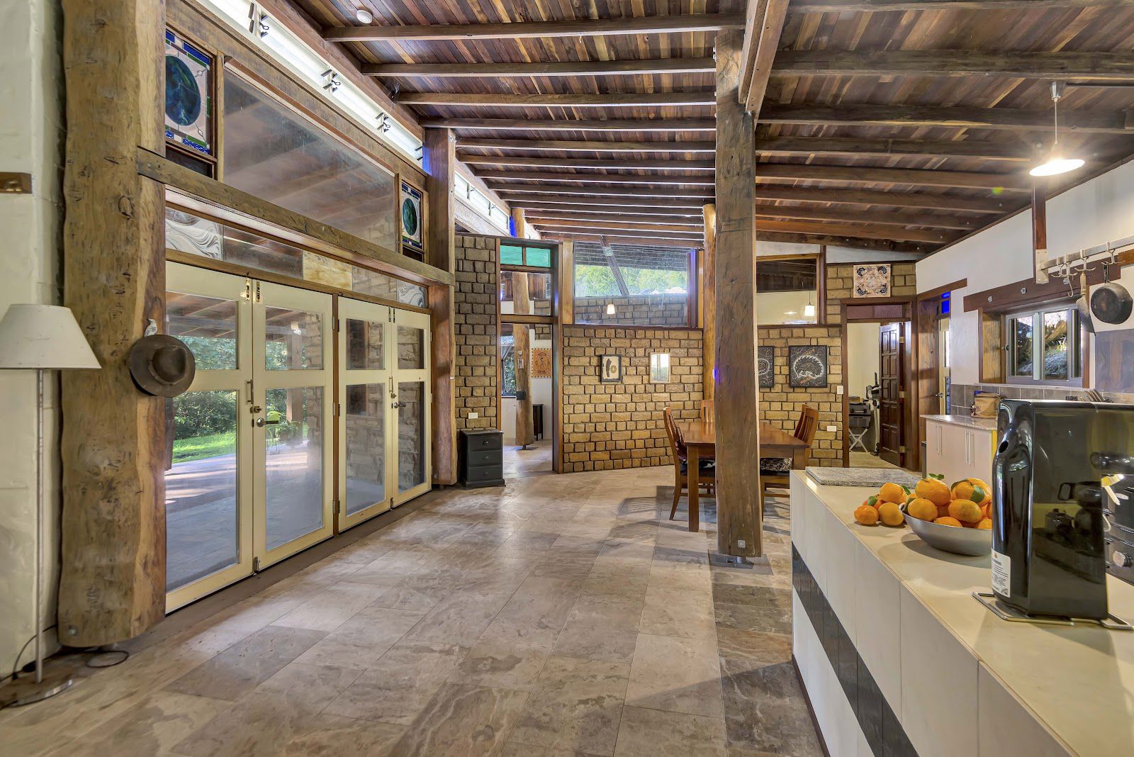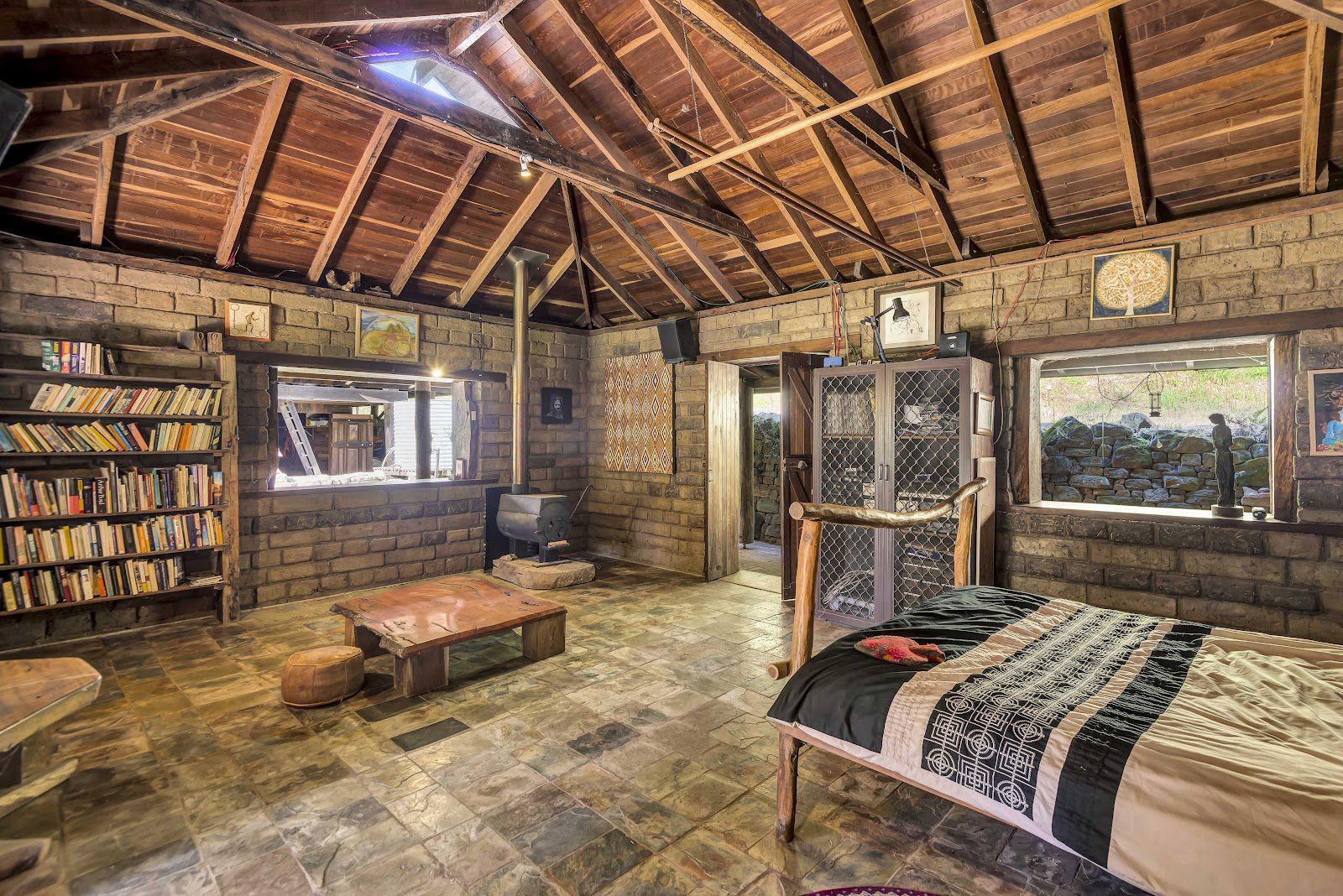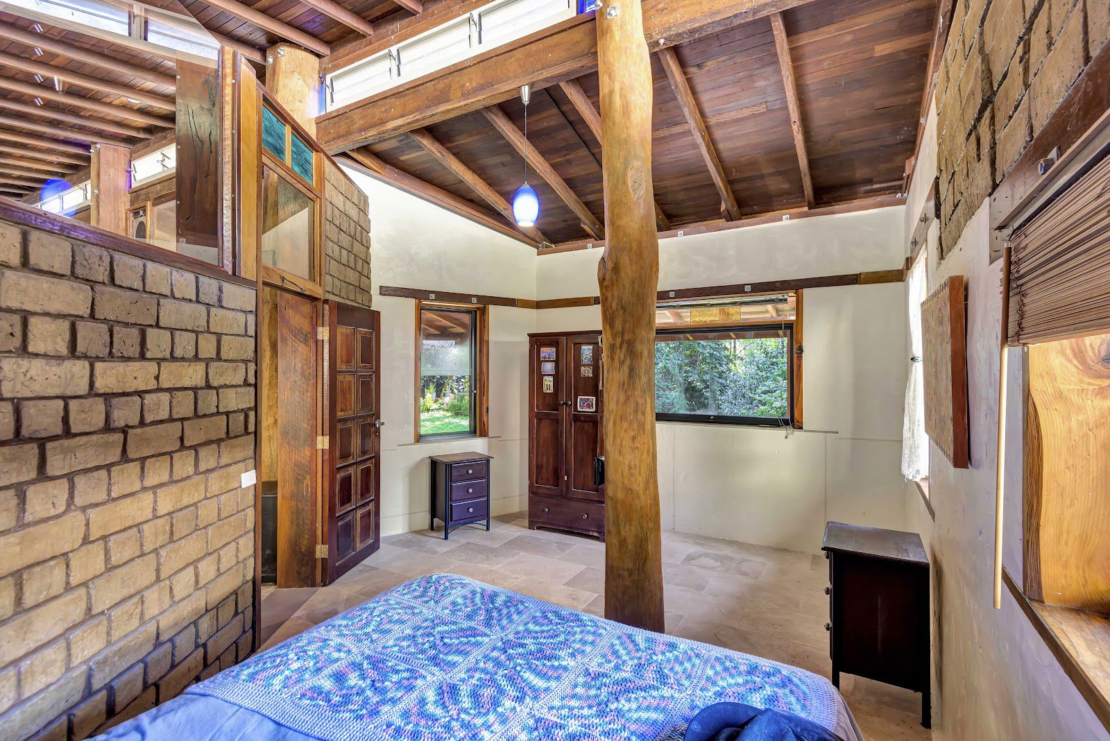 The three rooflines consist of a well built carport, a studio style master bedroom with barn style timber windows, and the masterpiece home which is currently one bedroom, that could very easily converted into a two bedroom home. The home consists of stained glass, super high ceilings, rustic timber poles, marble floors, marble & granite bench tops + more.
