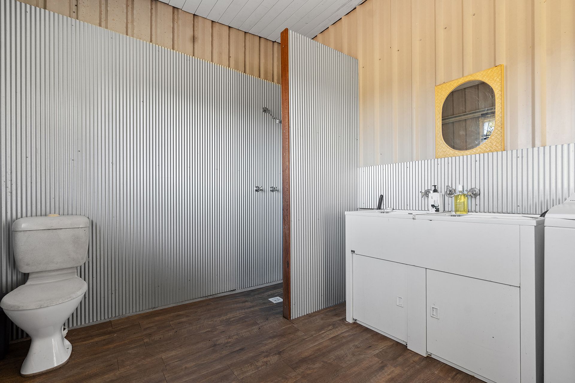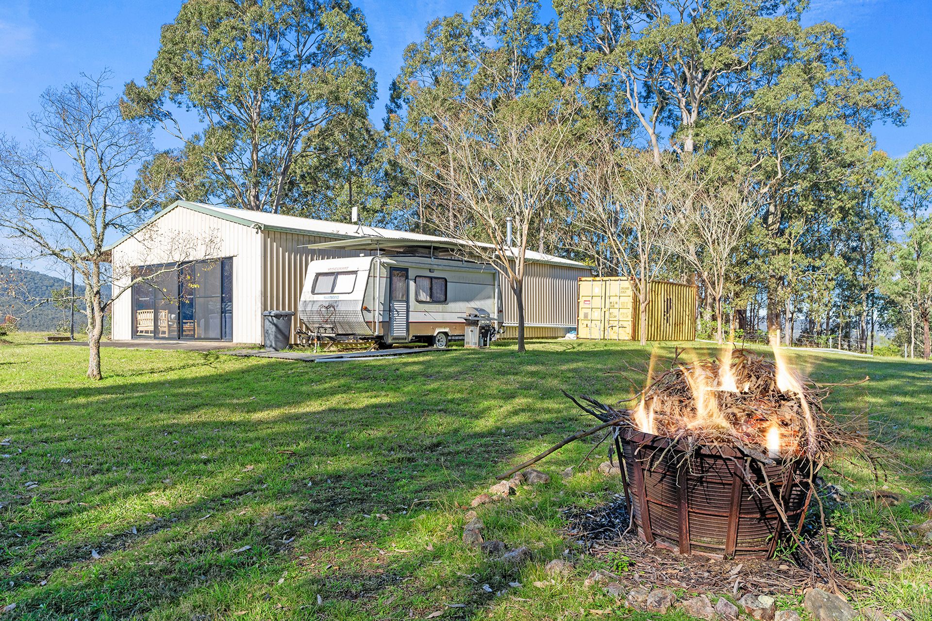 Currently, a walk-in walk-out furnished steel shed serves as a cozy weekender. Divided into two living areas, it features a kitchenette, separate bathroom, bunk room, and a slow combustion fire for those chilly nights. Additionally, the owner will leave a caravan and container for extra accommodation and storage, ensuring ample space for guests or hobbies.