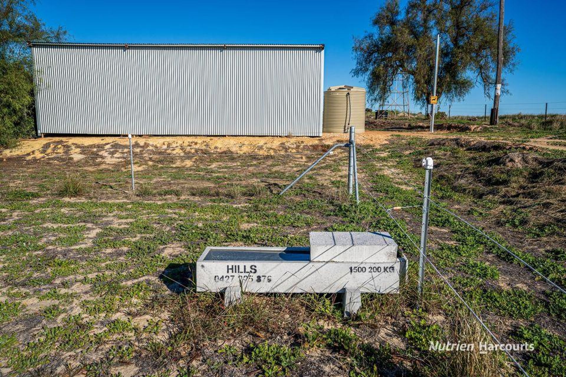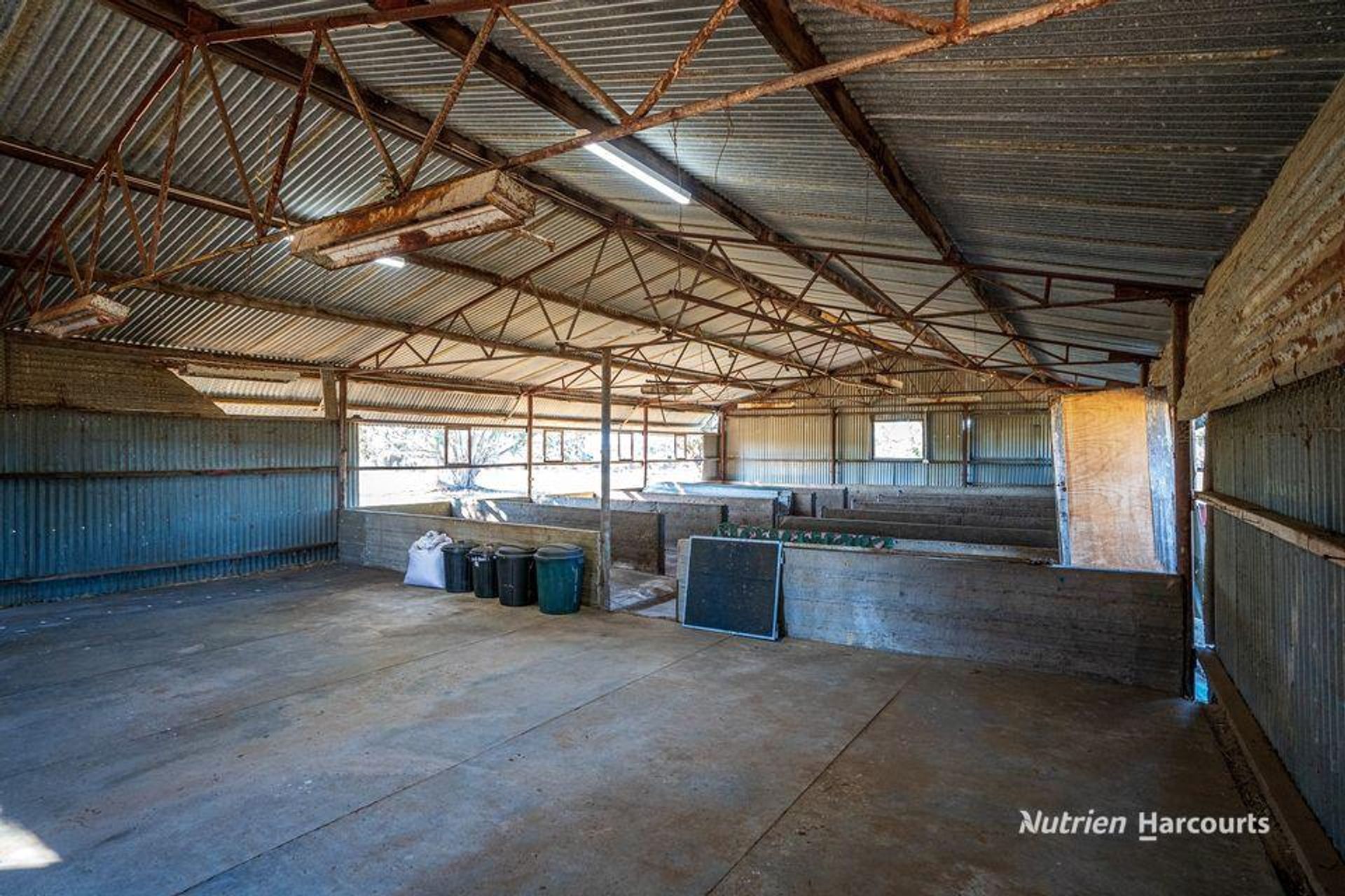 - A powered shed with concrete flooring, perfect for stables, a small feedlot, grain storage, or a myriad of other uses.