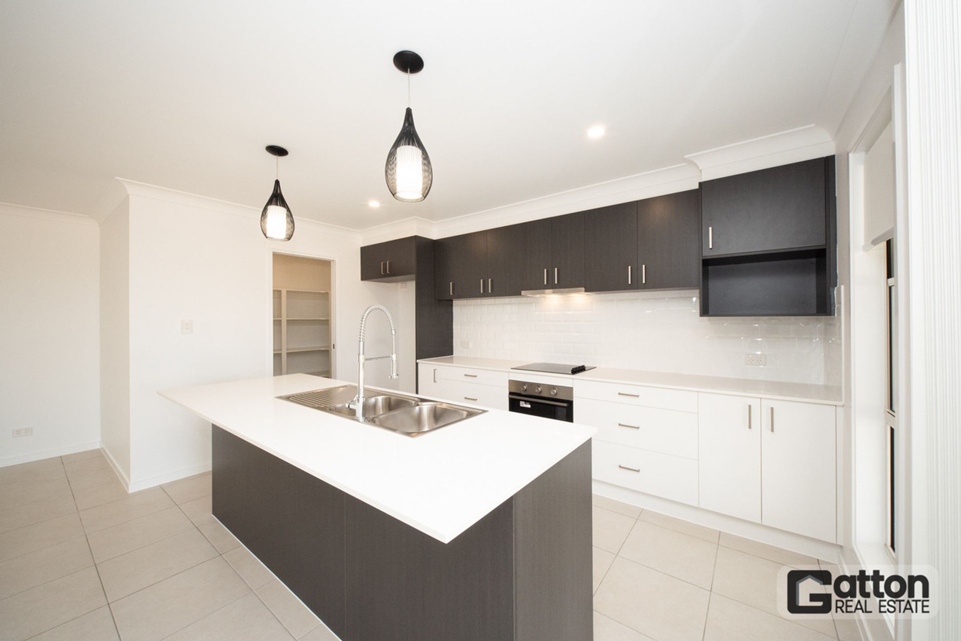 • Modern Kitchen: The galley kitchen features a walk-in pantry, soft-close drawers and cupboards, a fridge space with a water point, a dishwasher, ceramic pendant lights, and a double sink with a pull-down tap fitting.