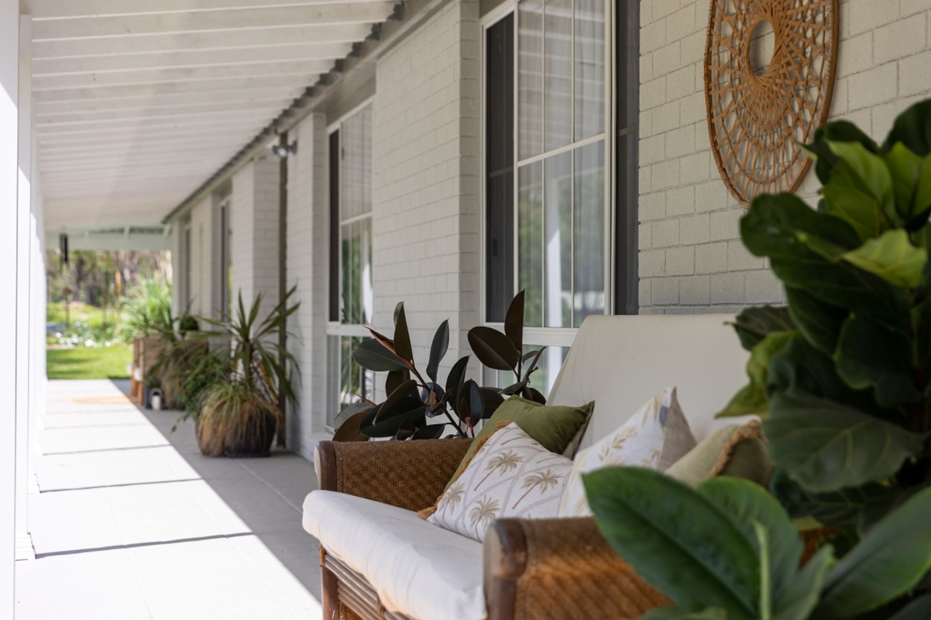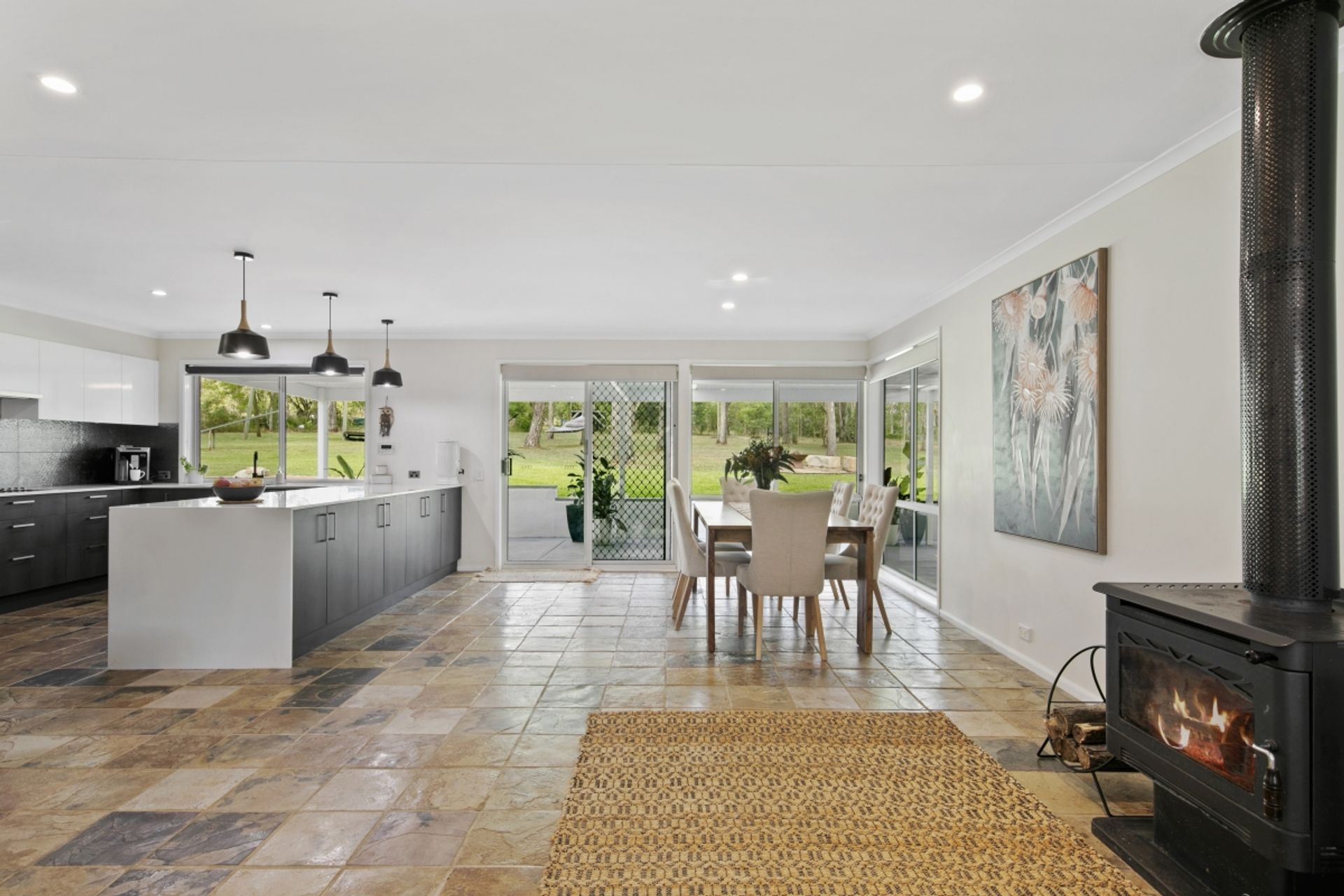 Upon arrival, farmhouse timber fencing opens up to a circular driveway that leads to the home, with established gardens and spectacular shade trees providing a lovely welcome. There is a long verandah that spans the entire front of the home, providing the perfect space to sit back with your morning coffee at sundown. Stepping inside the home you'll enter the spacious foyer, with a generously sized living room set to one side featuring stylish floating floorboards and split system air conditioning. Located adjacent is a study/home office, perfect for those working from home. To the other side is the impressive open plan living, dining and kitchen area, with plenty of natural light from the surrounding windows and sliding doors.
