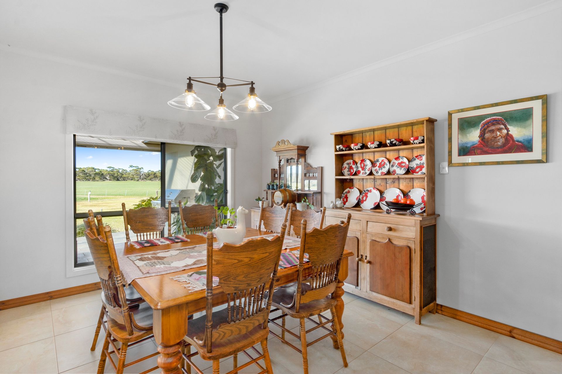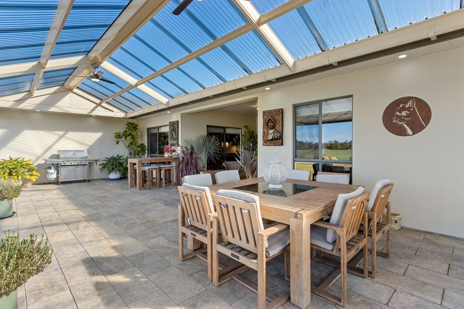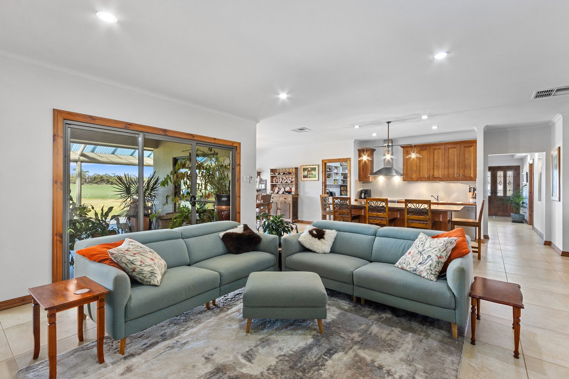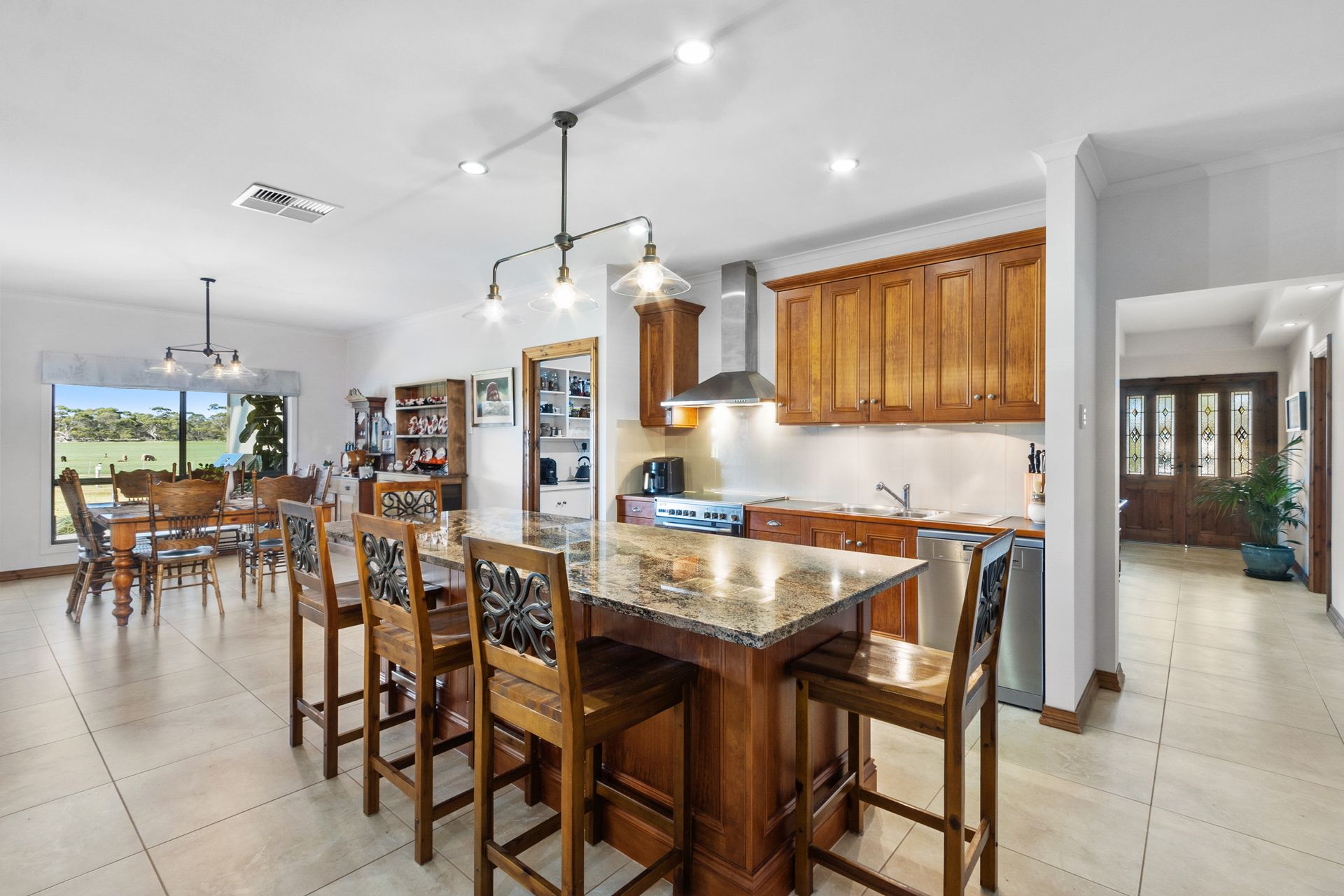Open Plan Living: A large, tiled living and dining area seamlessly connects to the kitchen, which boasts a butler's pantry, a 900mm electric oven with a gas cooktop, a dishwasher, and a striking island bench crafted from local Wallaroo granite.