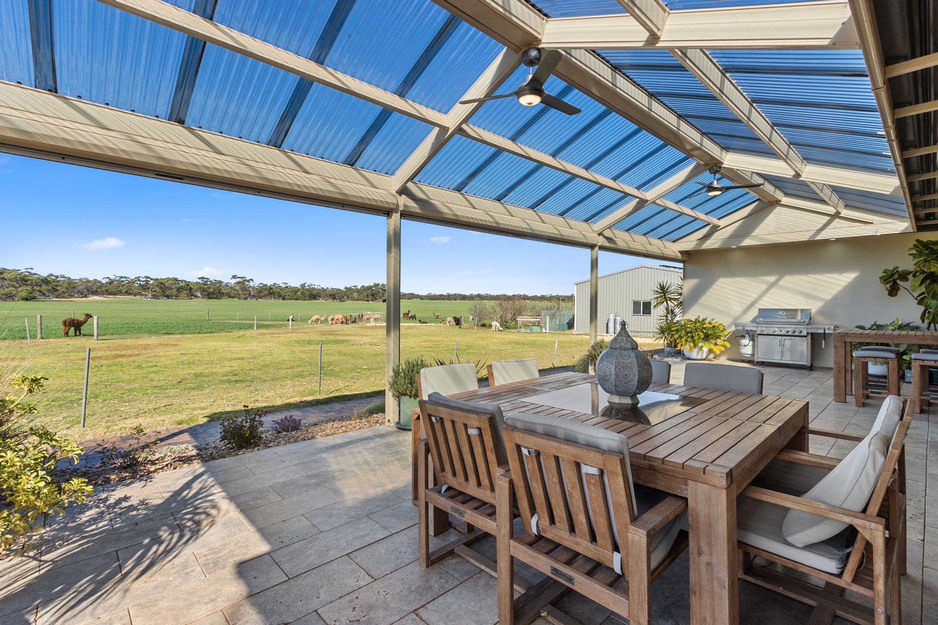 Outdoor Enjoyment: Large undercover paved entertaining area with ceiling fans and café blinds, irrigation watering system.