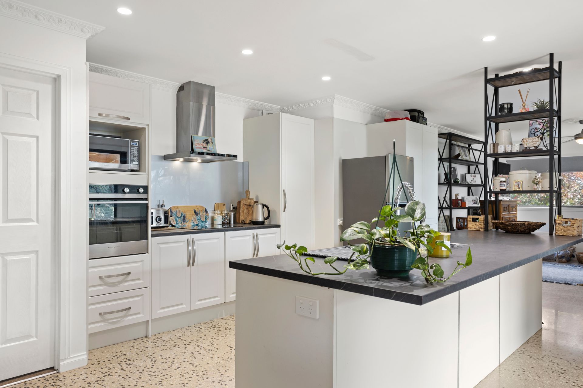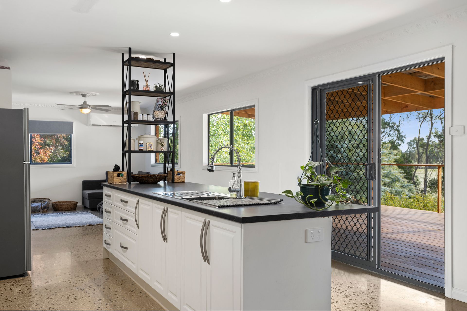 The open plan kitchen, dining and living space is also gorgeous with its exposed, polished aggregate concrete floor and an ambient Norseman wood heater. The near new kitchen features a Westinghouse wall oven, pot drawers and cupboards and the wide island bench with a breakfast bar will be a happy gathering point.