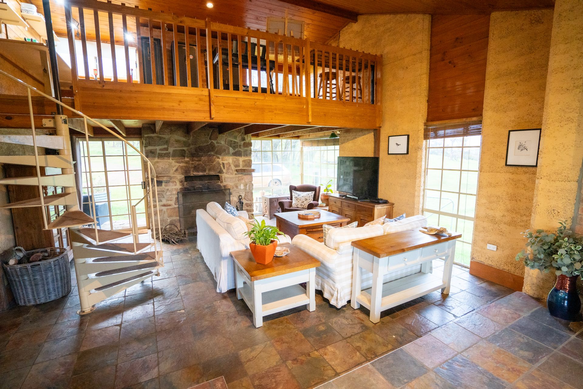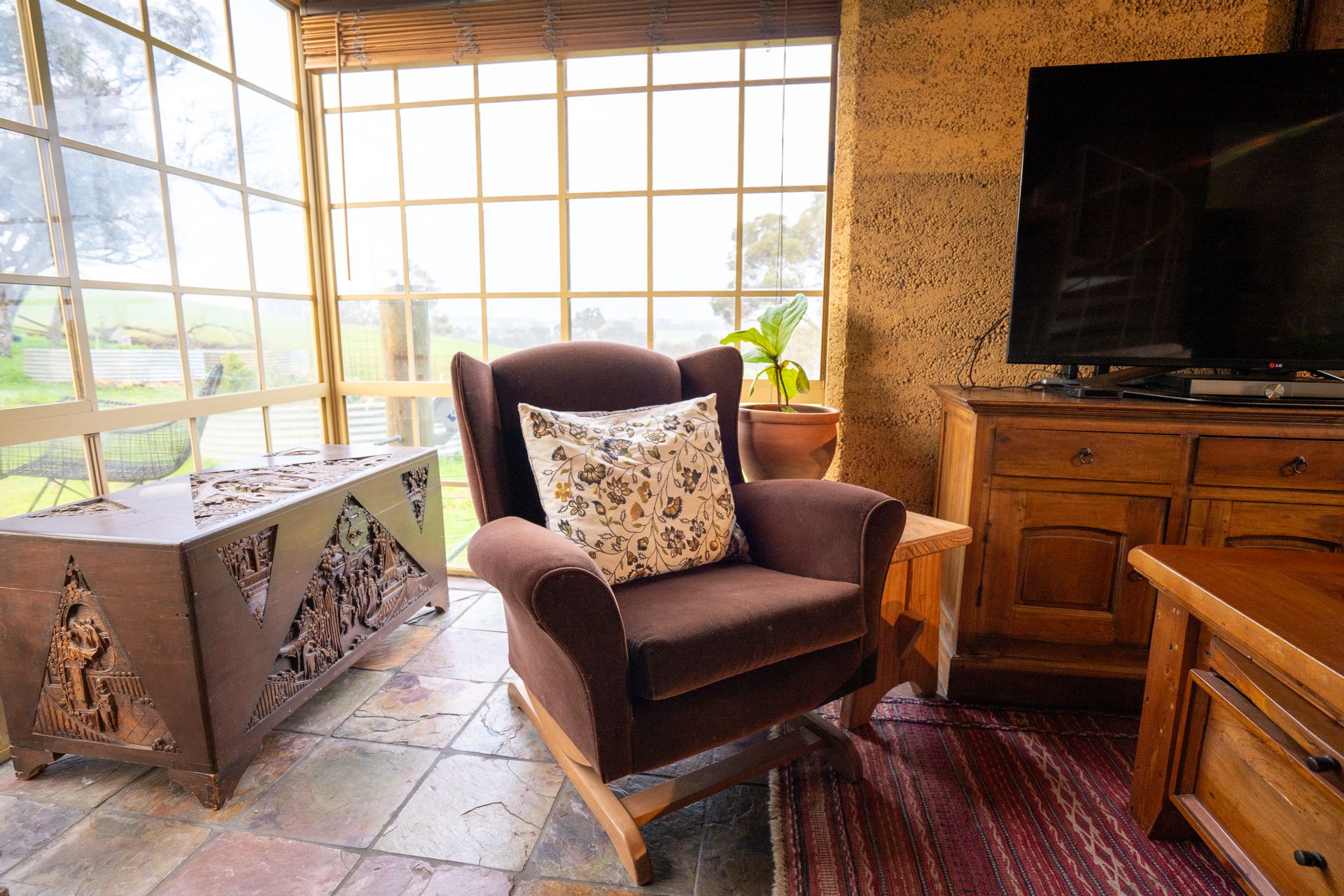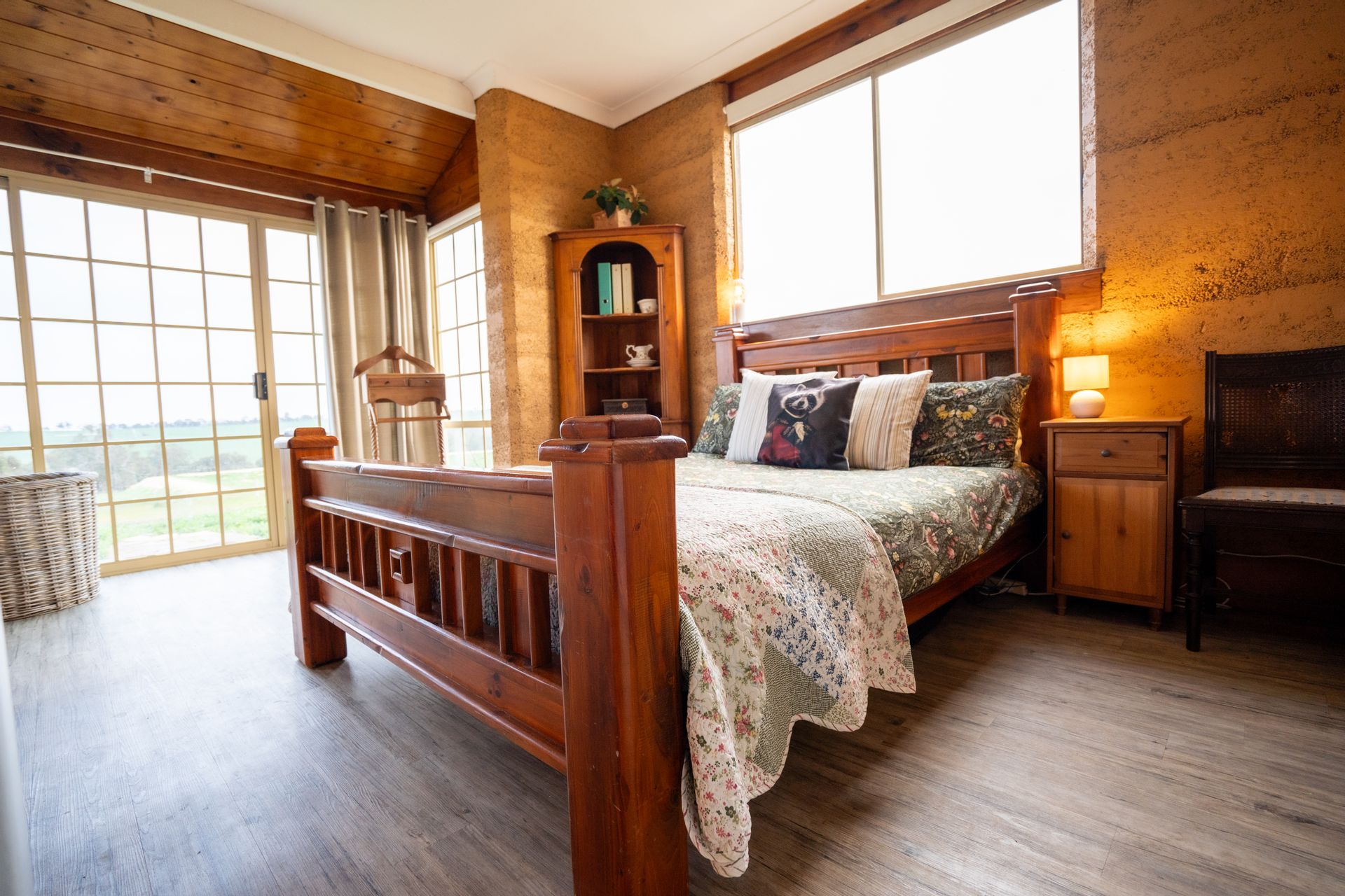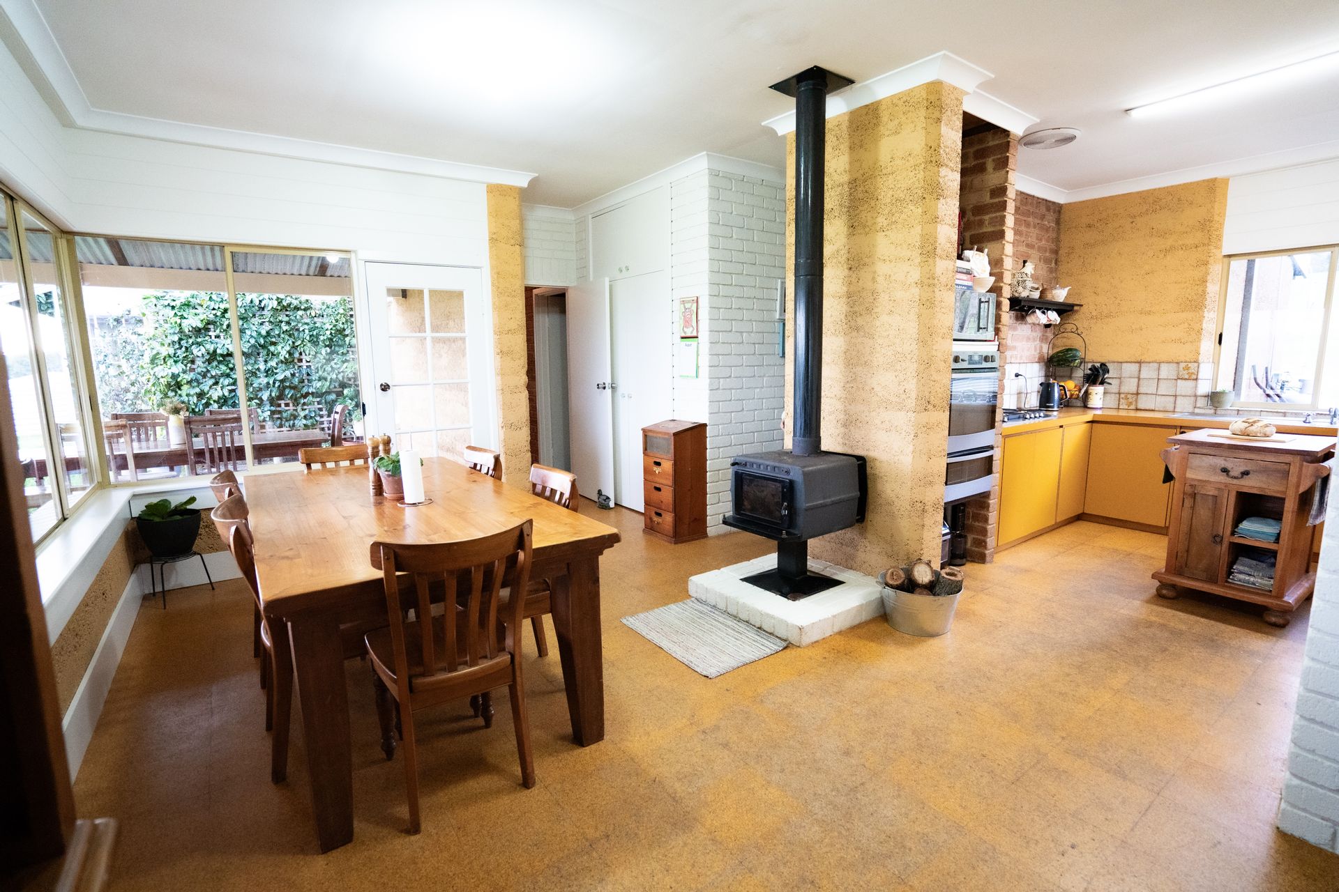 The character-filled 4-bedroom, 2-bathroom rammed earth home is beautifully situated on an elevated site, offering stunning rural views from every window. The home's design is cozy, spacious and practical, creating an inviting atmosphere from the moment you step through the convenient mudroom, which includes a separate shower, toilet, and laundry. As you continue down the hall and into the dining area, you'll be captivated by the light-filled living space, where large windows frame the stunning scenery. The warmth of the wood fire adds to the inviting ambiance, complemented by the beautiful cork and slate flooring throughout.