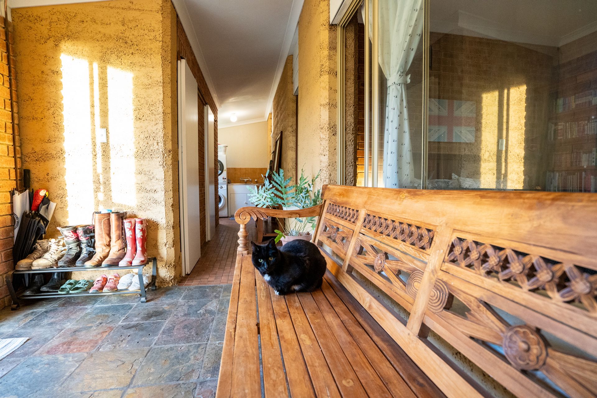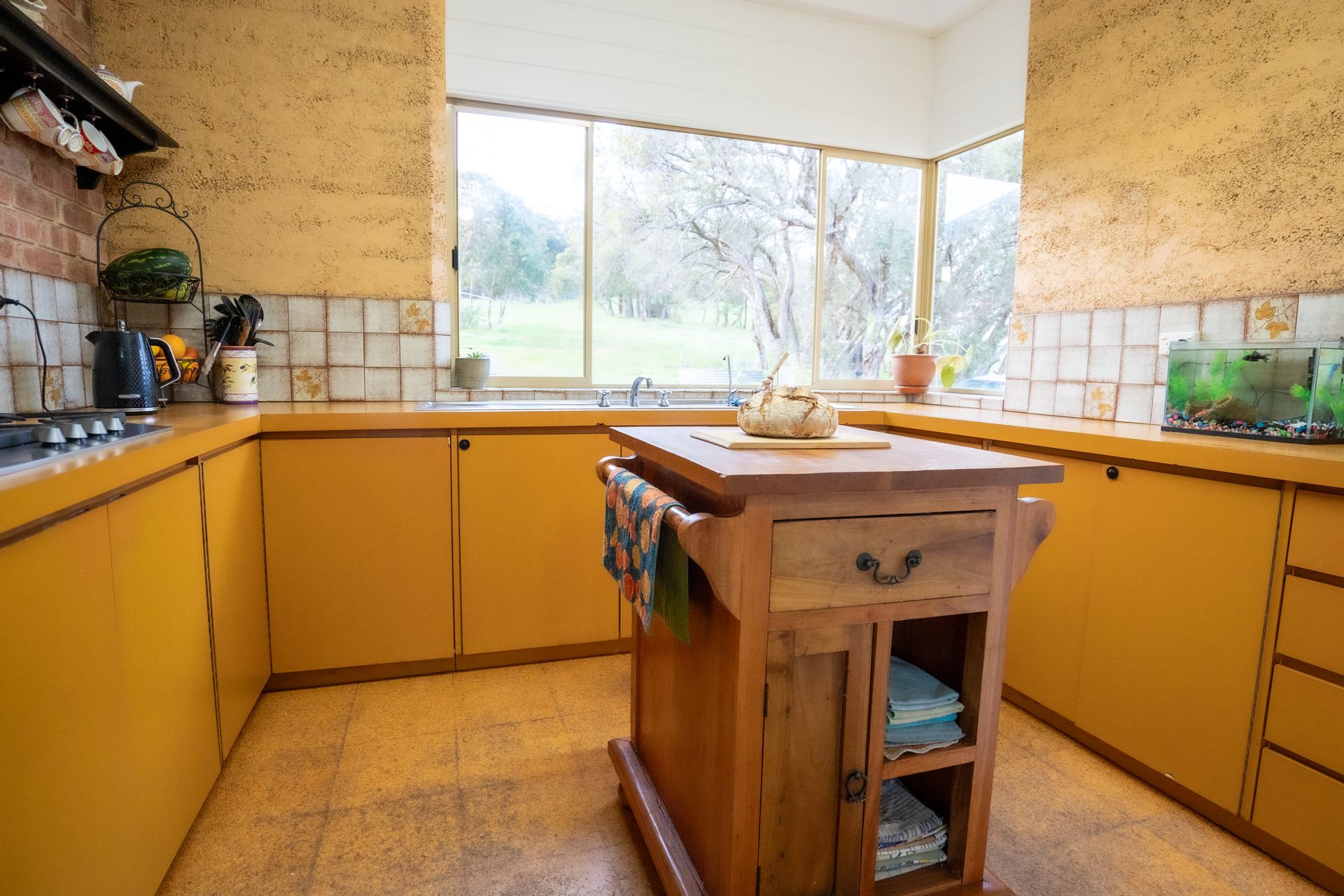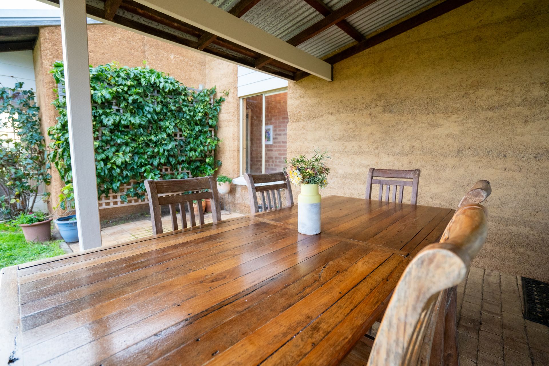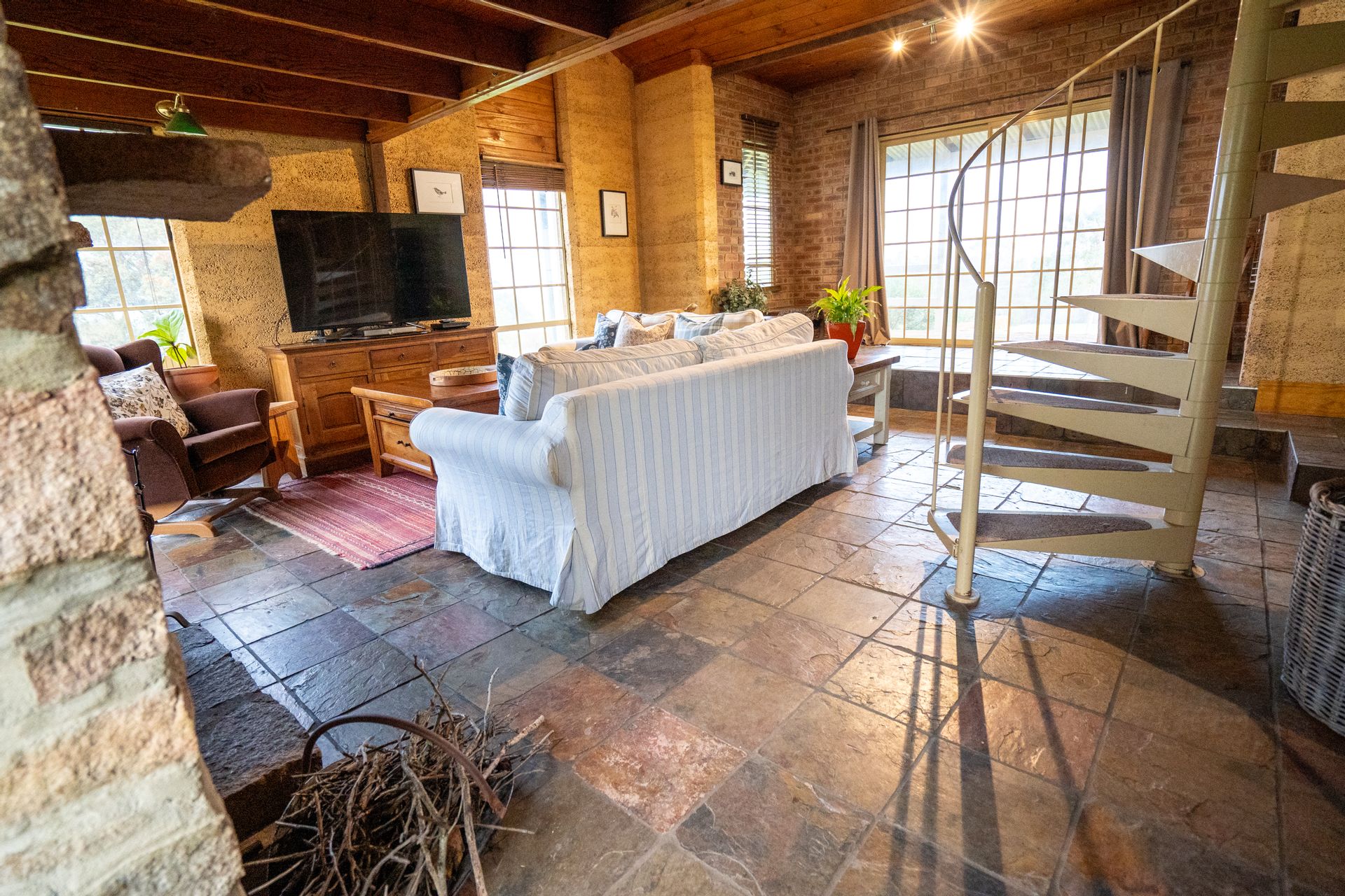 The character-filled 4-bedroom, 2-bathroom rammed earth home is beautifully situated on an elevated site, offering stunning rural views from every window. The home's design is cozy, spacious and practical, creating an inviting atmosphere from the moment you step through the convenient mudroom, which includes a separate shower, toilet, and laundry. As you continue down the hall and into the dining area, you'll be captivated by the light-filled living space, where large windows frame the stunning scenery. The warmth of the wood fire adds to the inviting ambiance, complemented by the beautiful cork and slate flooring throughout.