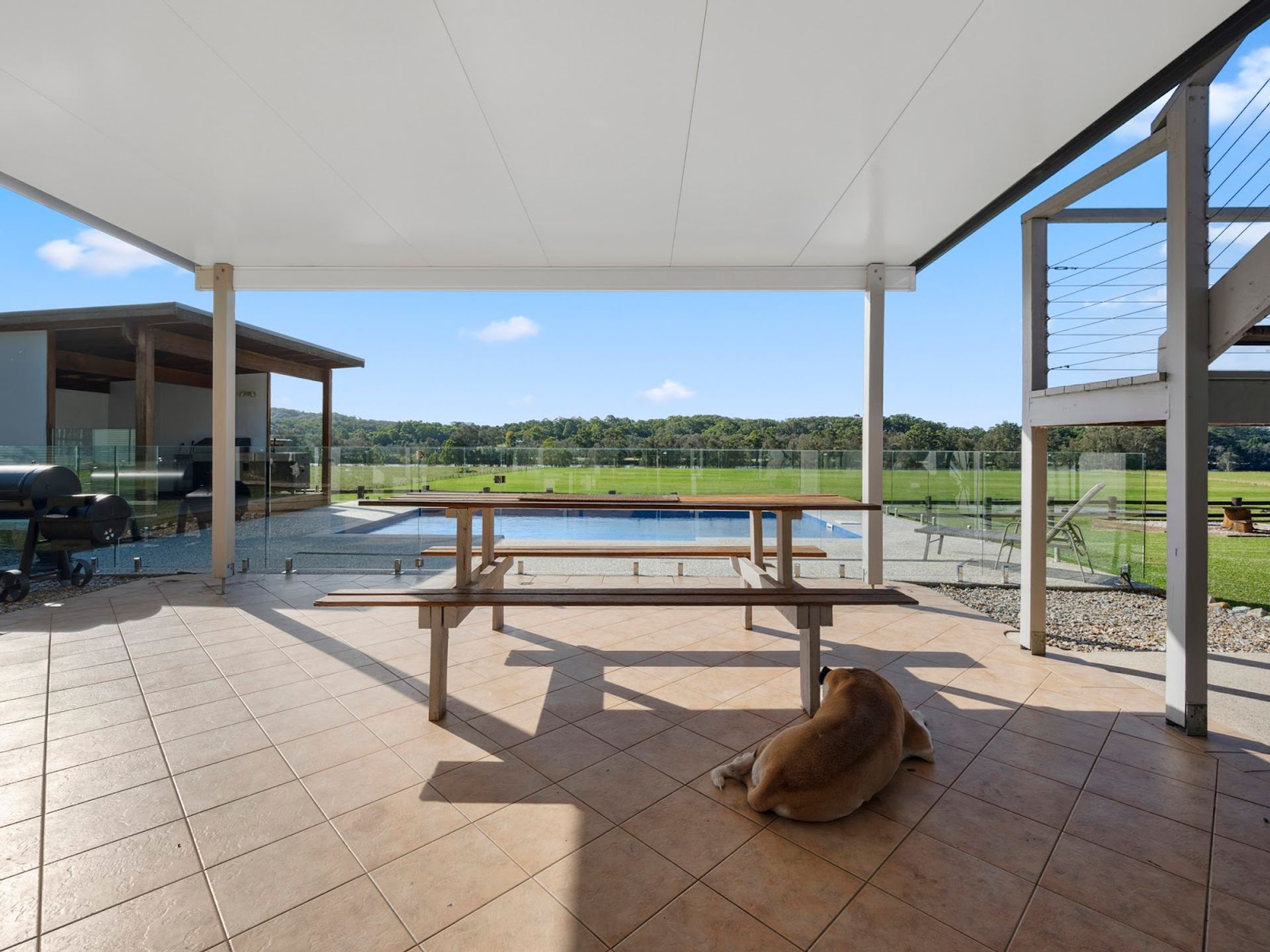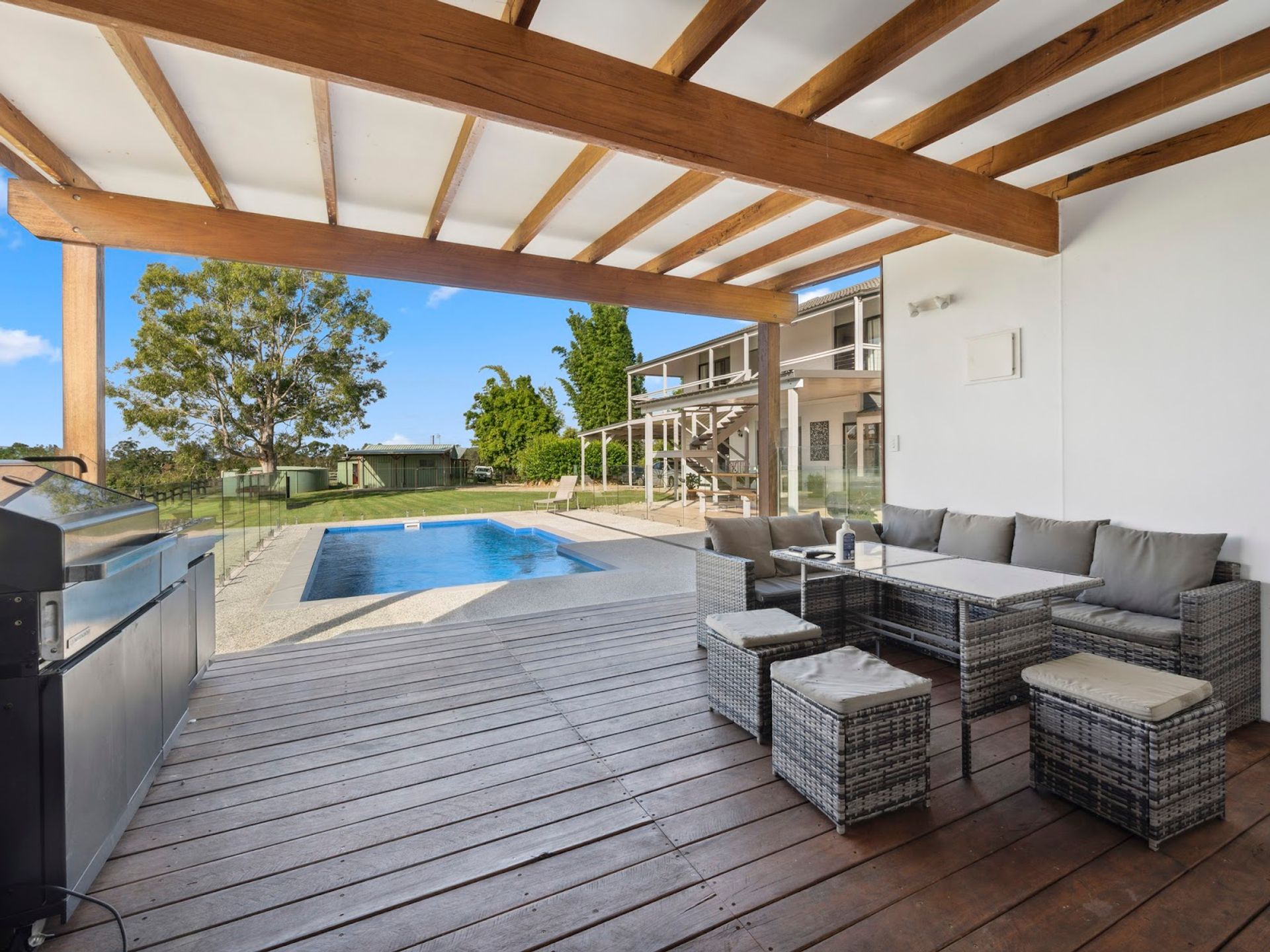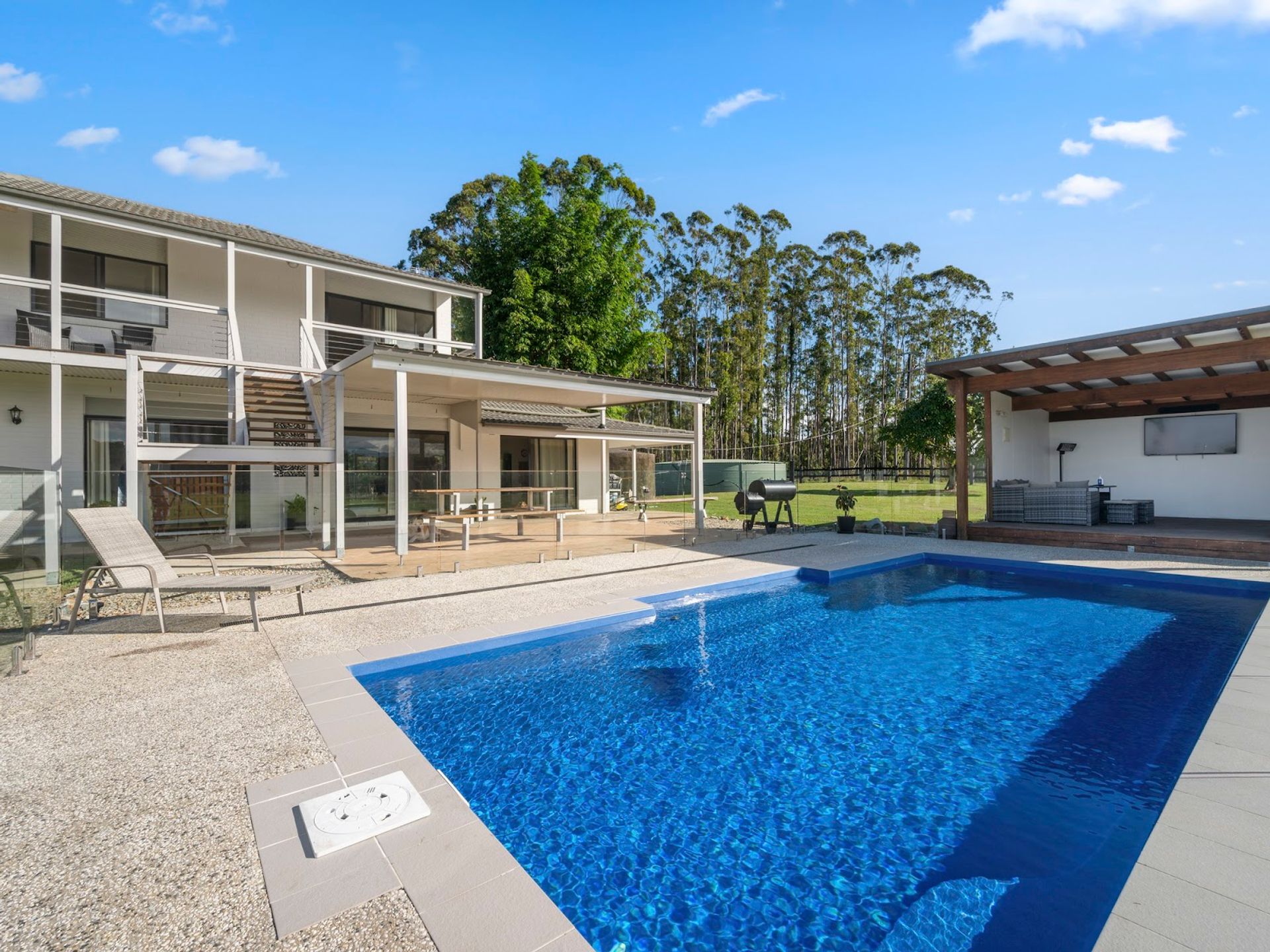 The expansive family home features four bedrooms, two bathrooms, a pool, and spacious living areas designed to capture the breathtaking surroundings. The upstairs master suite is a private retreat with a generous walk-in robe, ensuite, and balcony overlooking the river and mountains.