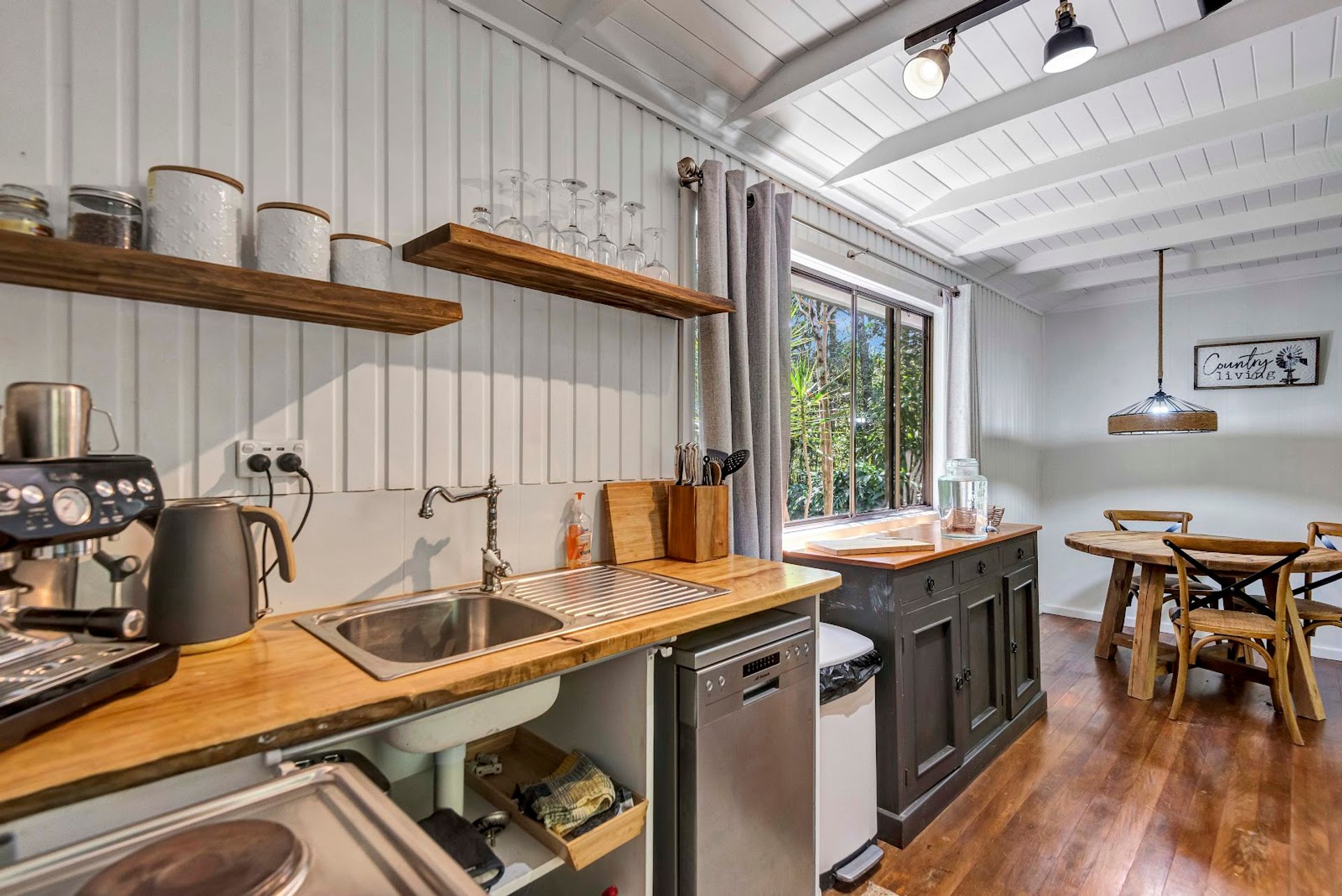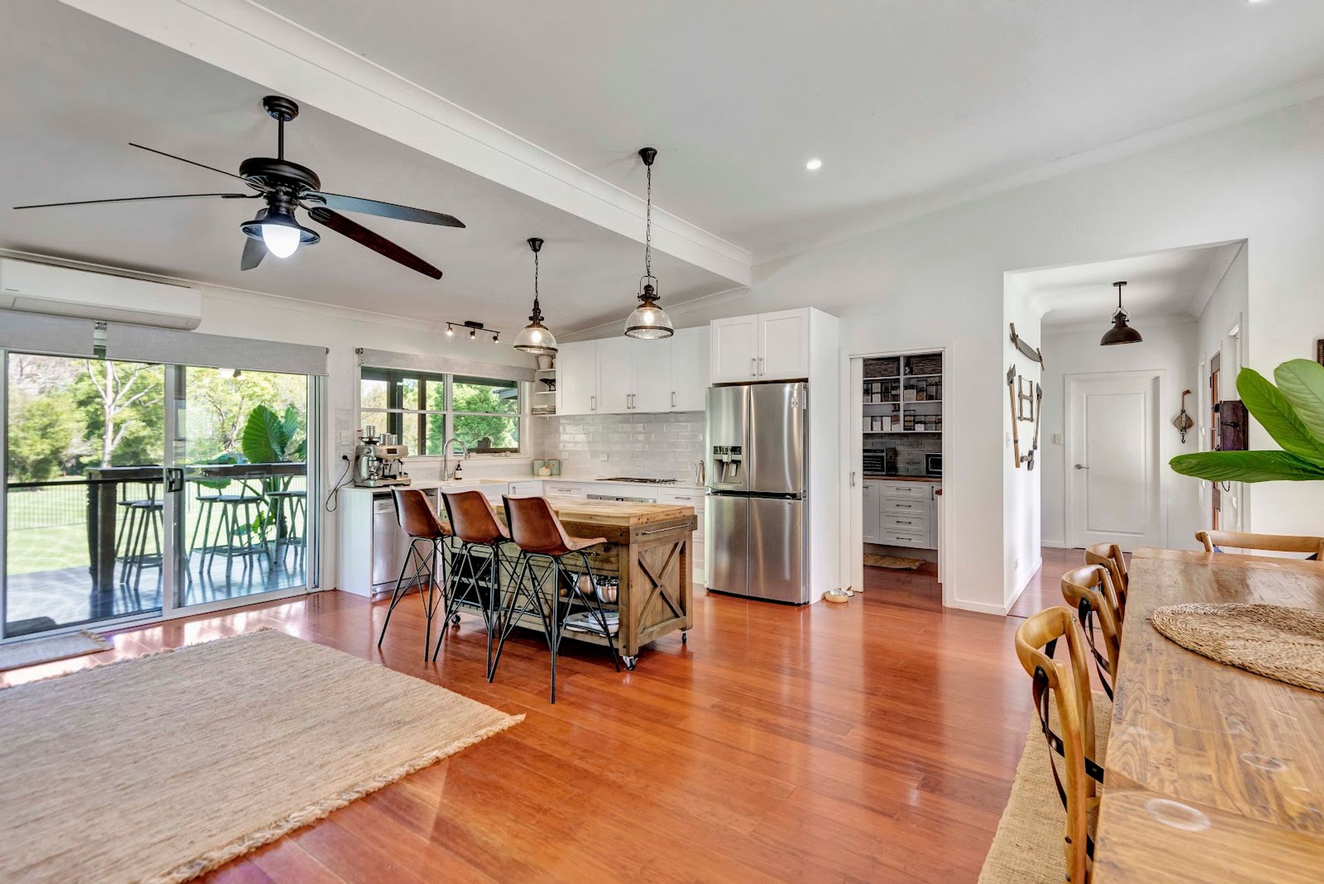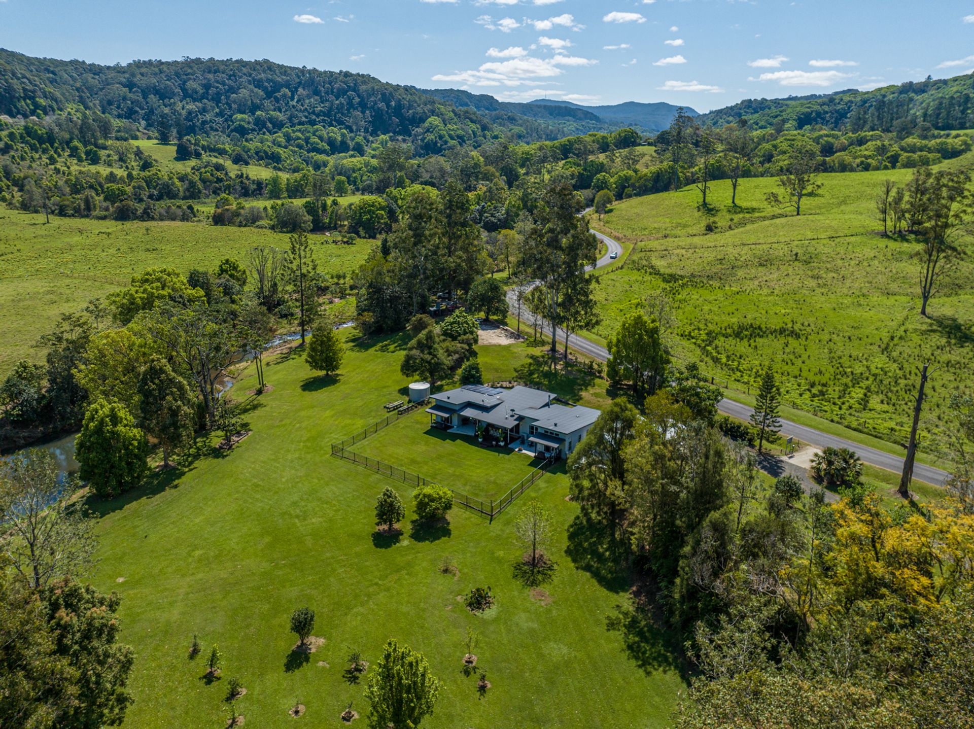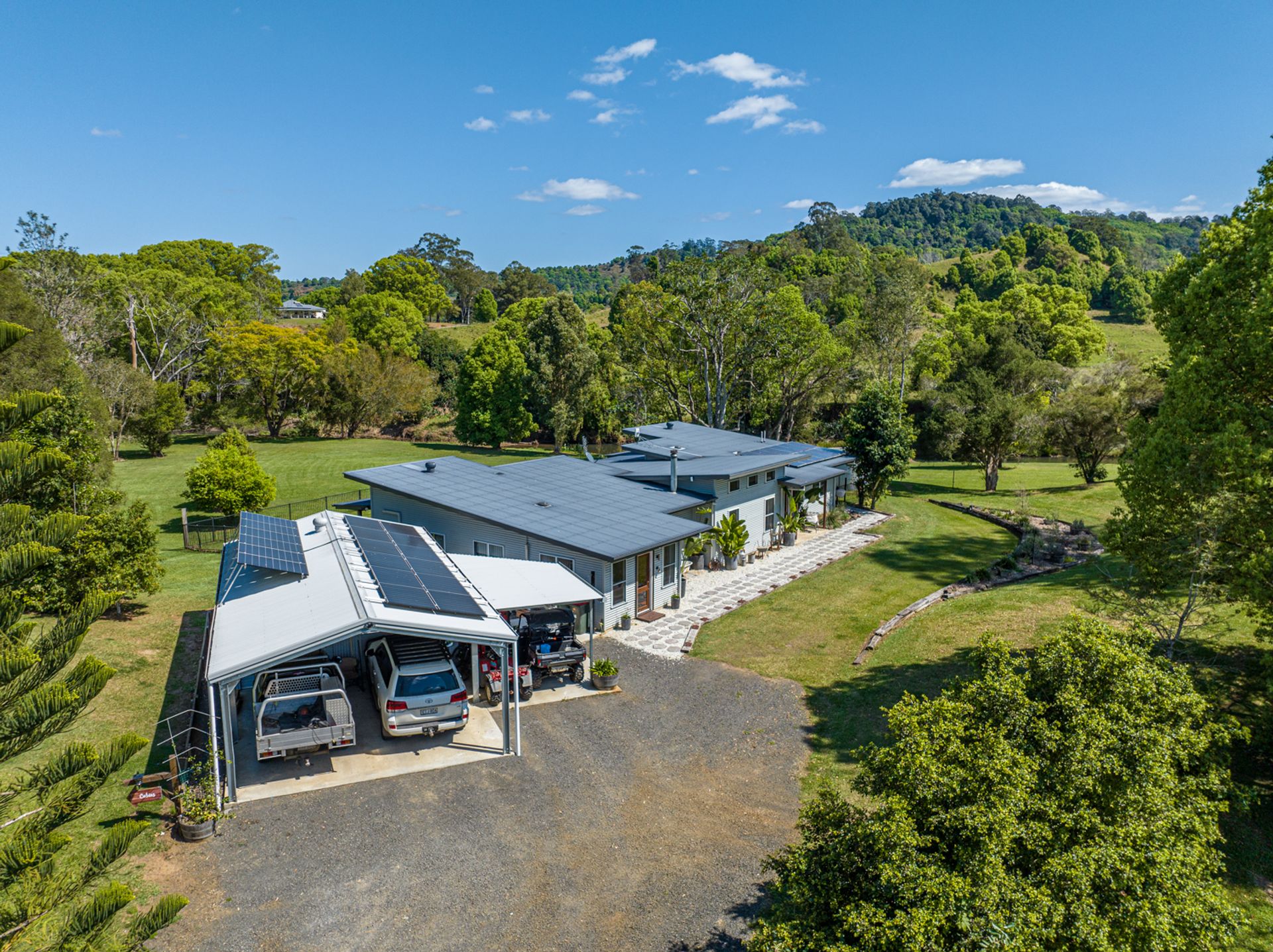 The house is a modern build with the owners installing a new stunning kitchen, butlers pantry & laundry. The kitchen has stone bench tops, deep sinks, and all brand new appliances. Gaze out over the resort style yard down to the creek from the kitchen. Enjoy the benefits of a 10kw solar system with a 14kw battery to assist powering the new air conditioning units or enjoy the warmth from the classic old wood heater. High ceilings create the atmosphere from the kitchen/dining area through to the lounge room.