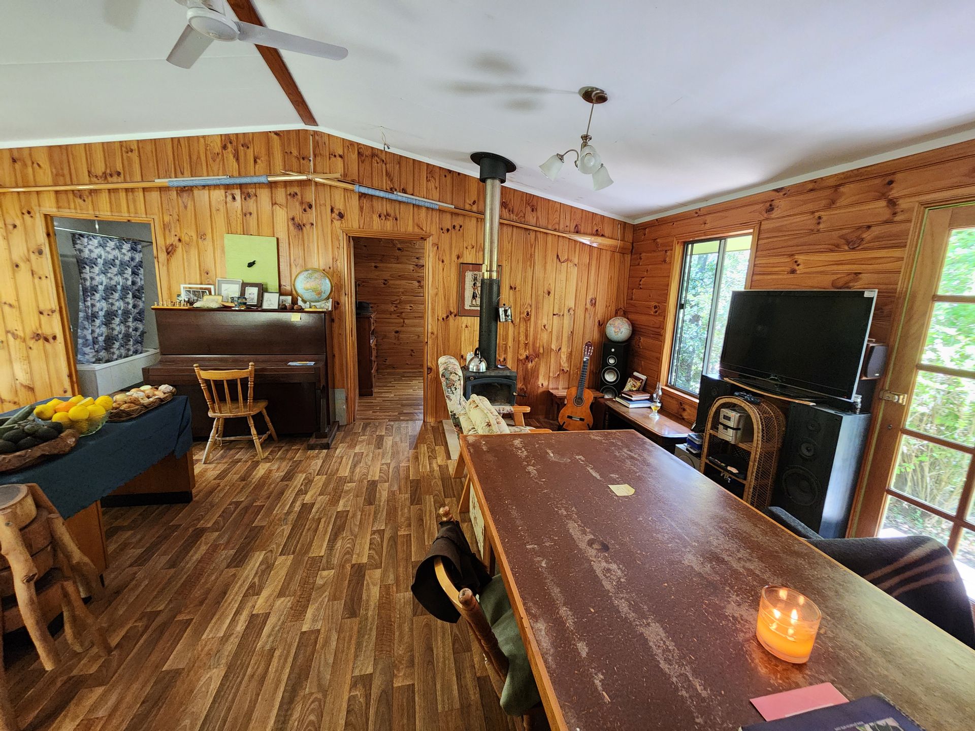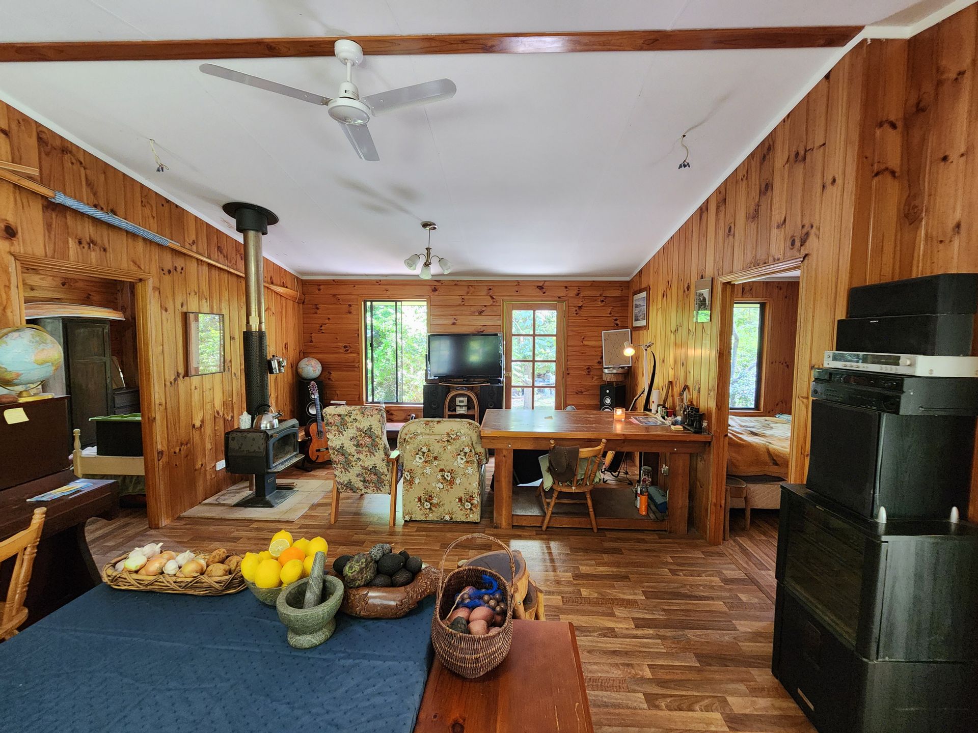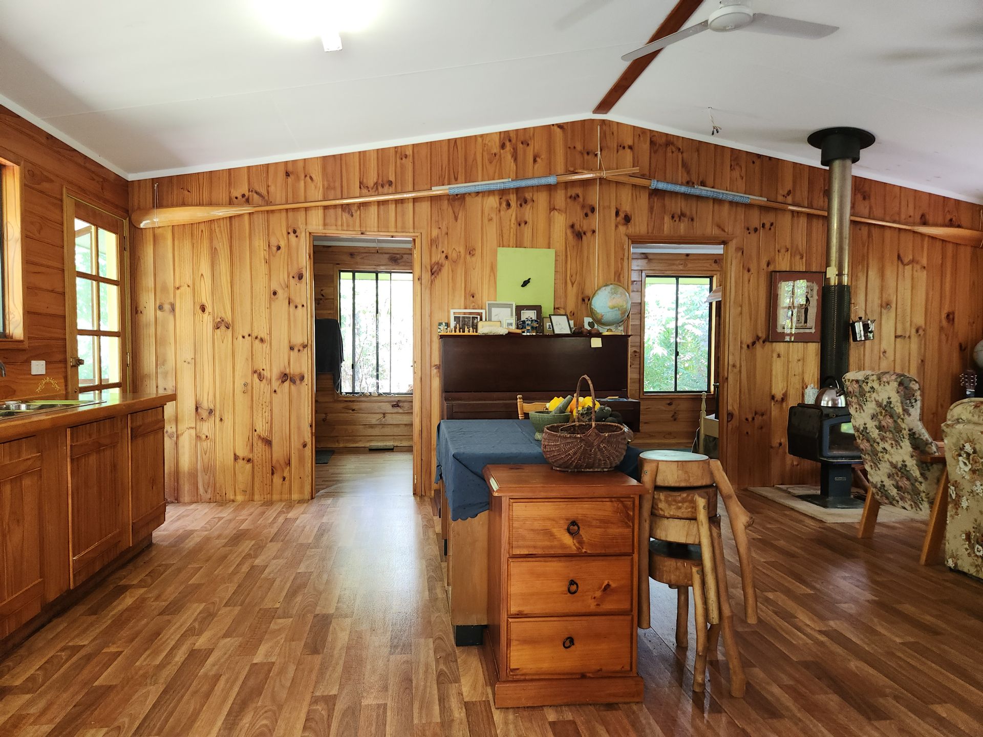 Step inside to discover a cozy interior featuring stained wood accents that enhance the rustic charm of this cottage. The open-plan living area, bathed in natural light, creates a warm and welcoming atmosphere. Enjoy cozy evenings by the wood fire heater, perfect for unwinding after a day in nature. The well-equipped kitchen boasts all of the appliances needed, making meal preparation a breeze.