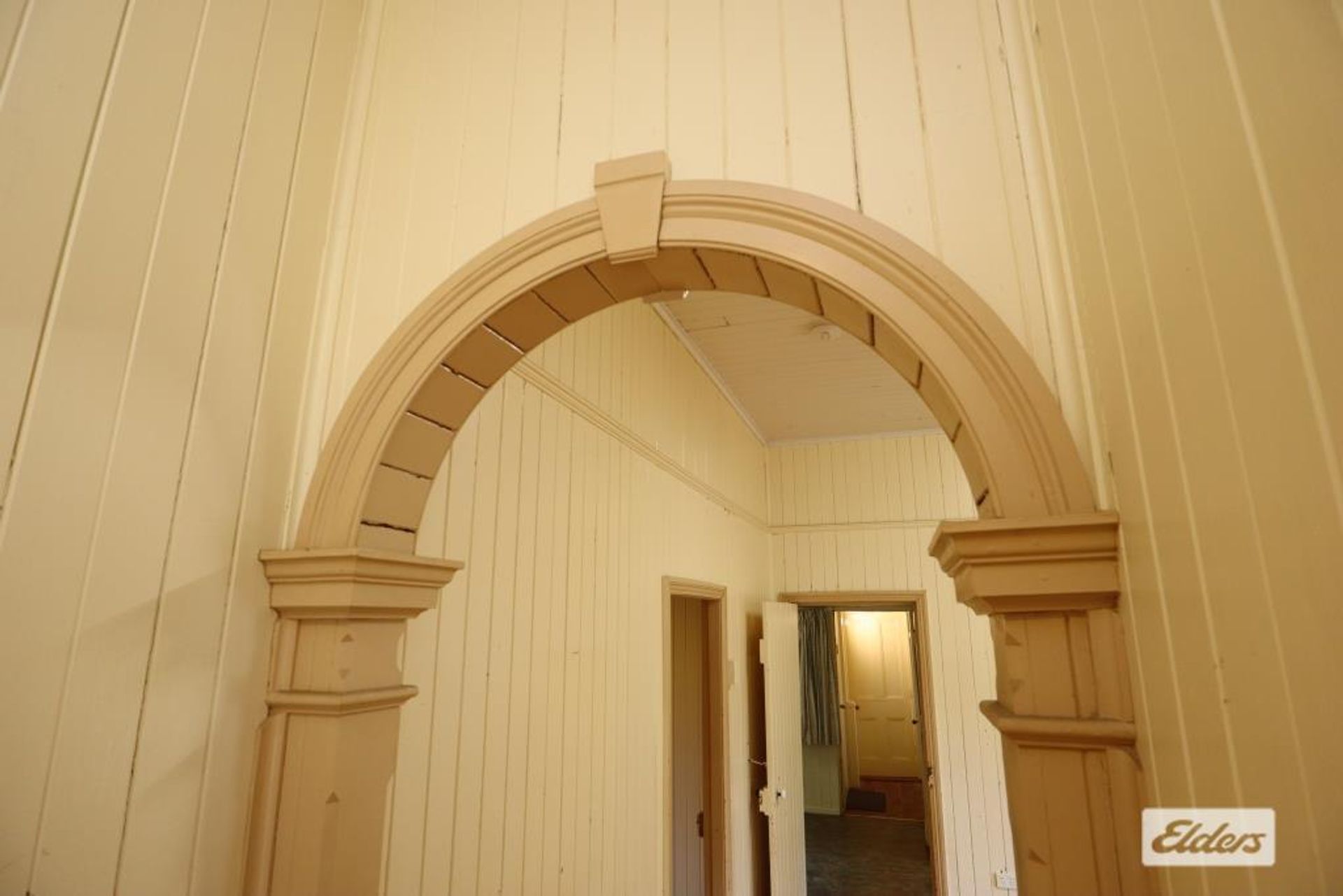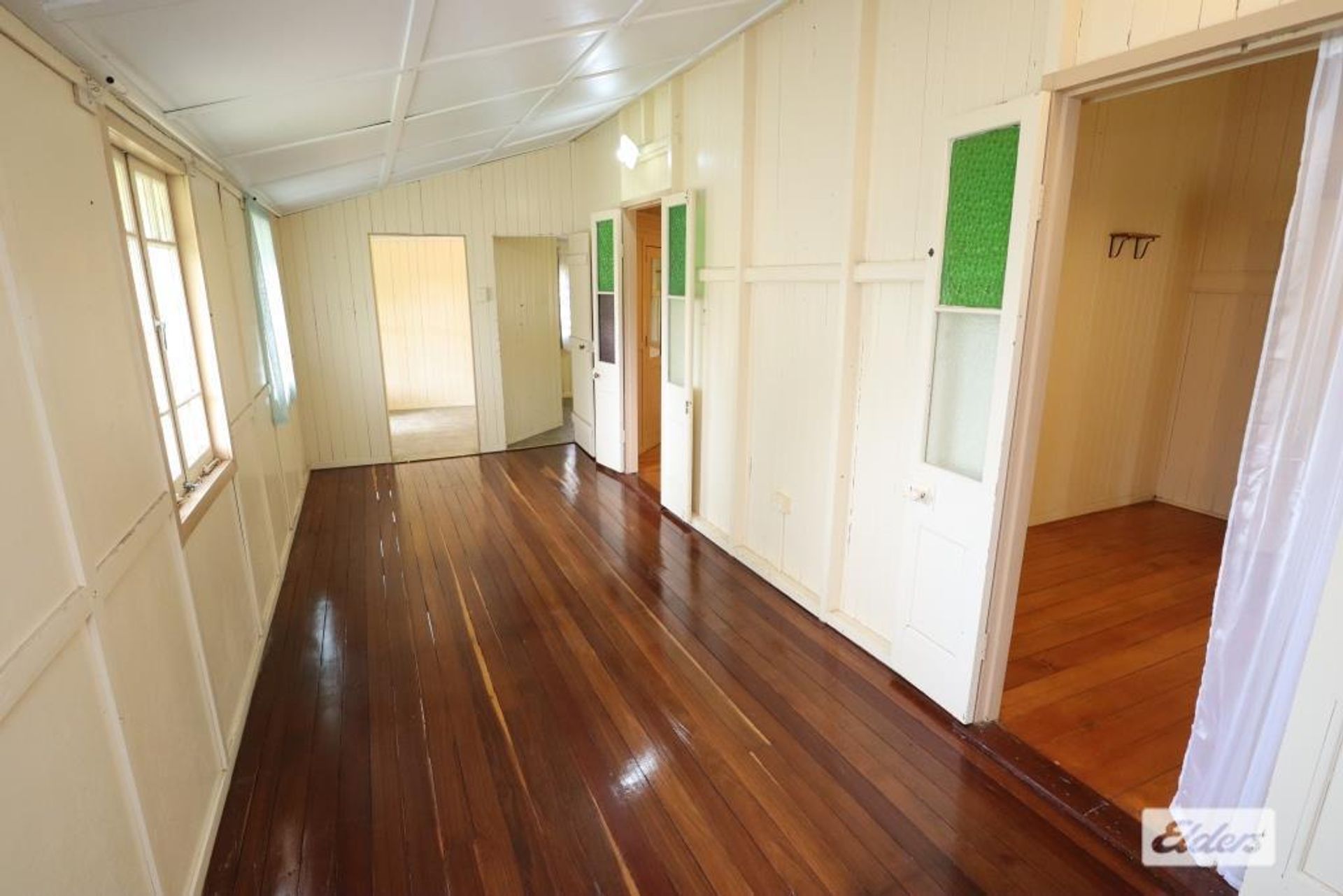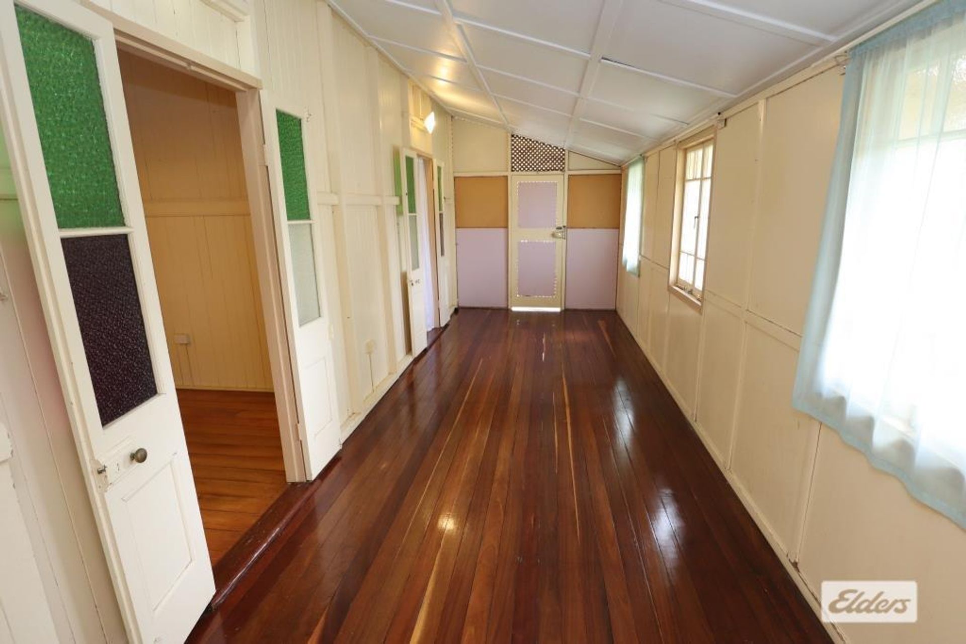 Step inside to discover the elegance of wide hoop pine flooring, timeless archways, and soaring ceilings that enhance the home's inviting atmosphere. The property boasts three bedrooms, with one featuring a built-in cupboard. Through painted glass French doors, you can access a versatile sleepout that could easily be transformed into a fourth bedroom.