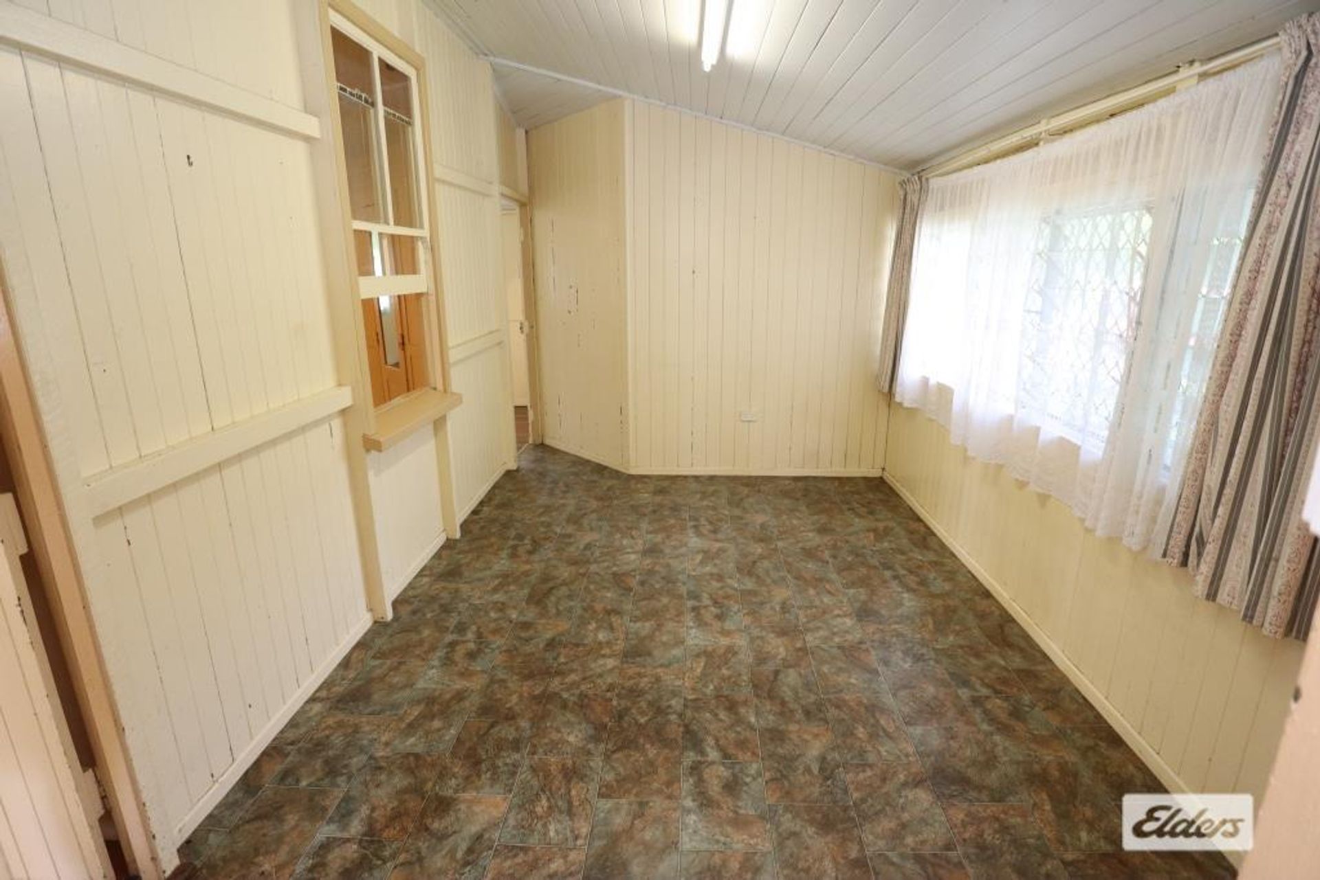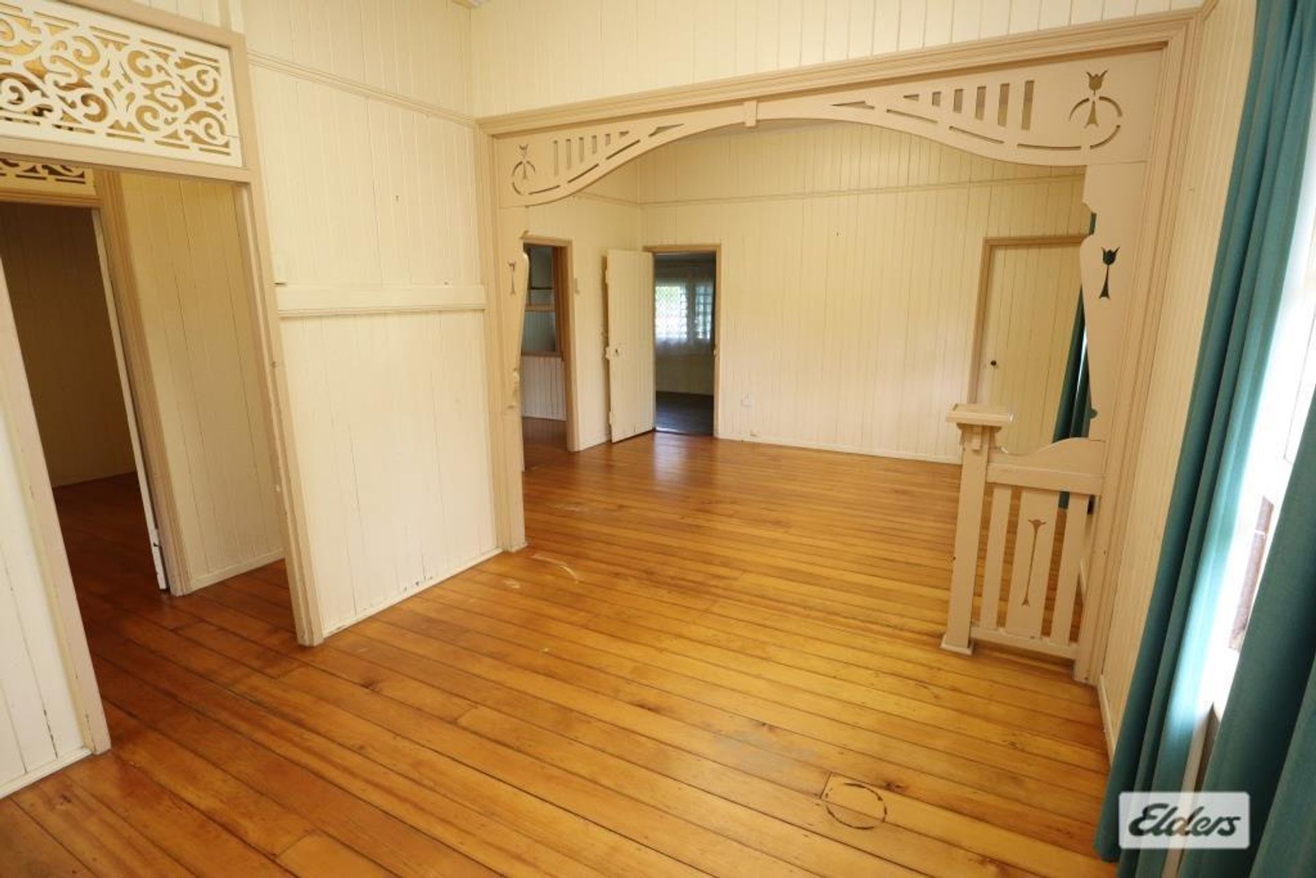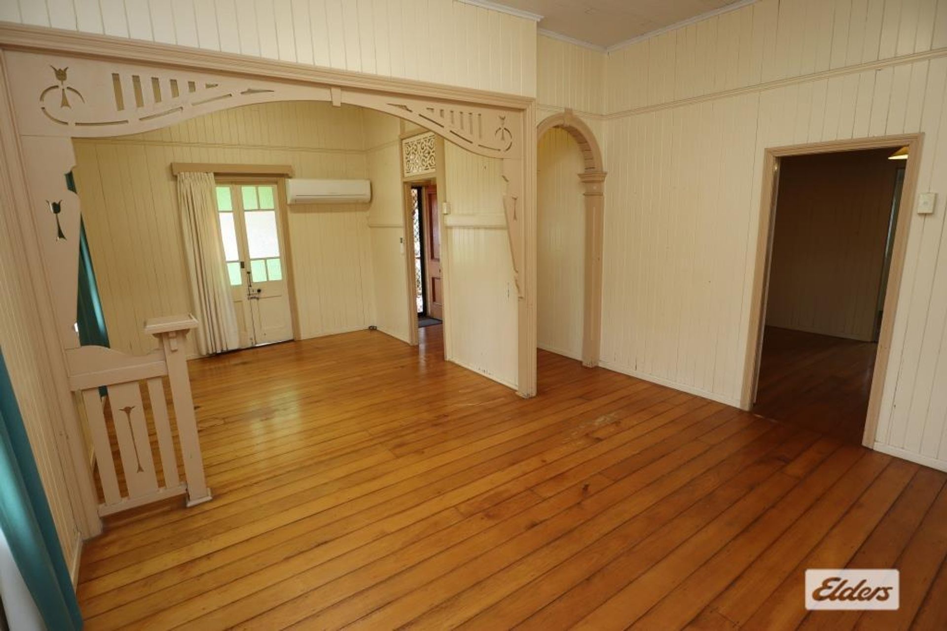 Step inside to discover the elegance of wide hoop pine flooring, timeless archways, and soaring ceilings that enhance the home's inviting atmosphere. The property boasts three bedrooms, with one featuring a built-in cupboard. Through painted glass French doors, you can access a versatile sleepout that could easily be transformed into a fourth bedroom.