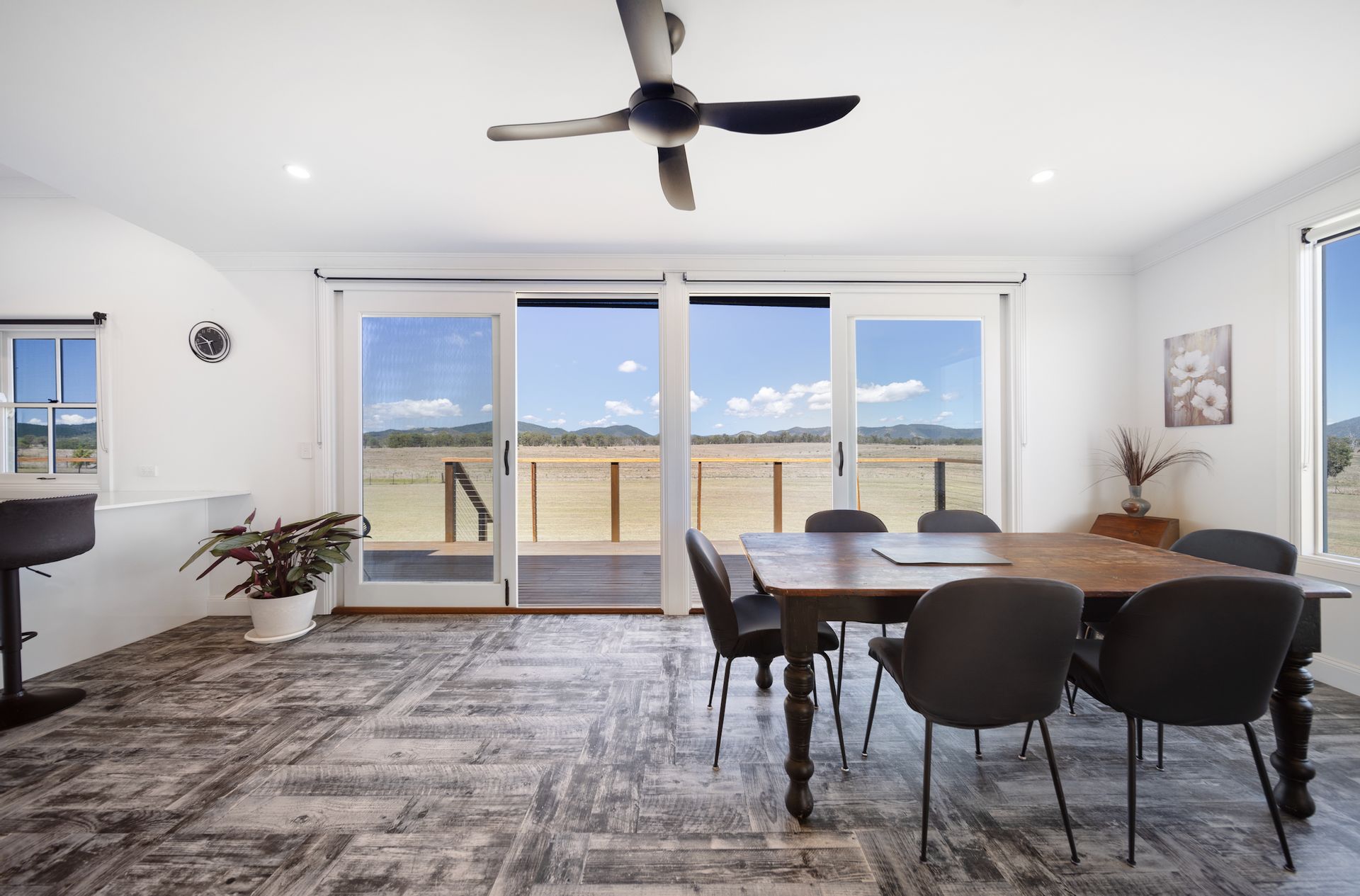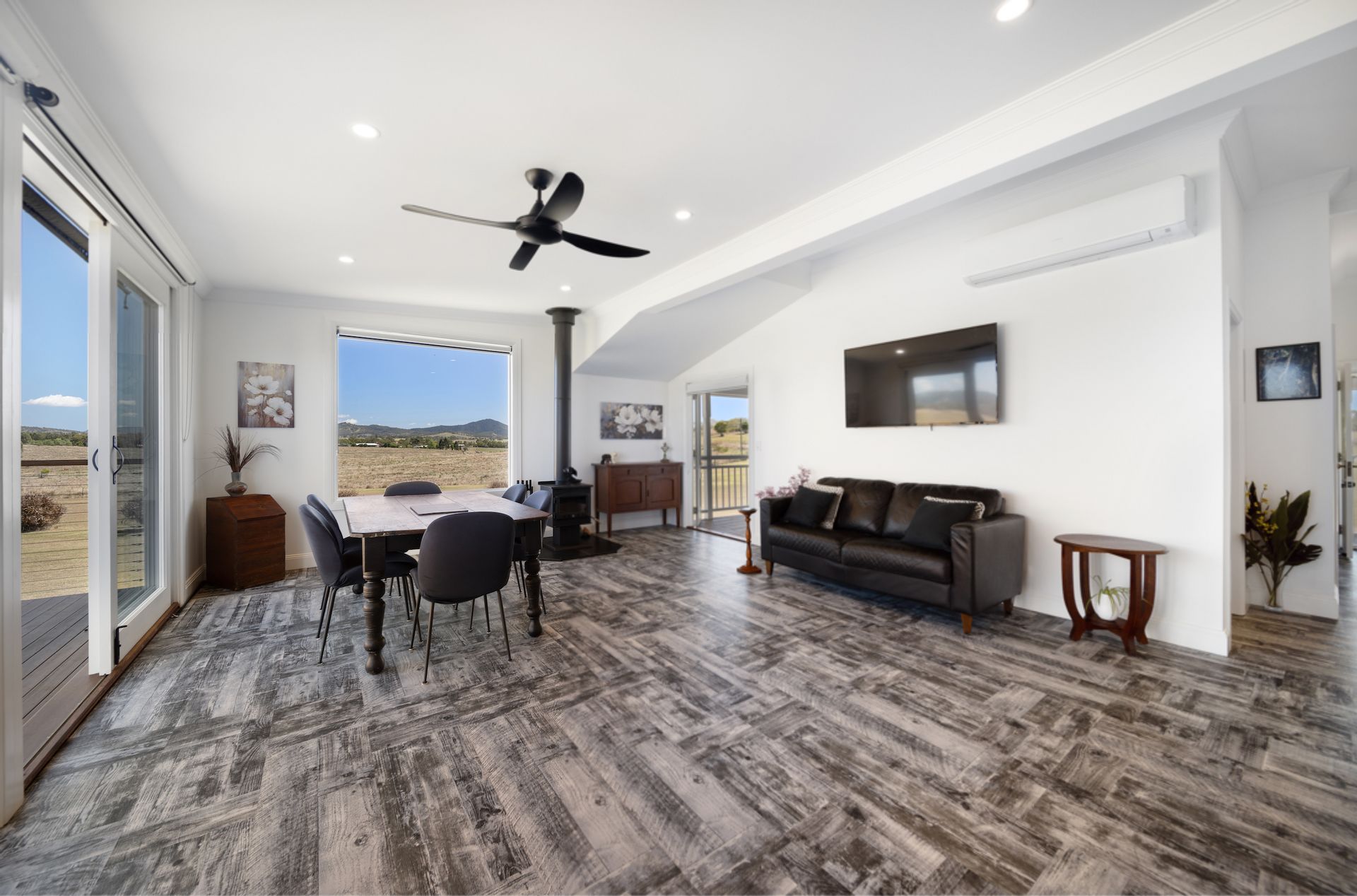 Set on a fully fenced 4.5-acre block, the property combines rustic charm with modern amenities, ensuring privacy and space. The home features an open-plan living area filled with natural light, complete with air conditioning and a cozy lounge room equipped with a fireplace for cooler evenings. The modern kitchen is designed for convenience and style, boasting a gas cooktop, dishwasher, double-door fridge bay, and a butler's pantry.