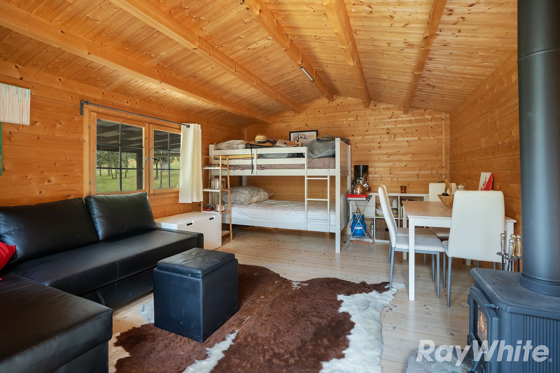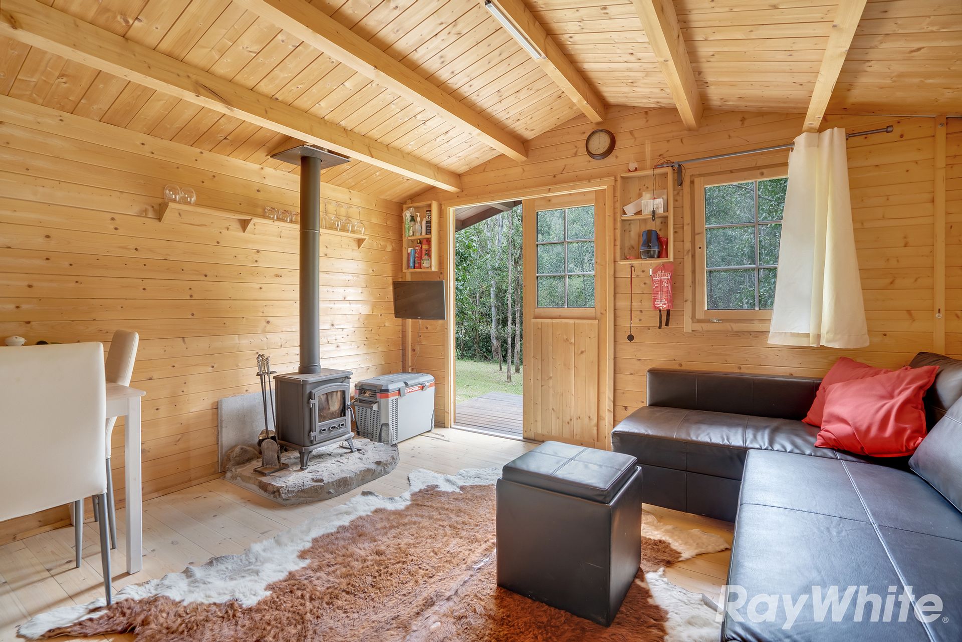 • Comfortable Cabin: A studio-style cabin features a wood fire, connected to a 3,000L water tank, a 135 amp battery for power, and a compost toilet