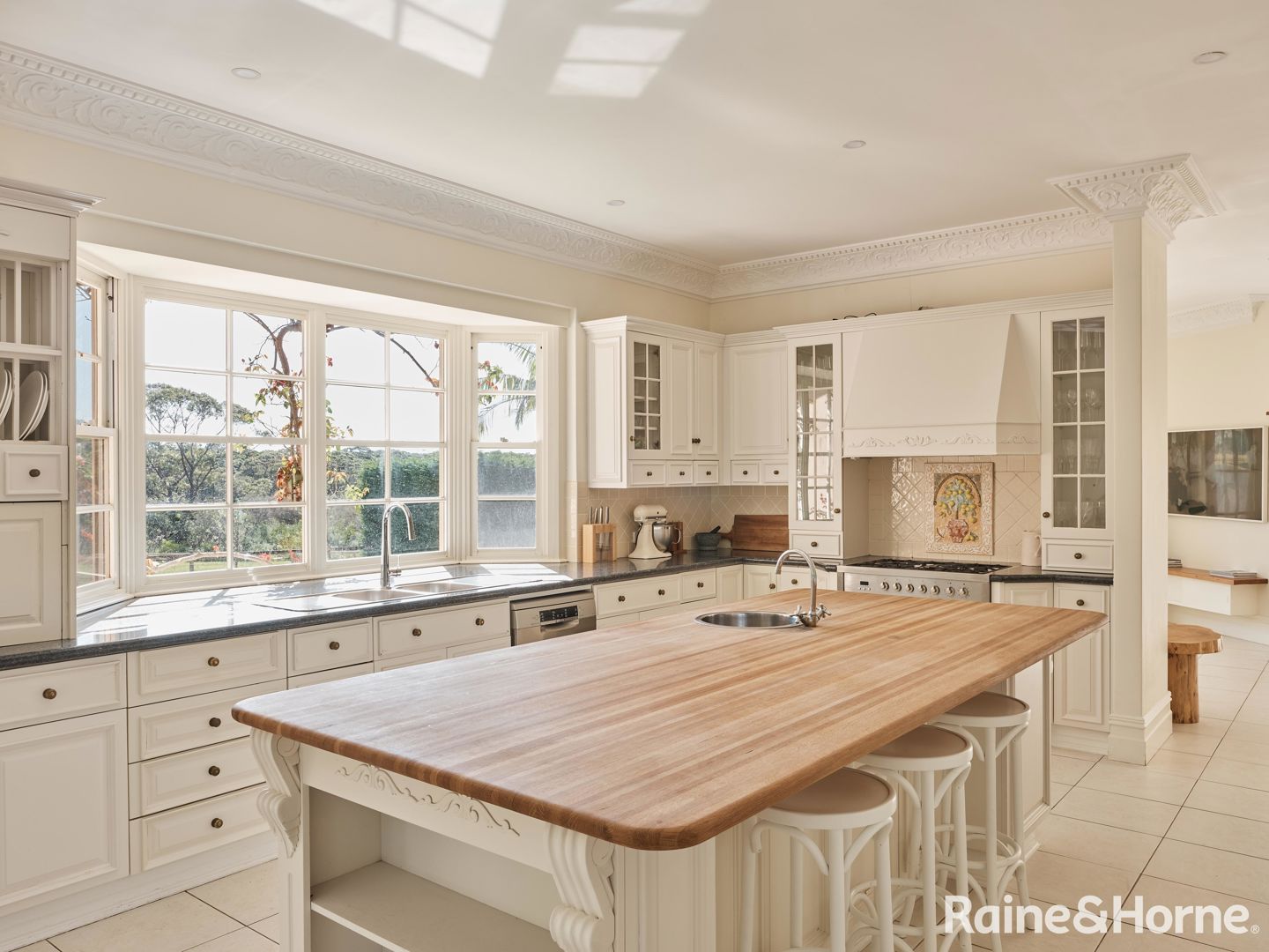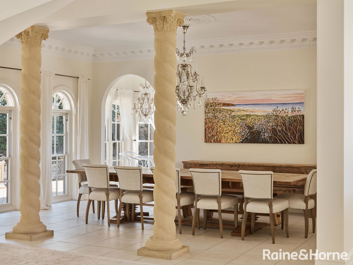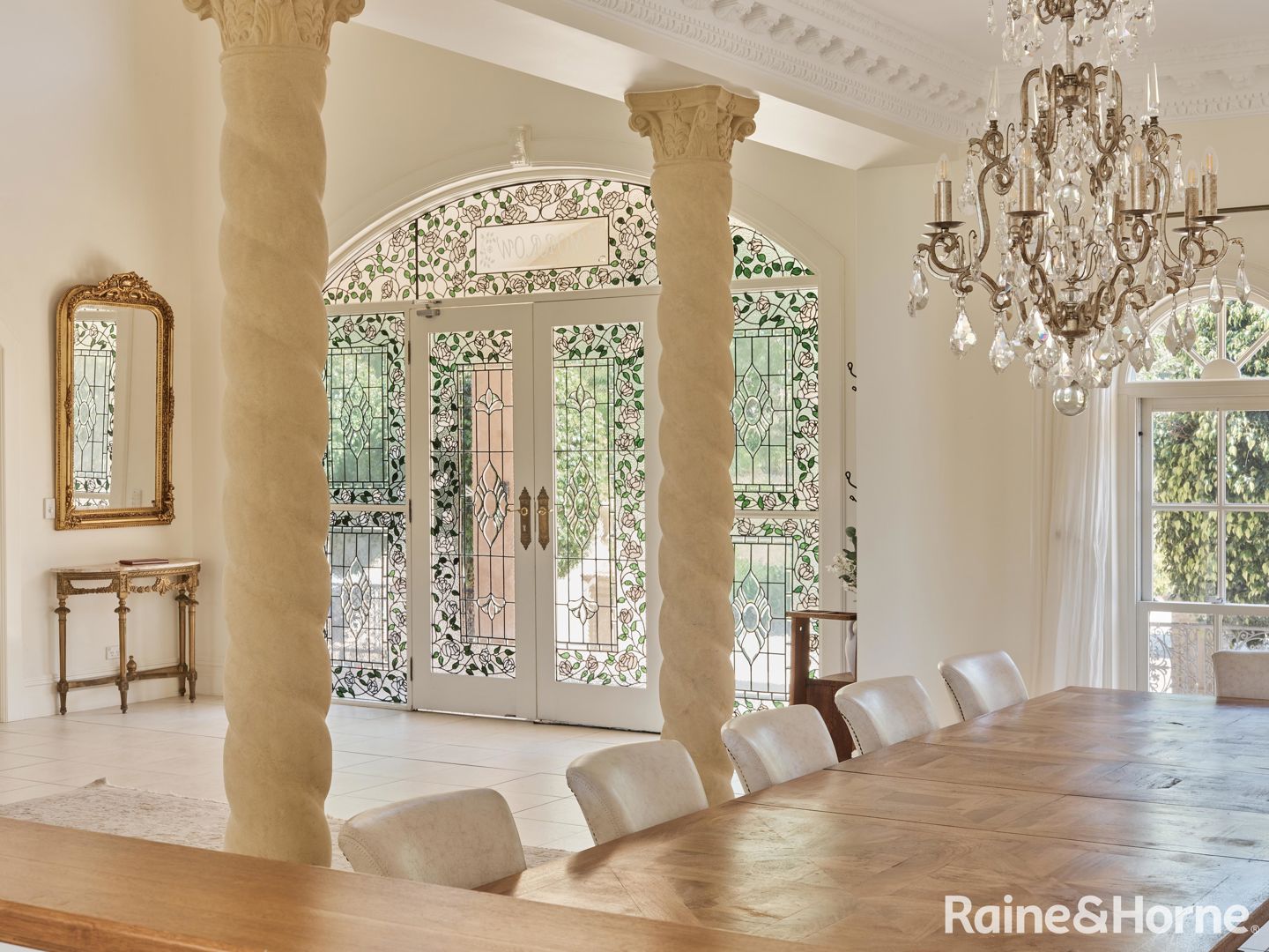 The centrepiece of this coastal estate is the grand 7-bedroom French provincial residence, master-built by the owner and architecturally designed to offer over 800m2 of luxurious living. Upon entering, you are greeted by a spectacular entrance foyer adorned with stained glass, a crystal chandelier, and a sweeping staircase setting the tone that flows into both formal and informal living spaces, perfect for entertaining.