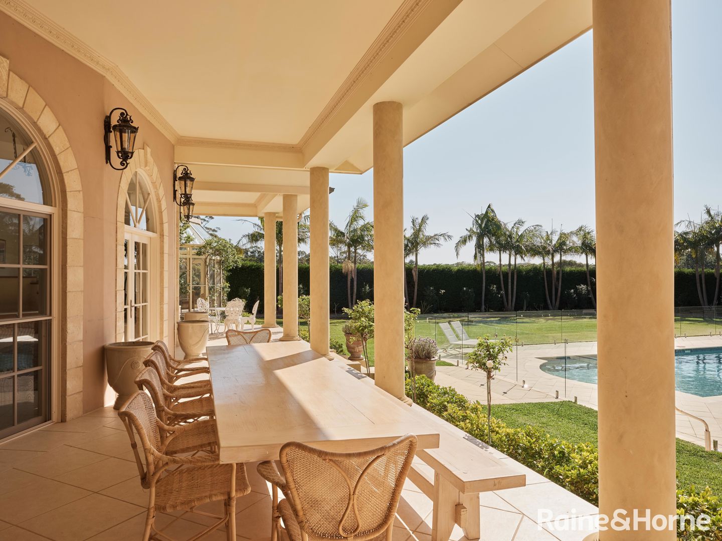 * Expansive outdoor terrace overlooking the heated saltwater pool and spa, surrounded by limestone tiles