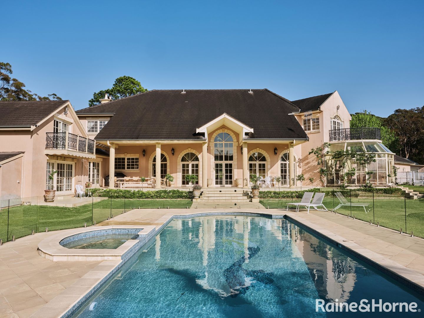 * Luxurious master suite with walk-in robe, wet bar, an expansive open ensuite with freestanding bath, and private balcony overlooking the pool with a north-easterly aspect