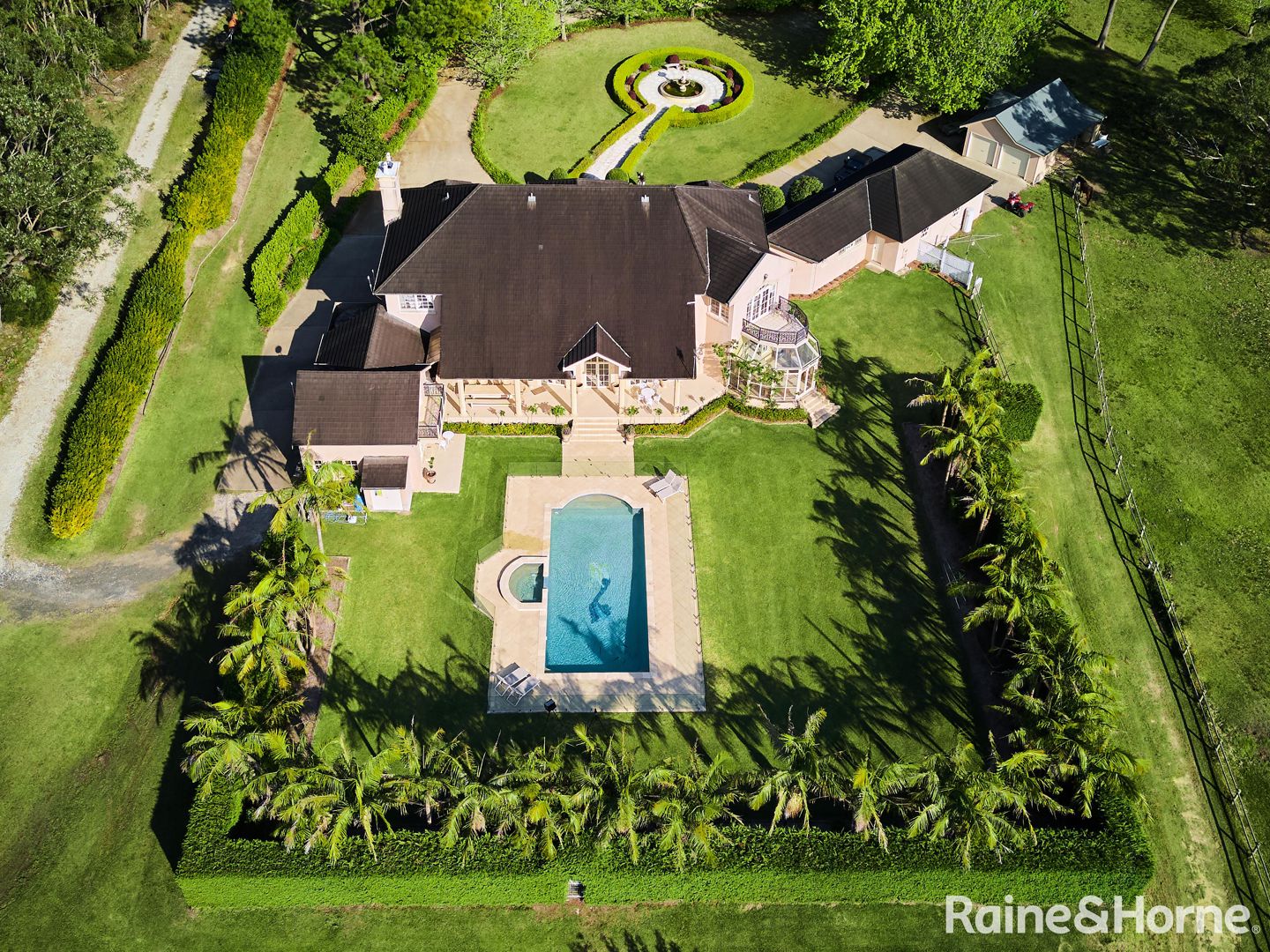 The estate's grandeur extends beyond the home. As you approach, the landscape transforms into a picturesque scene, with a maple tree-lined driveway leading you past manicured gardens and a stunning water fountain, creating a magnificent and graceful entrance. Spread across more than 20 acres, the estate features a four-car garage, a heated pool and spa, stables, a nine-hole bush golf course, a 20x10m shed with a caretaker's residence, and additional garaging for golf carts and ATVs. Olive trees, a small dam and vegetable gardens further enhance the property's charm.