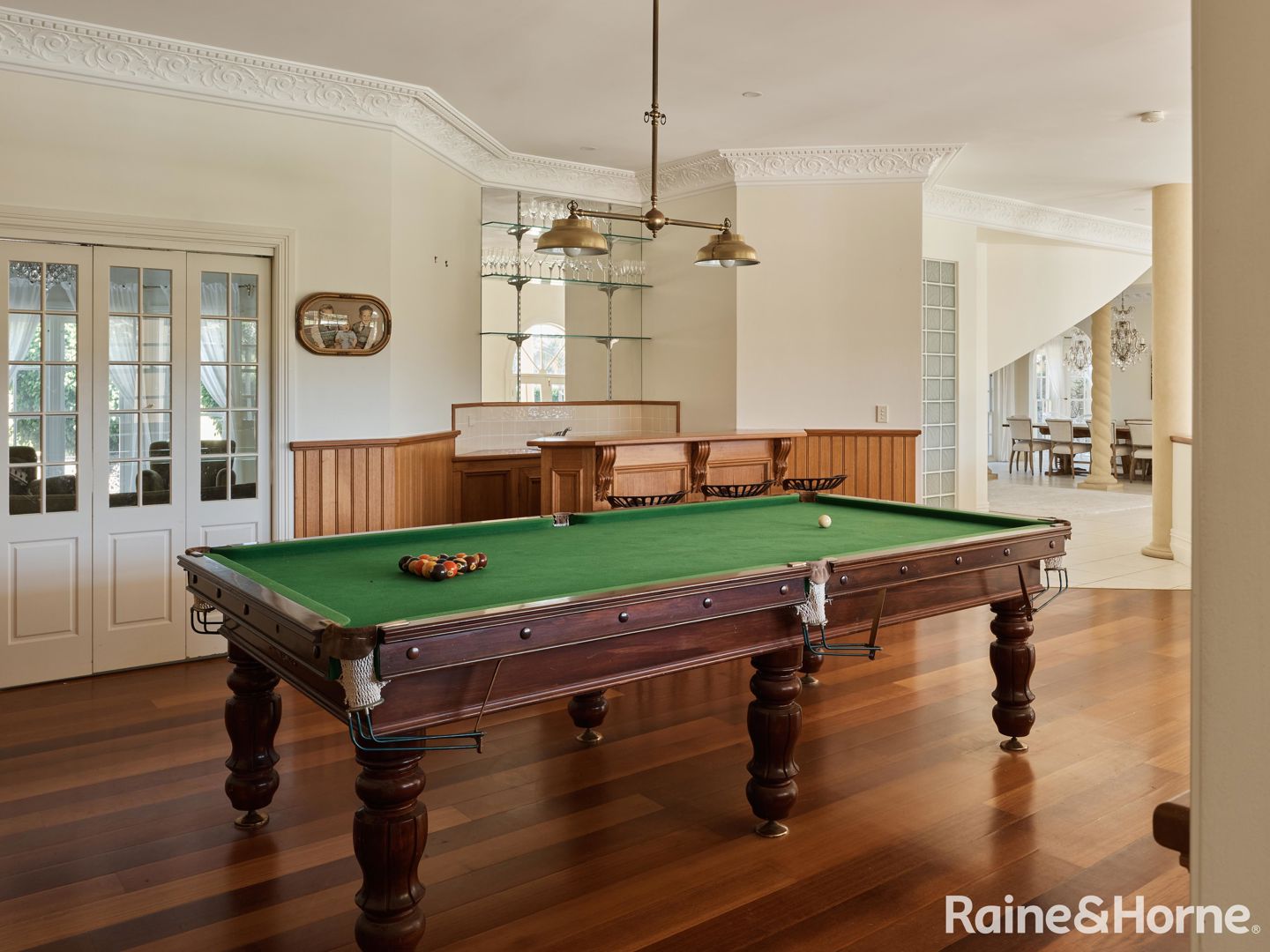 * Billiards room with bar, bench seating, and powder room