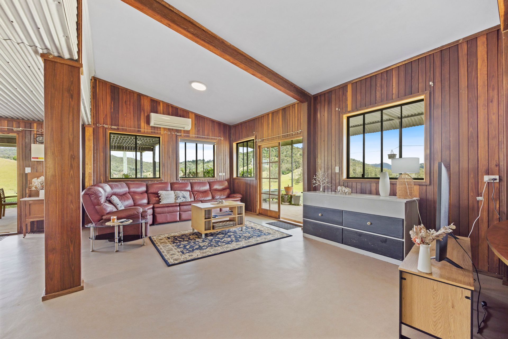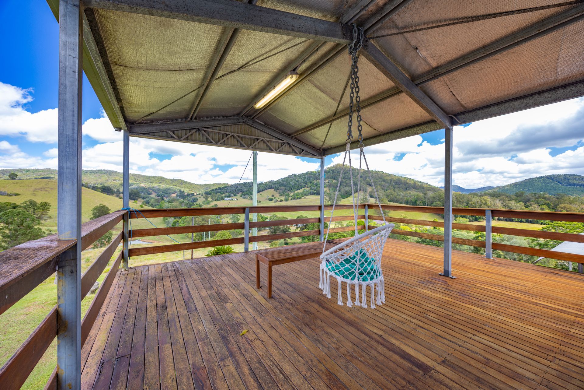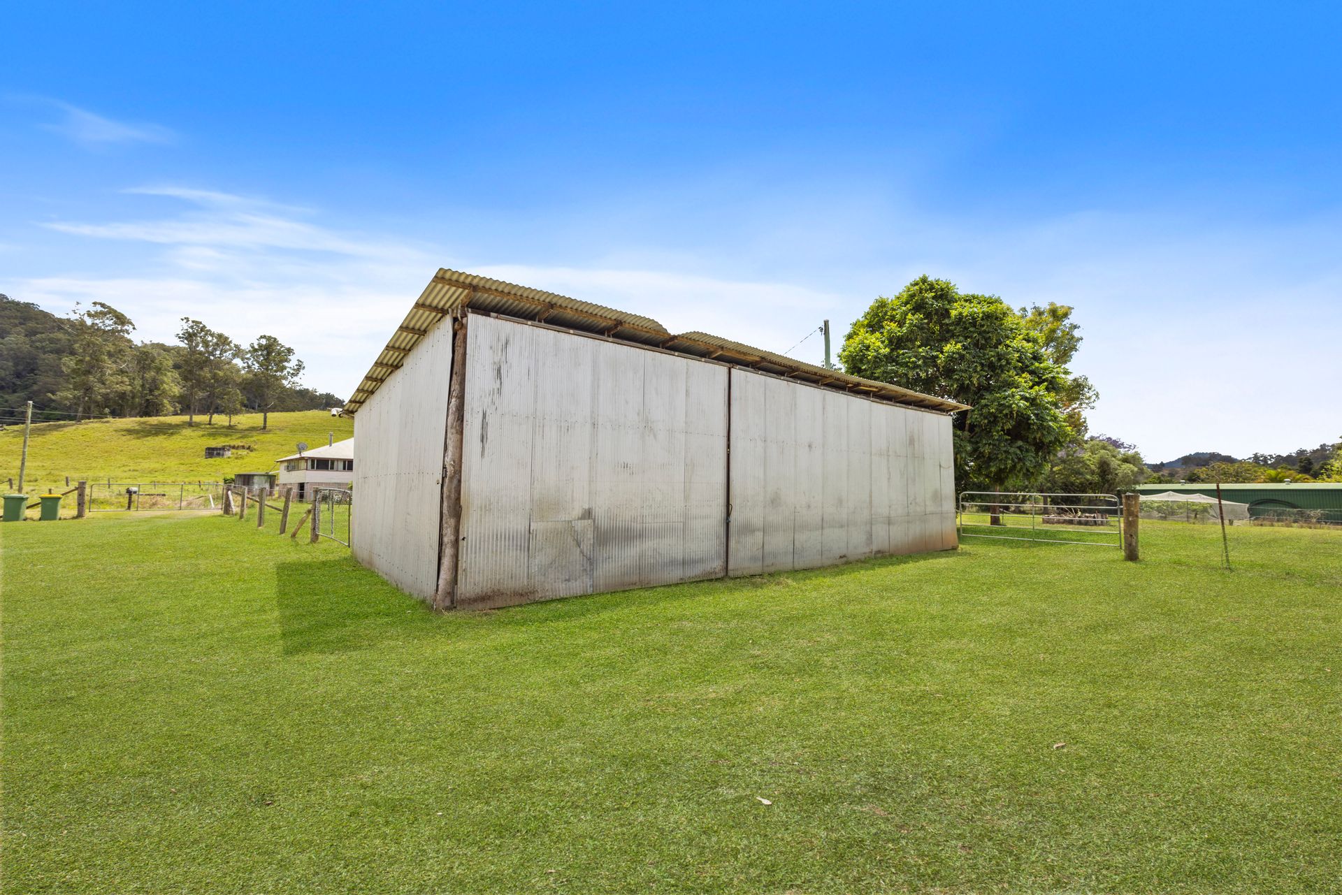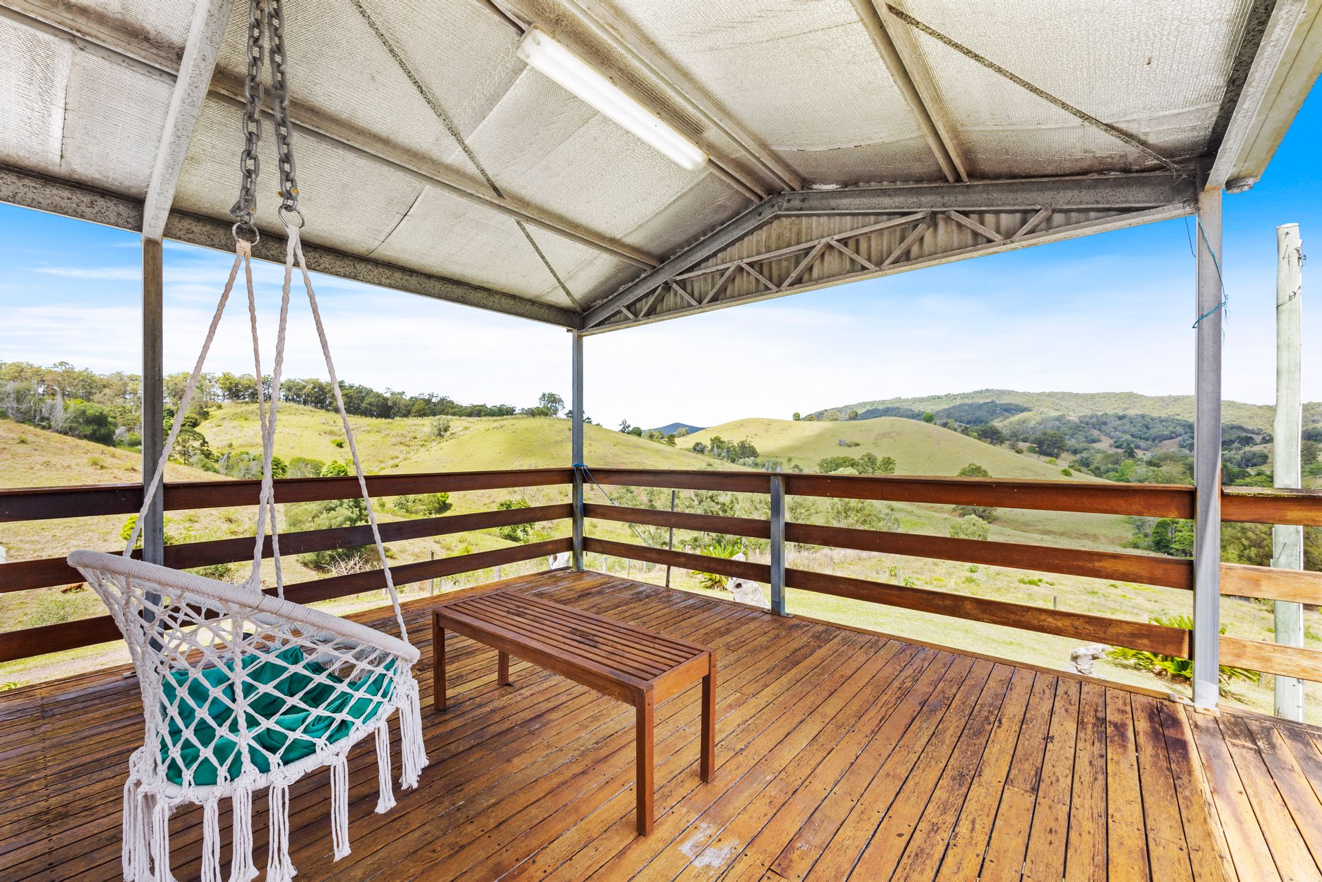 Arriving at this 131-acre property we noticed a herd of cattle happily dining on the green grass, we drove past a loading ramp, cattle yard and 2 big sheds, a massive dam and we were on the driveway to a unique home perched high on a hill. Arriving at the house it was hard not to be impressed with the stunning outlook from every angle. The home is spacious and has a rustic charm with a mix of warm timbers and corrugated internal finishes. Great fencing, multiple paddocks, another 2 dams, a spring-fed water hole and a selection of mature fruit trees all add to the appeal of this property.