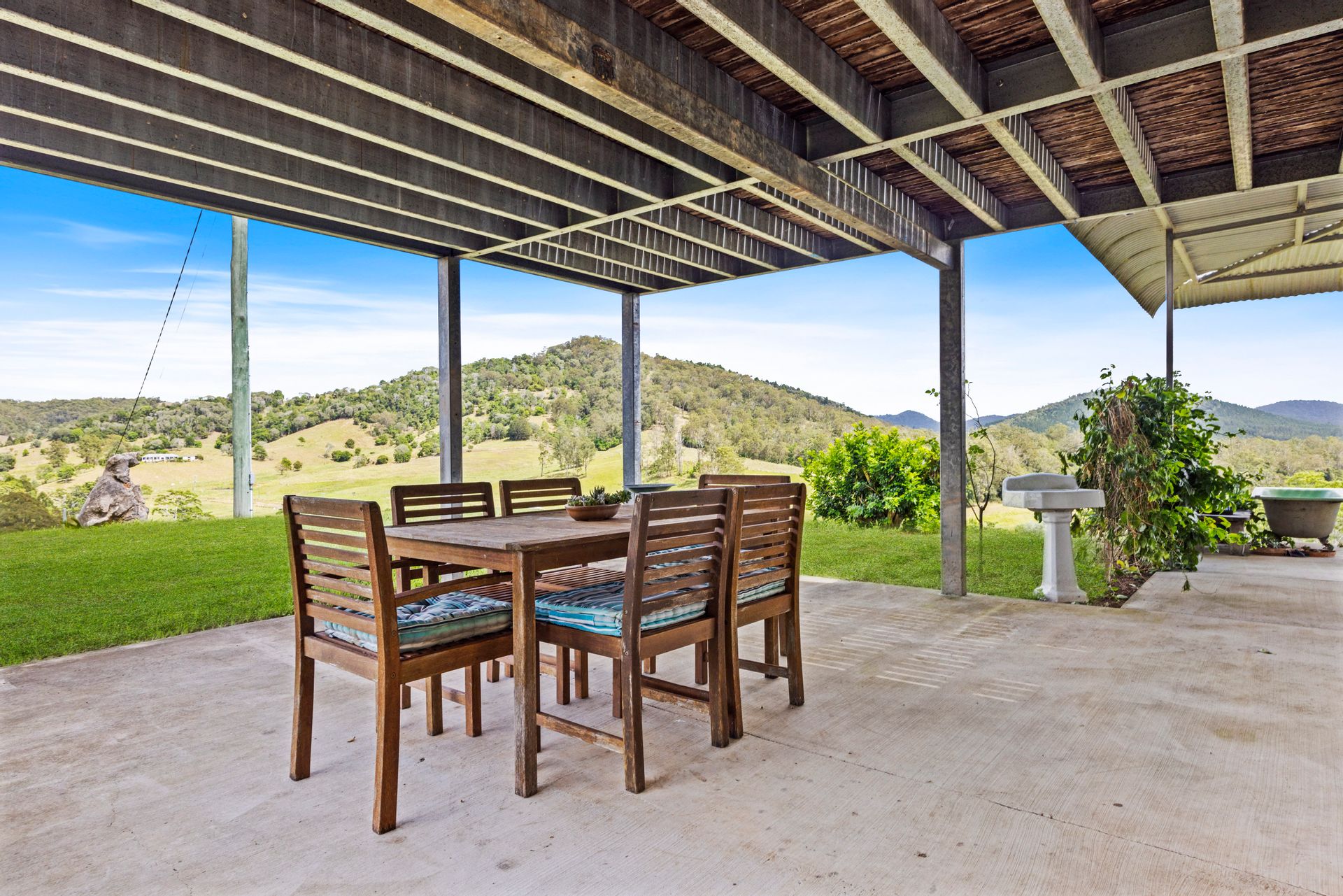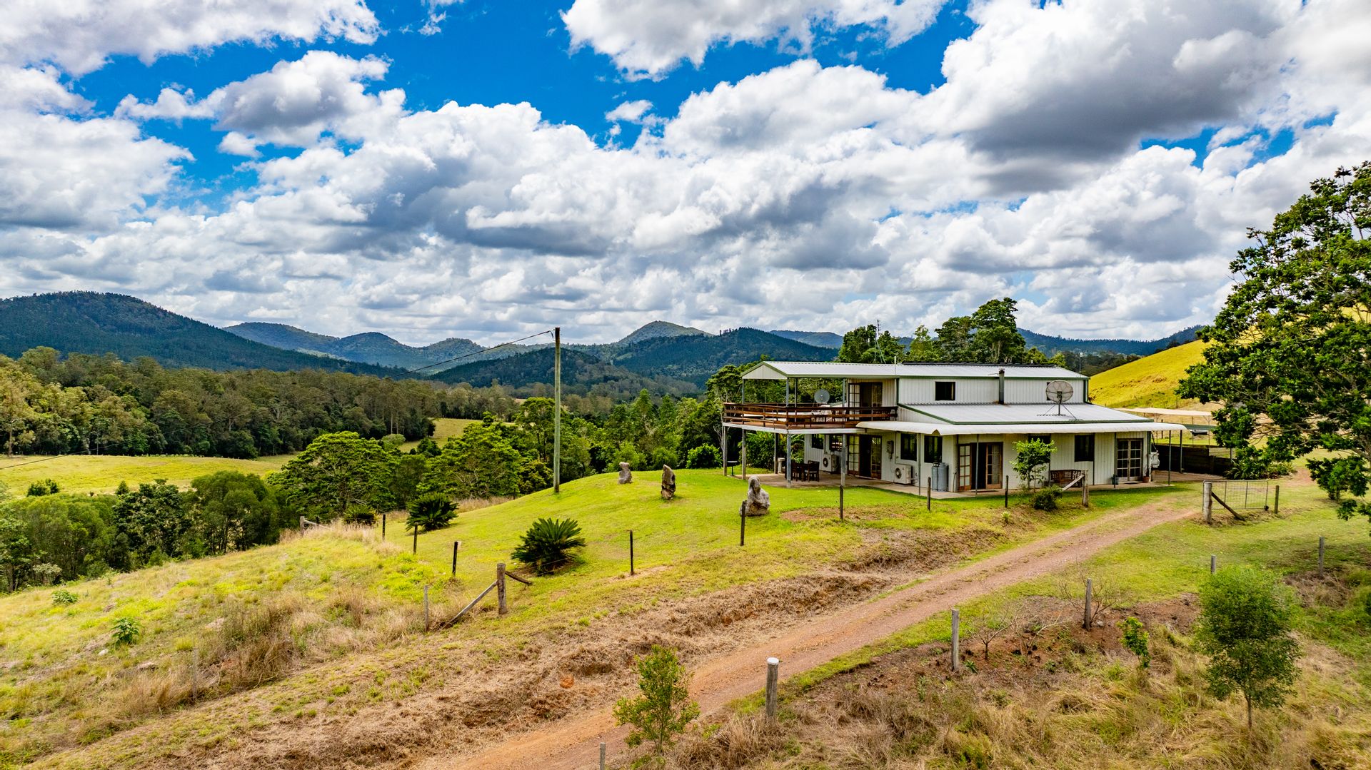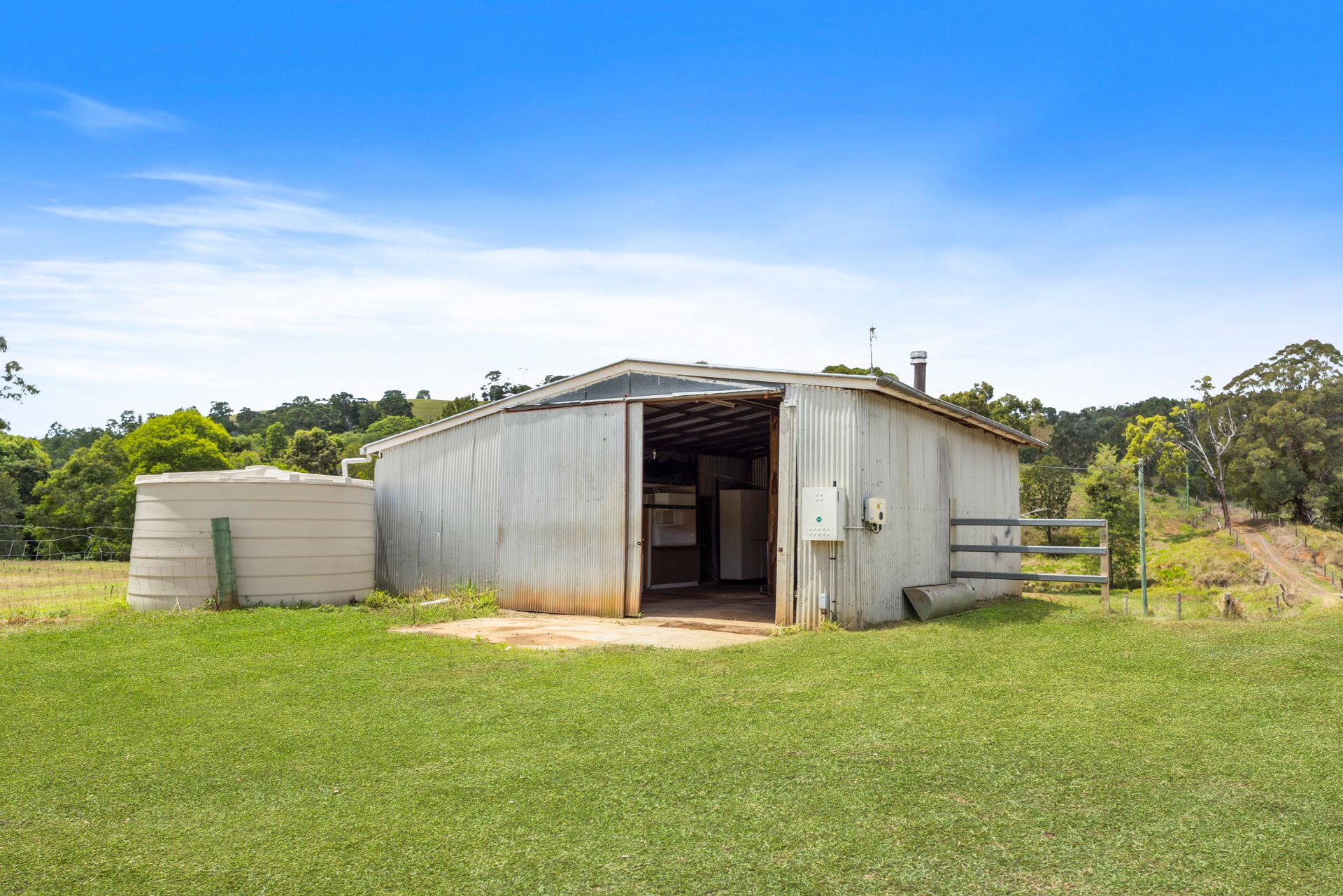 Arriving at this 131-acre property we noticed a herd of cattle happily dining on the green grass, we drove past a loading ramp, cattle yard and 2 big sheds, a massive dam and we were on the driveway to a unique home perched high on a hill. Arriving at the house it was hard not to be impressed with the stunning outlook from every angle. The home is spacious and has a rustic charm with a mix of warm timbers and corrugated internal finishes. Great fencing, multiple paddocks, another 2 dams, a spring-fed water hole and a selection of mature fruit trees all add to the appeal of this property.