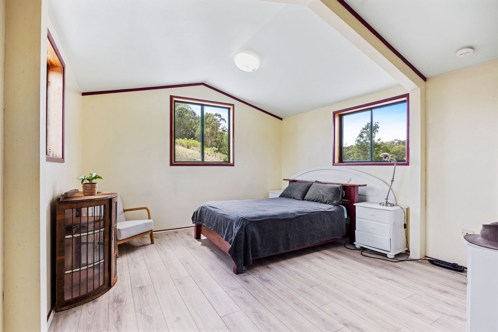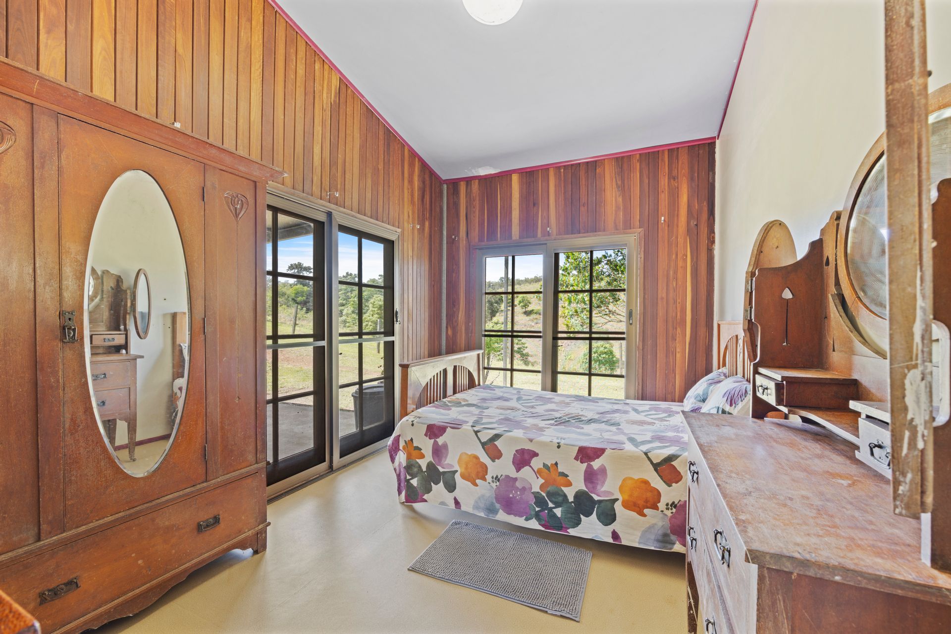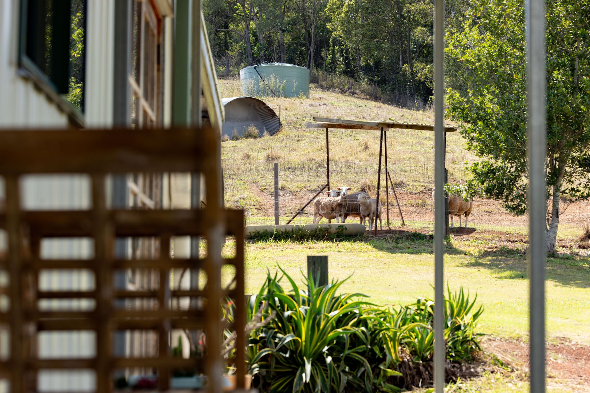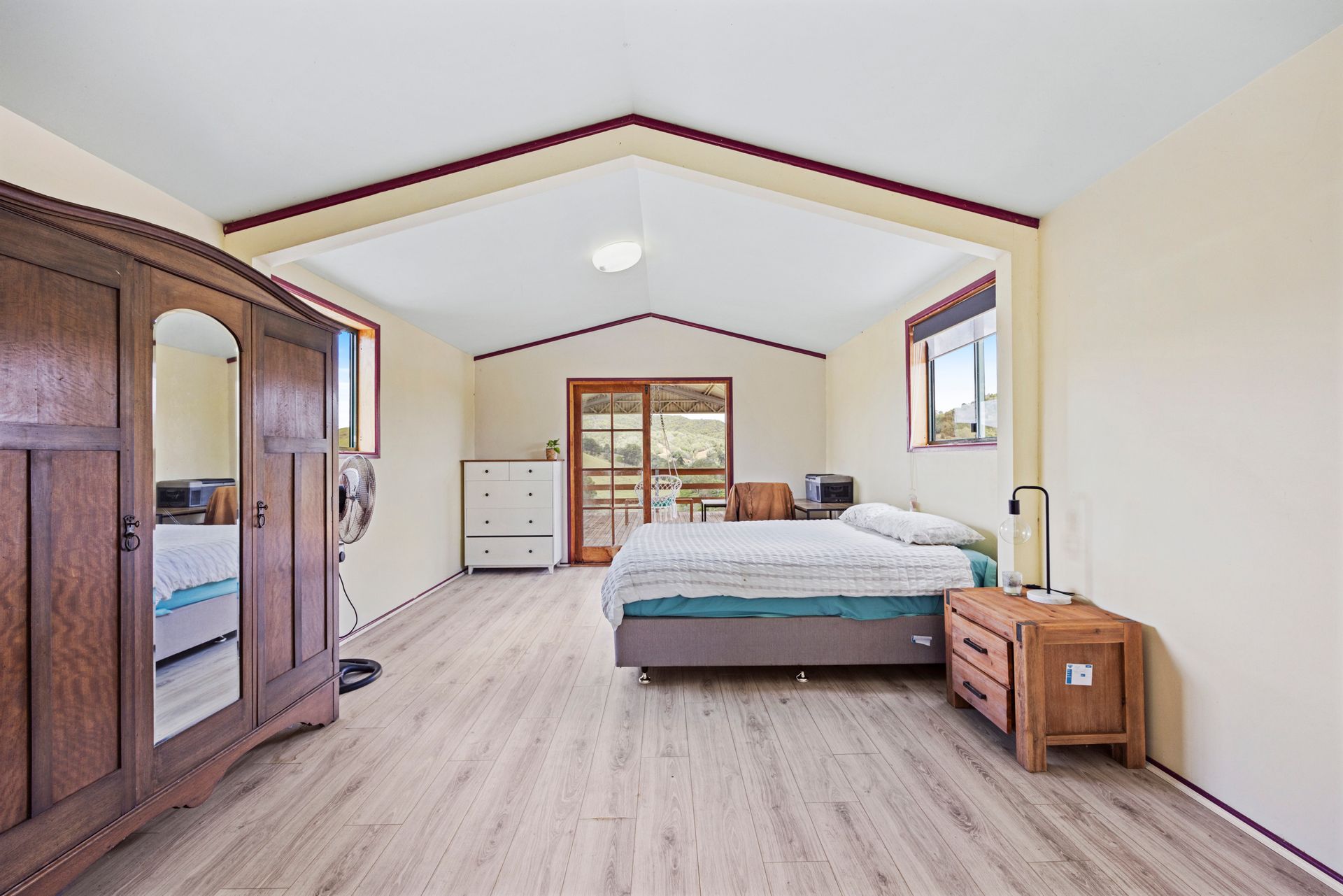 Arriving at this 131-acre property we noticed a herd of cattle happily dining on the green grass, we drove past a loading ramp, cattle yard and 2 big sheds, a massive dam and we were on the driveway to a unique home perched high on a hill. Arriving at the house it was hard not to be impressed with the stunning outlook from every angle. The home is spacious and has a rustic charm with a mix of warm timbers and corrugated internal finishes. Great fencing, multiple paddocks, another 2 dams, a spring-fed water hole and a selection of mature fruit trees all add to the appeal of this property.