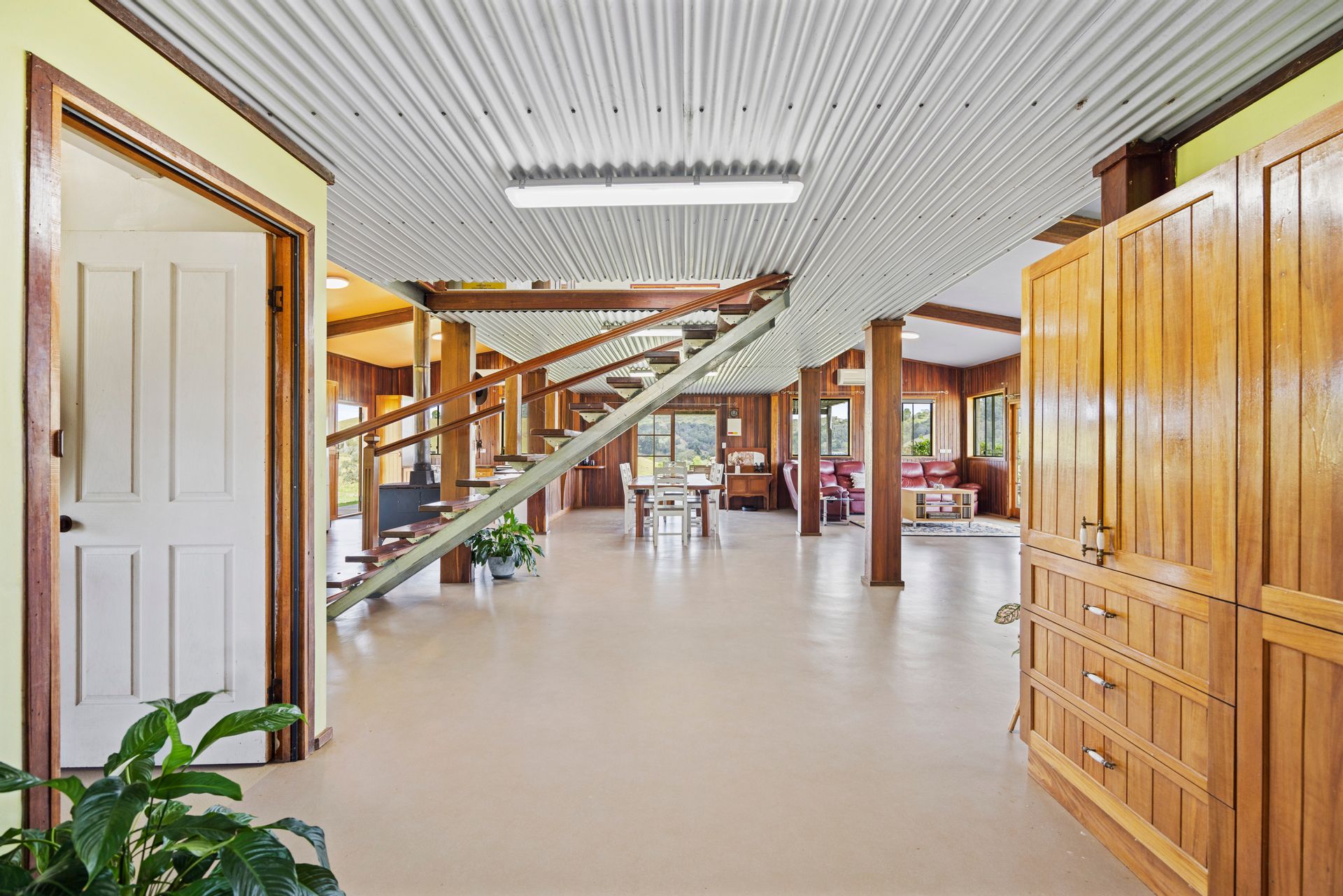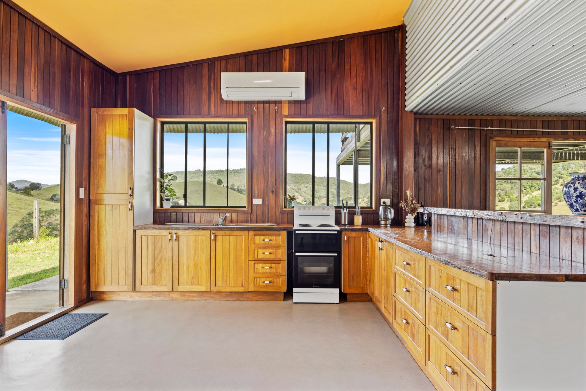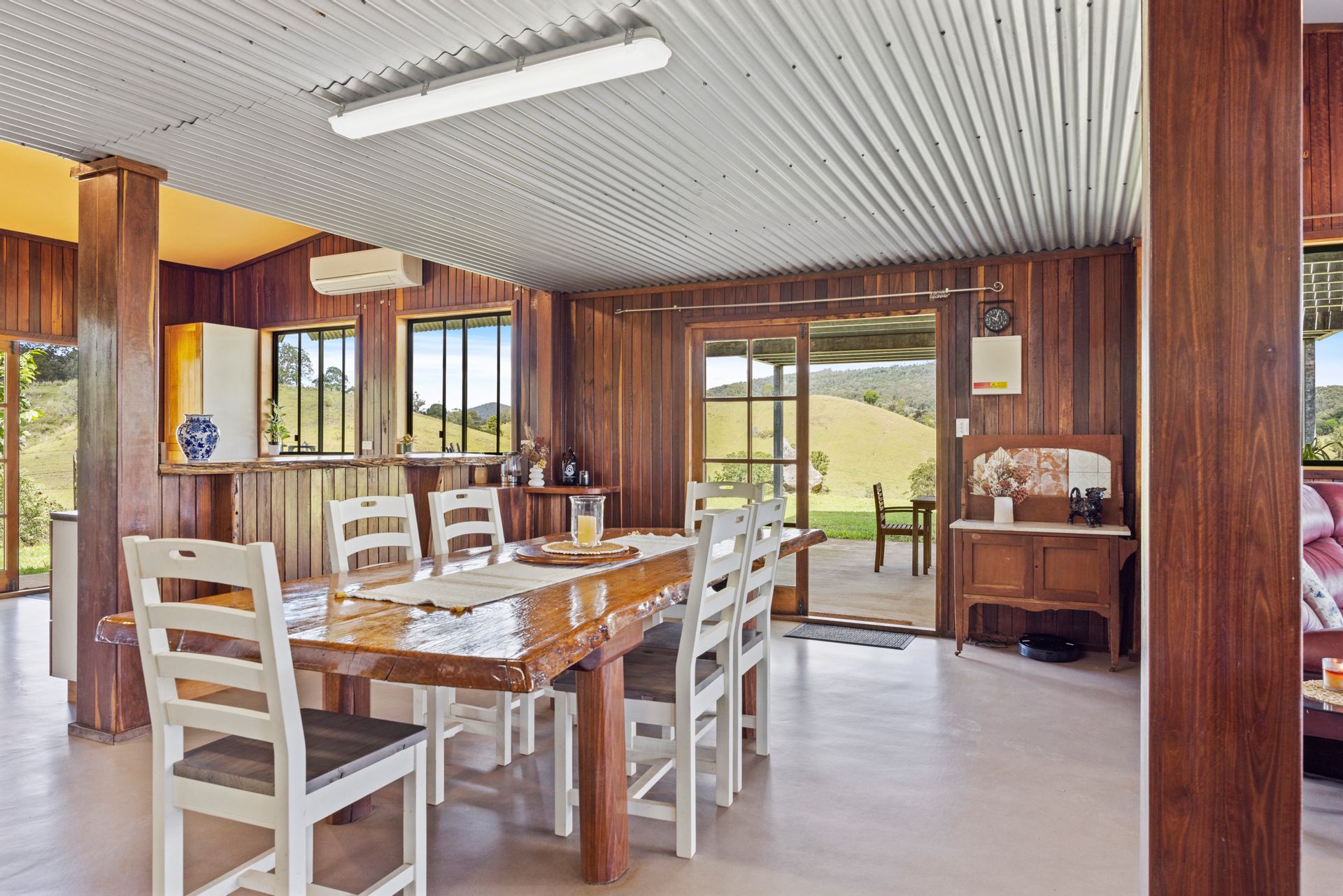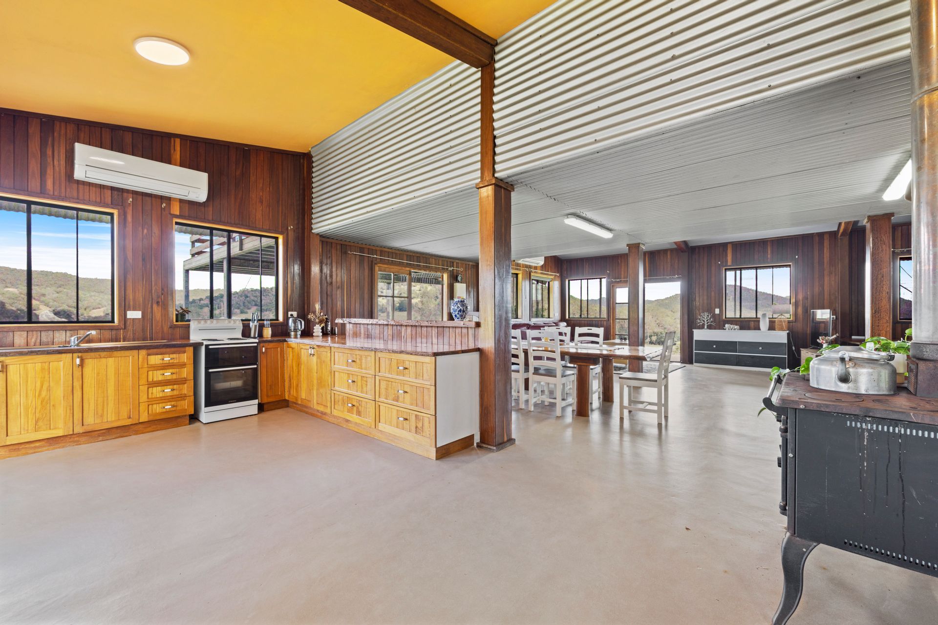 • Downstairs you will find the massive open plan kitchen, dining, & living areas with timber & corrugated iron accents, this area has French doors leading from each side of the home bringing the beauty of the outside in and creating a lovely flow to the covered patio & verandahs, here you will find 2 reverse cycle air conditioners & a combustion stove to keep you warm on those fresh winter nights