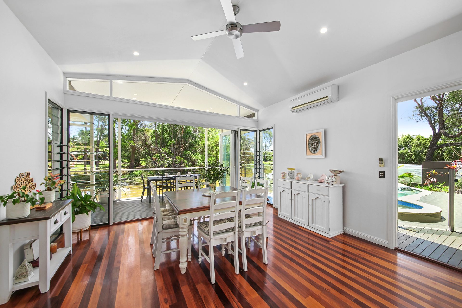 Three additional bedrooms, all with built-ins, are well-sized and share a contemporary main bathroom, with the laundry conveniently located nearby. Step outside and enjoy the resort-style in-ground pool and spa, ideal for cooling off on warm Sunshine Coast days.
