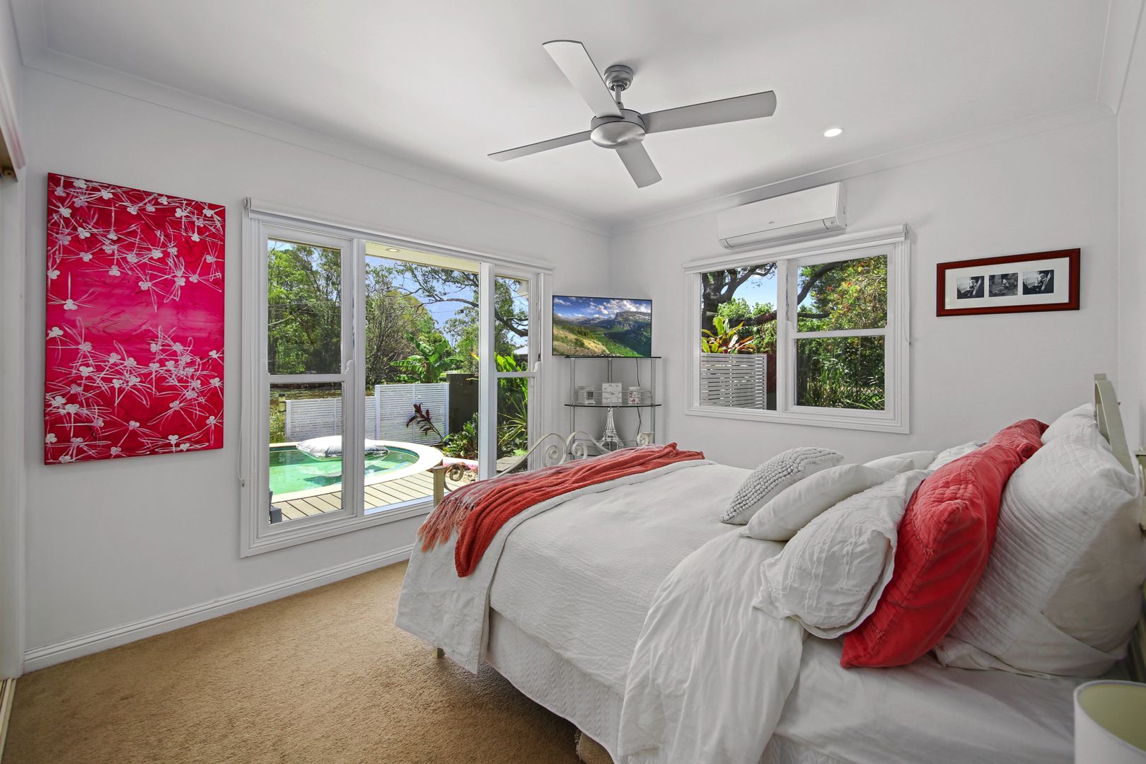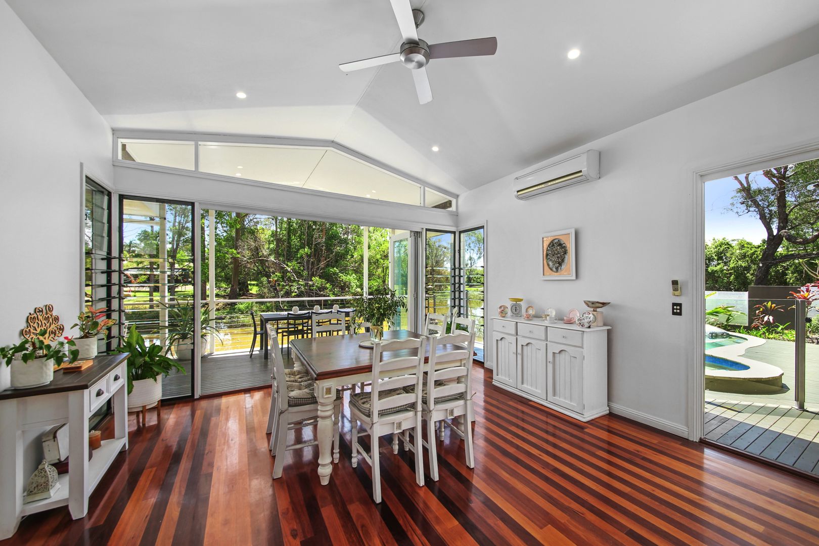 Three additional bedrooms, all with built-ins, are well-sized and share a contemporary main bathroom, with the laundry conveniently located nearby. Step outside and enjoy the resort-style in-ground pool and spa, ideal for cooling off on warm Sunshine Coast days.