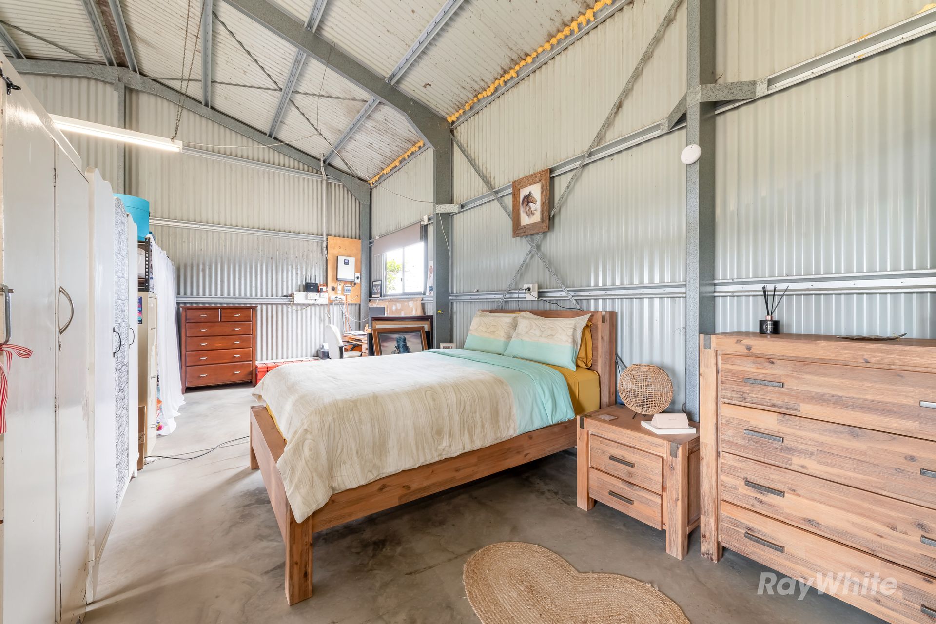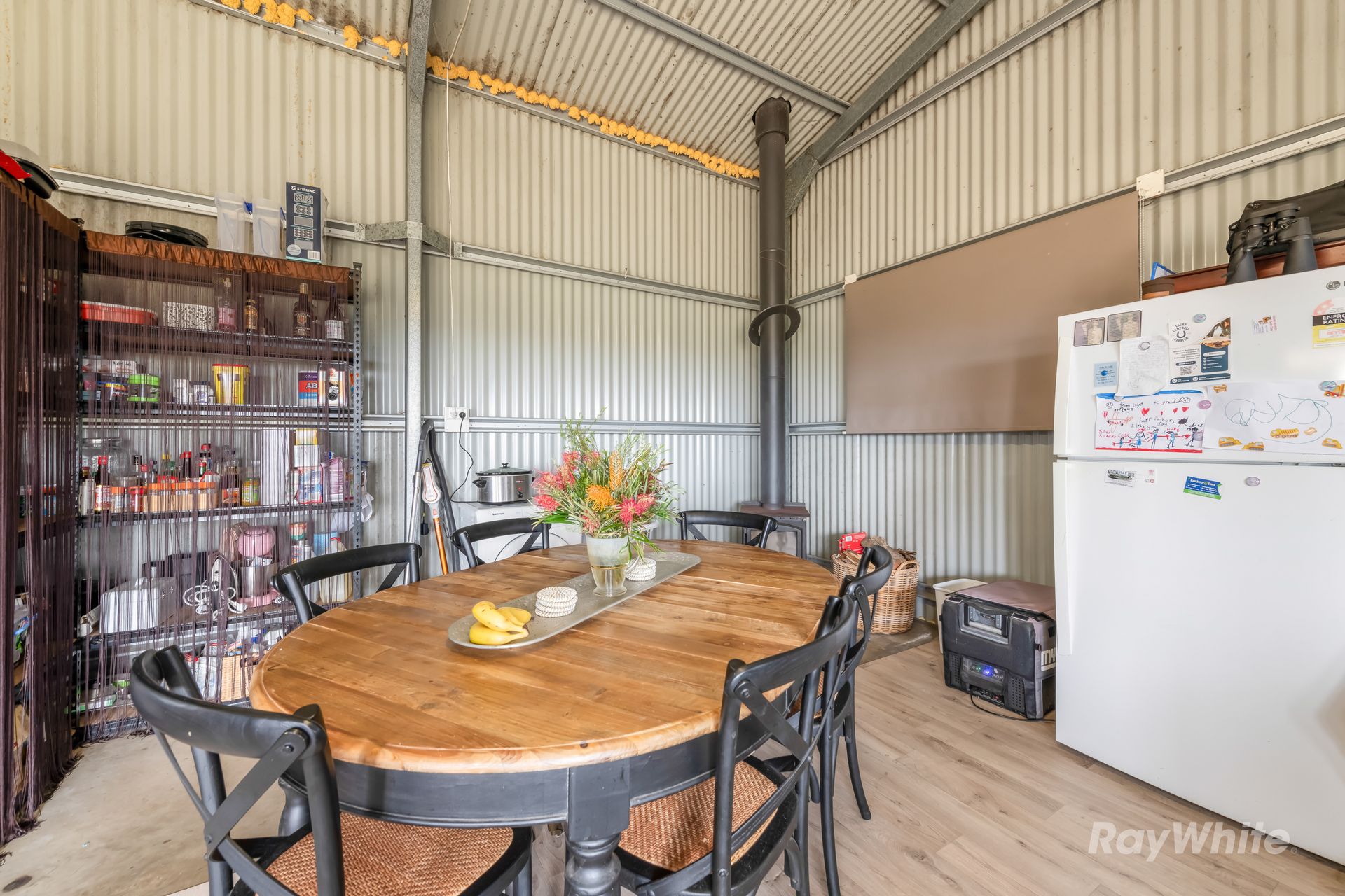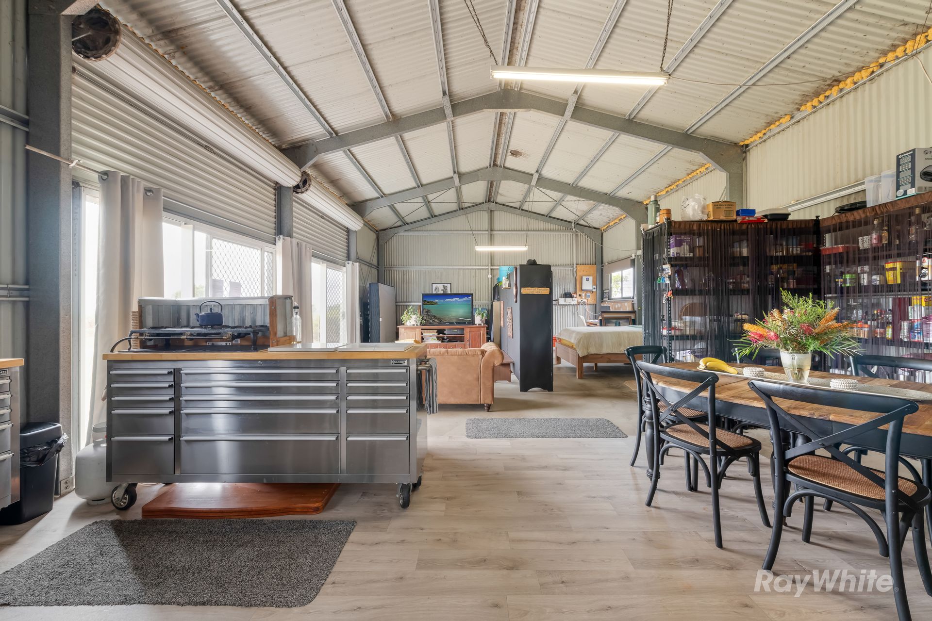 The residence is a cozy, council-approved 7m x 12m shed home with an open-plan layout, complete with a stainless steel kitchen, gas cooktop, dishwasher, and wood heater for those cool nights. The adjoining carport and storage container offer plenty of space for vehicles and tools, while the dog-proof fenced yard ensures your pets stay safe. An off-grid 7KVA solar system with 12 batteries powers the home, supported by a backup generator, ensuring sustainability and independence.