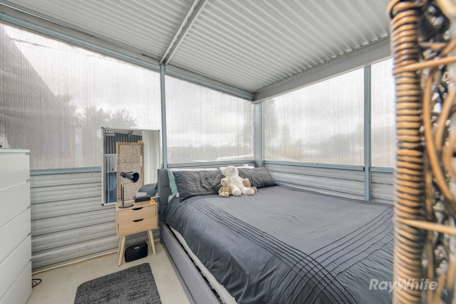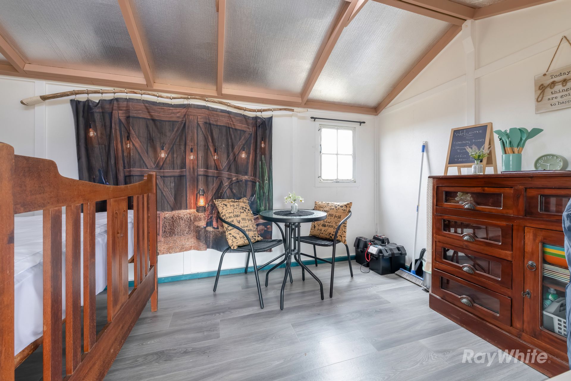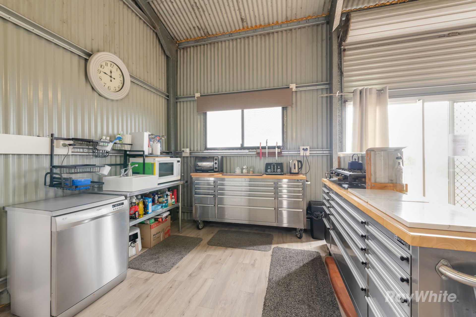 The residence is a cozy, council-approved 7m x 12m shed home with an open-plan layout, complete with a stainless steel kitchen, gas cooktop, dishwasher, and wood heater for those cool nights. The adjoining carport and storage container offer plenty of space for vehicles and tools, while the dog-proof fenced yard ensures your pets stay safe. An off-grid 7KVA solar system with 12 batteries powers the home, supported by a backup generator, ensuring sustainability and independence.